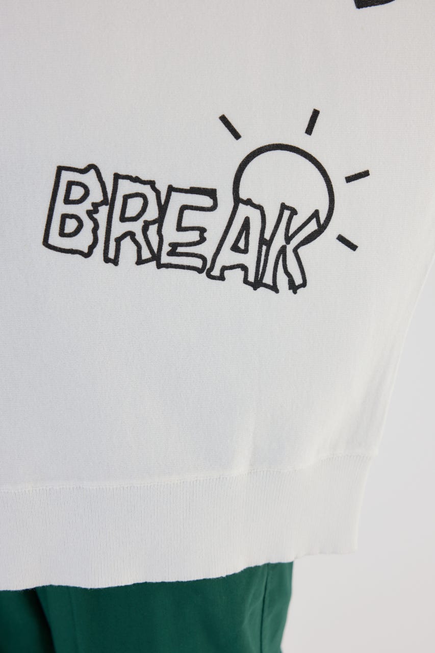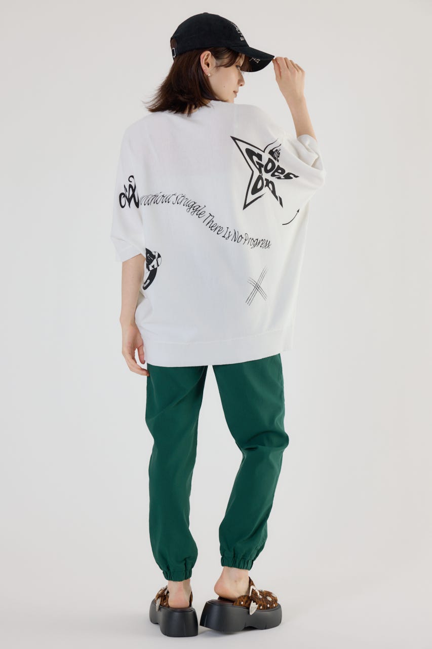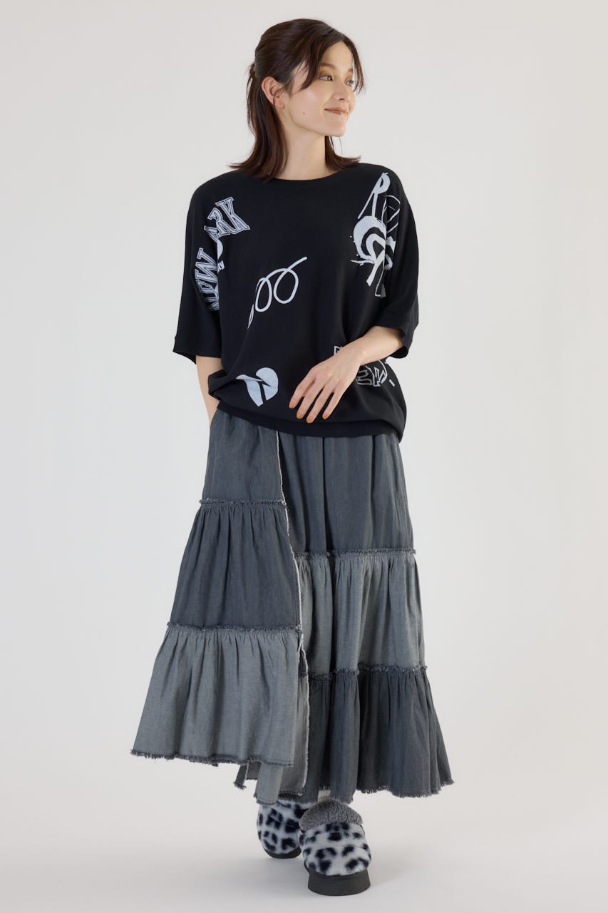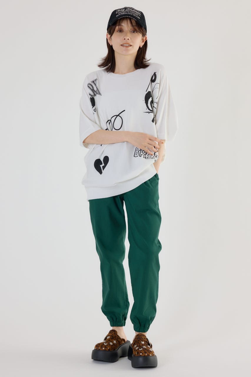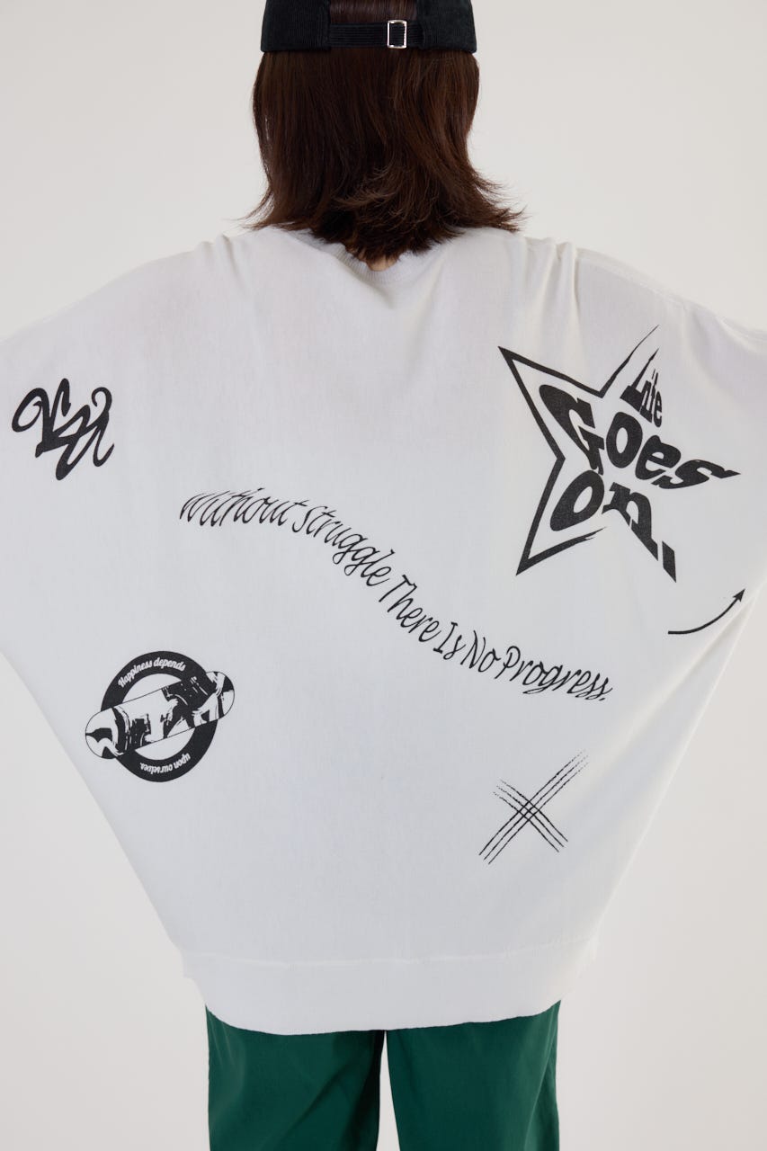 モチーフがランダムに散りばめられたドルマン型ニットトップス。