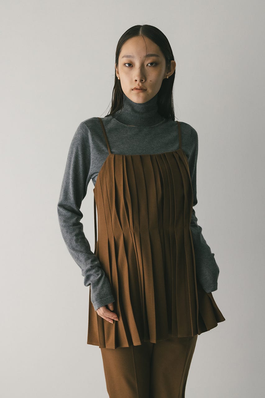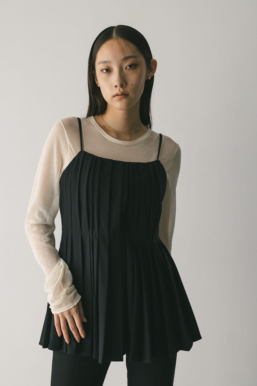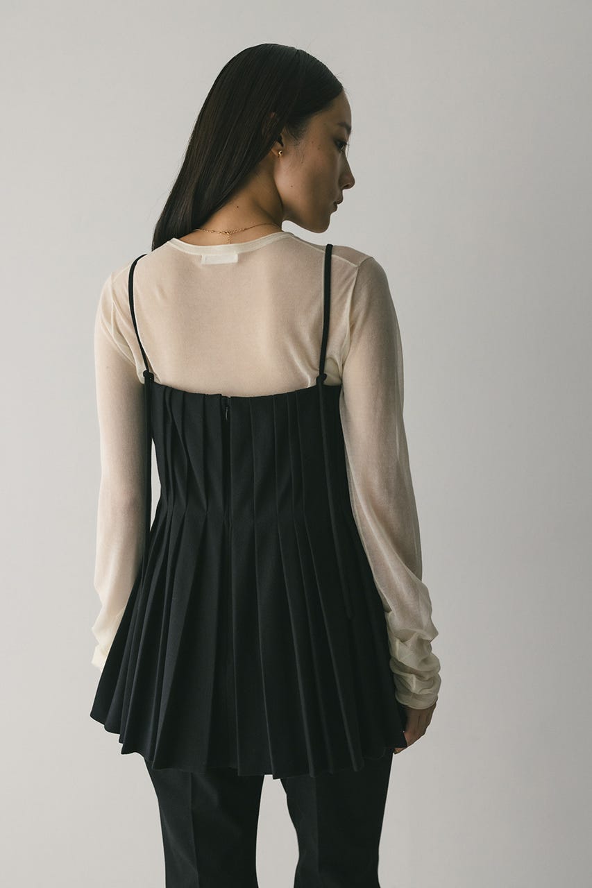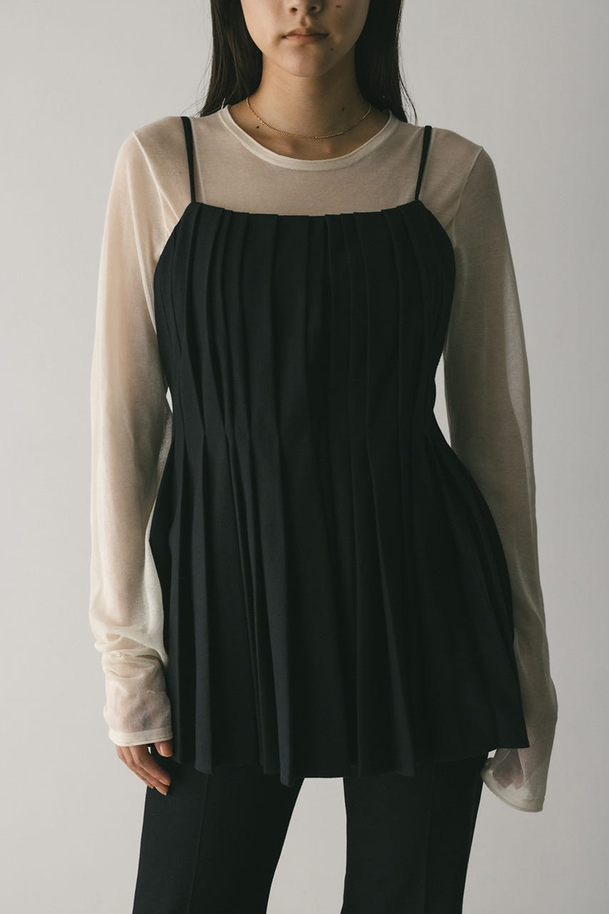 ランダムにタッキングしたデザインがポイントのペプラムキャミトップ。
