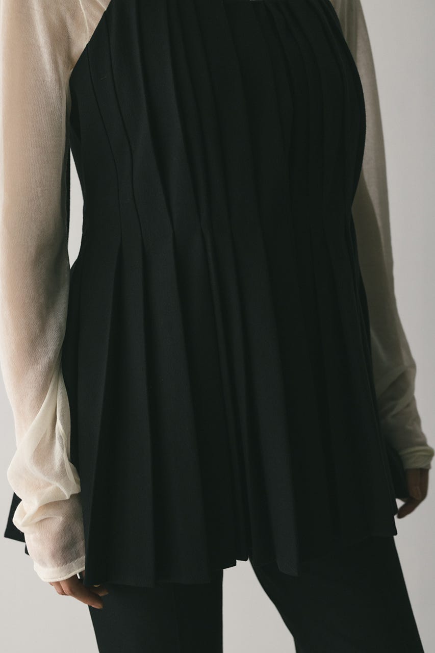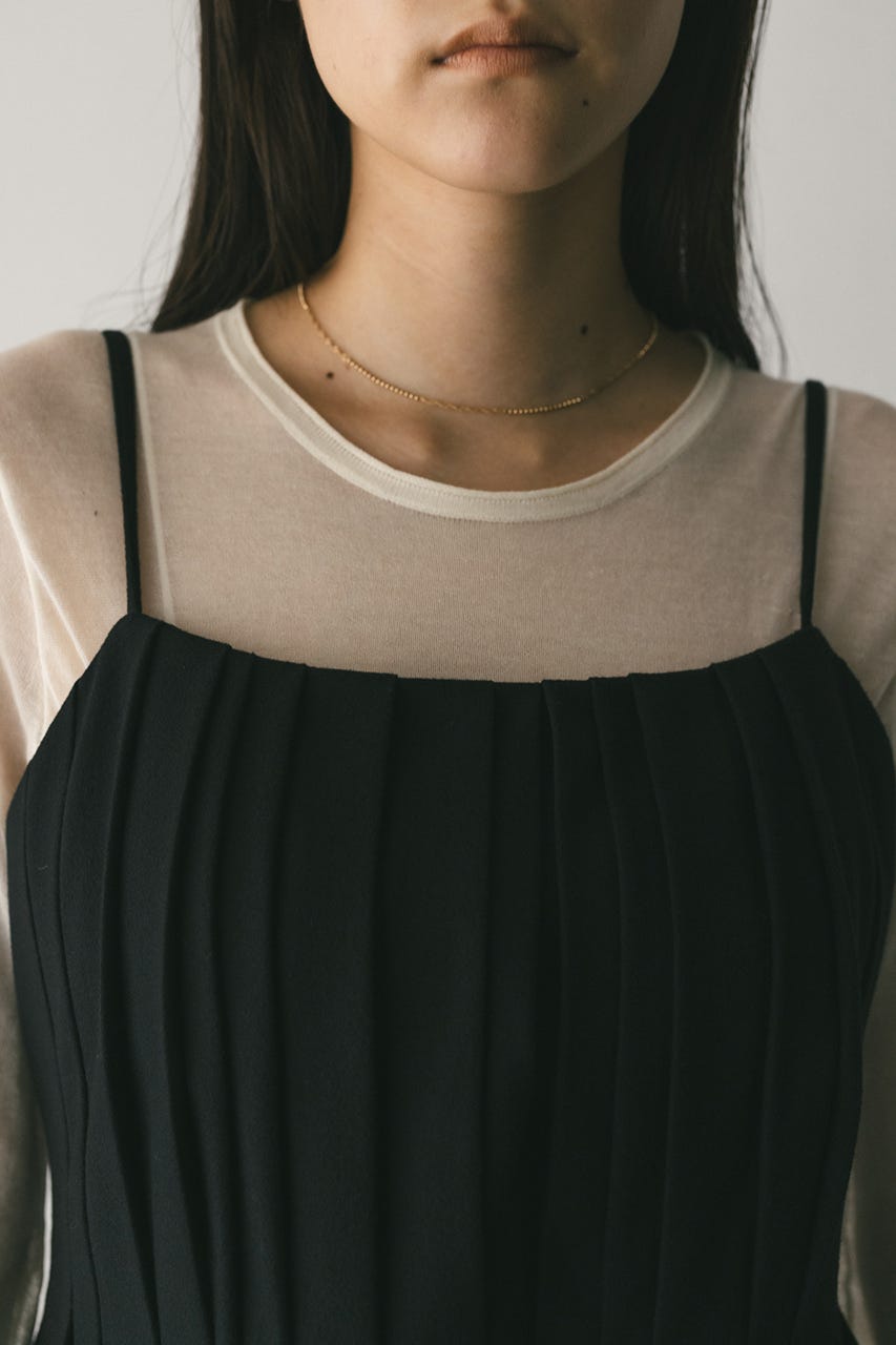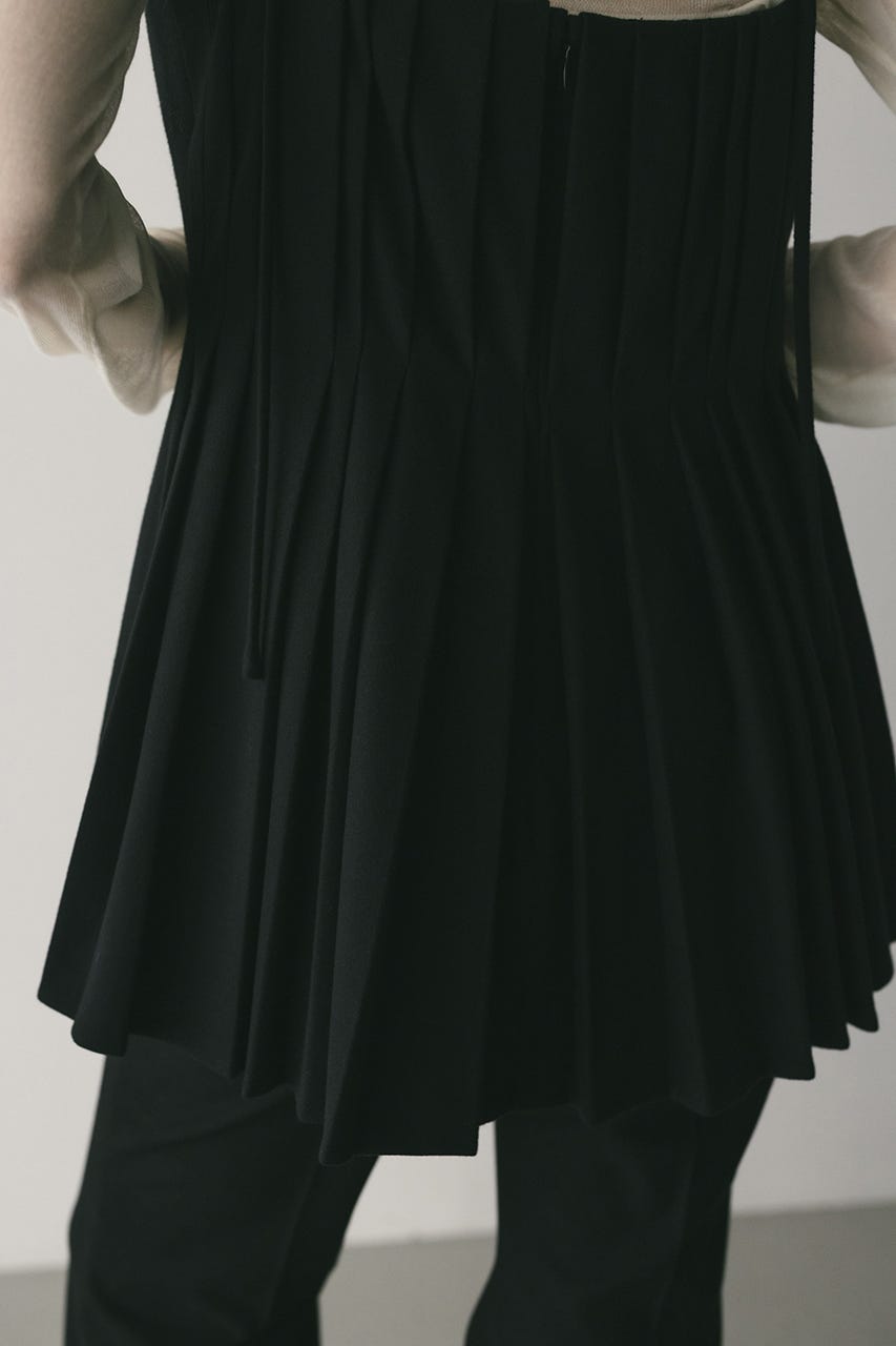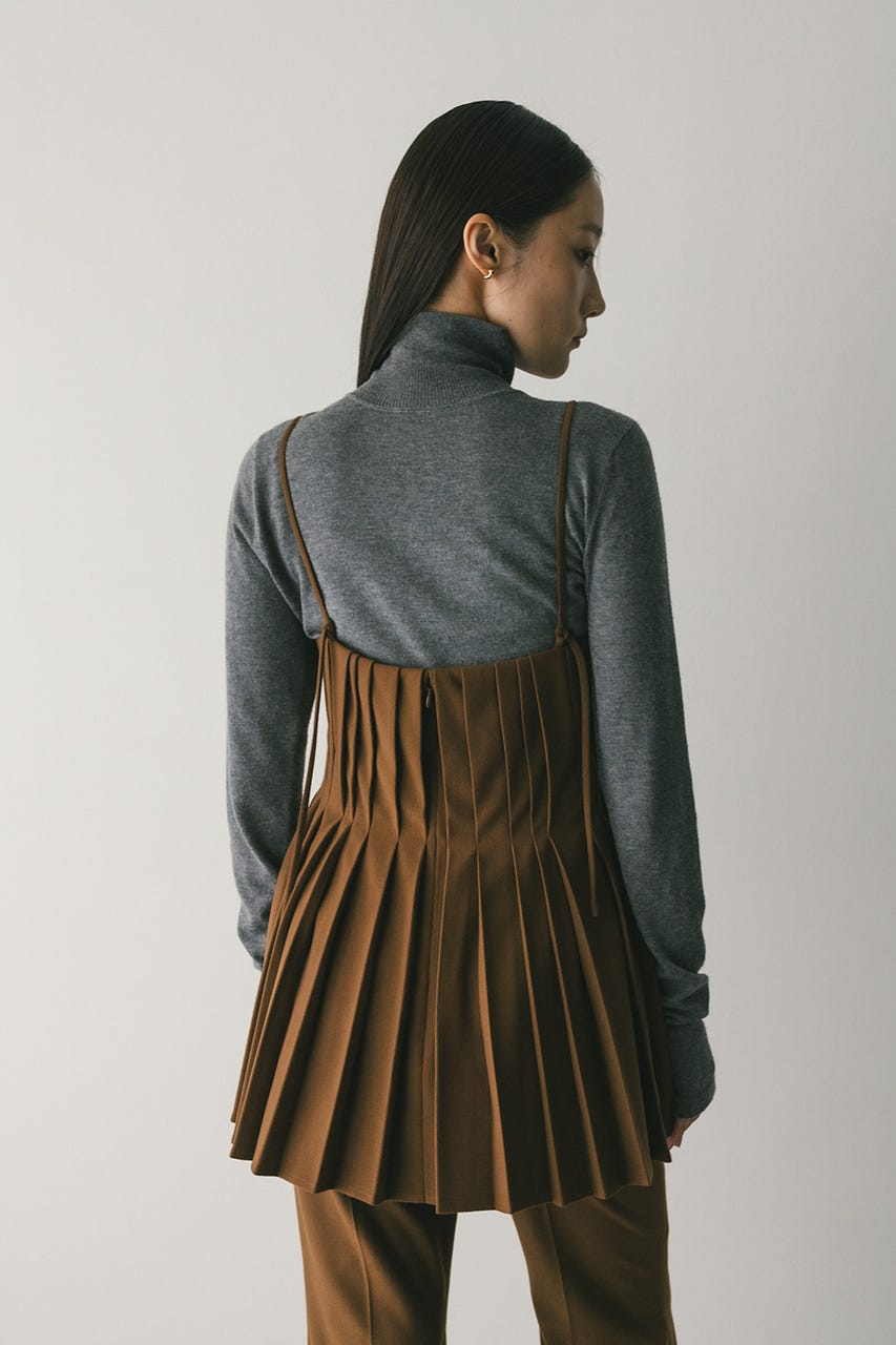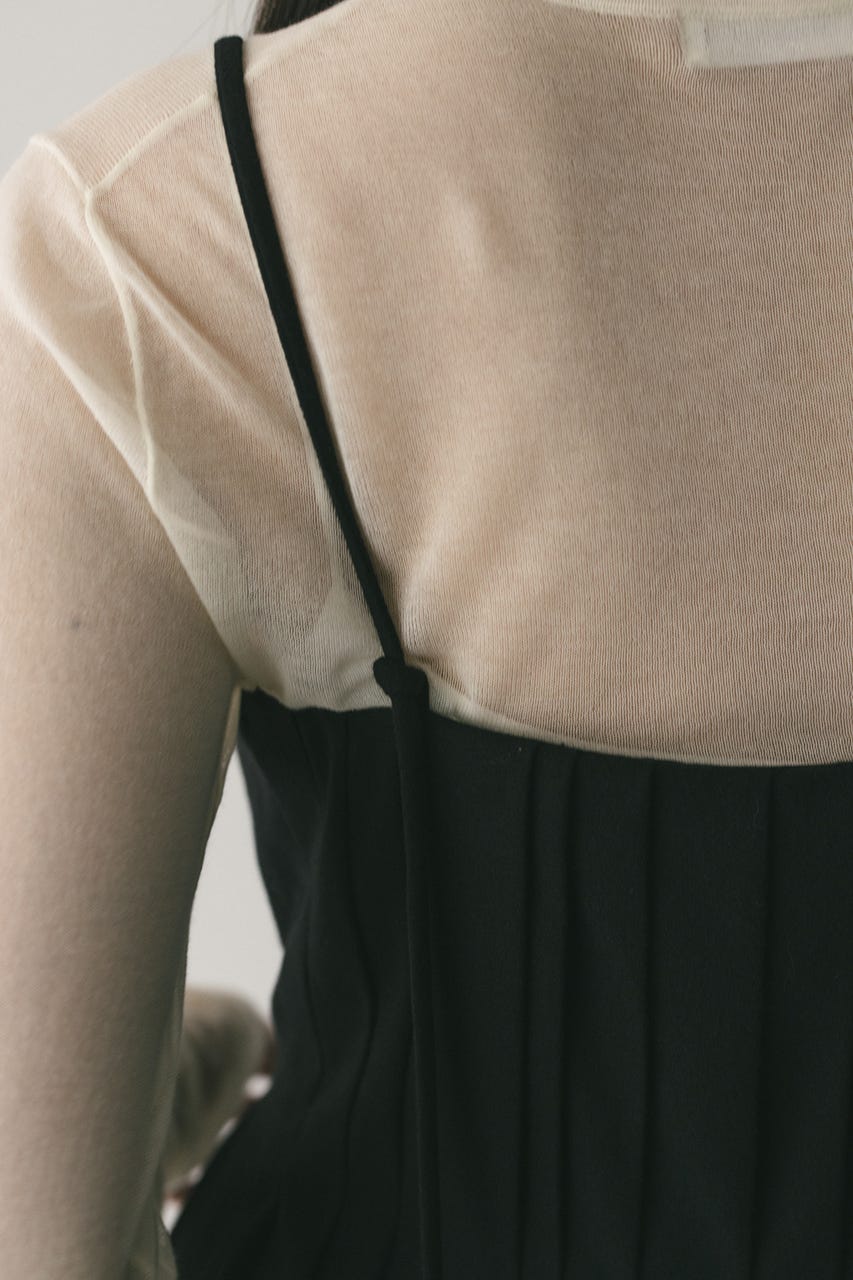 ランダムにタッキングしたデザインがポイントのペプラムキャミトップ。