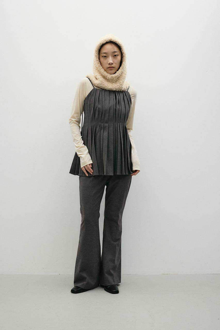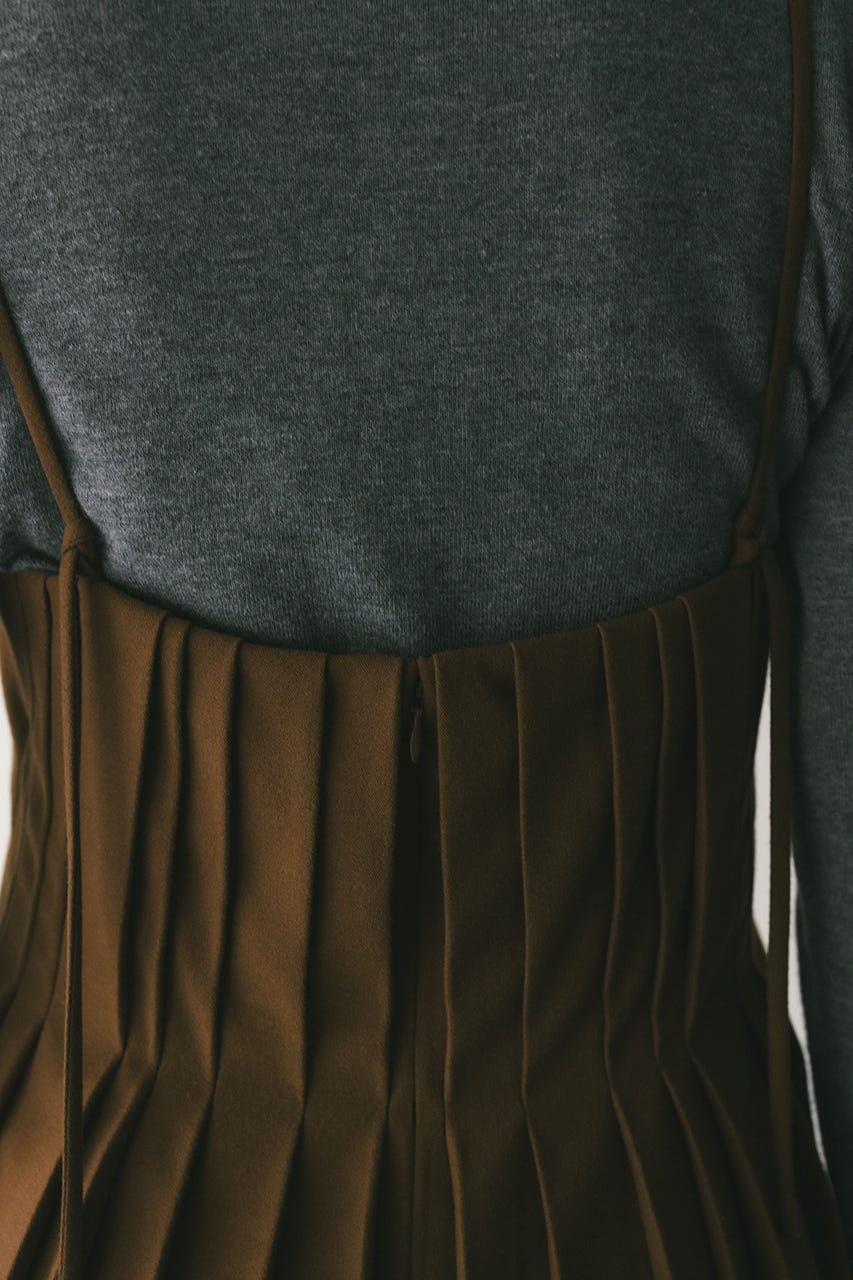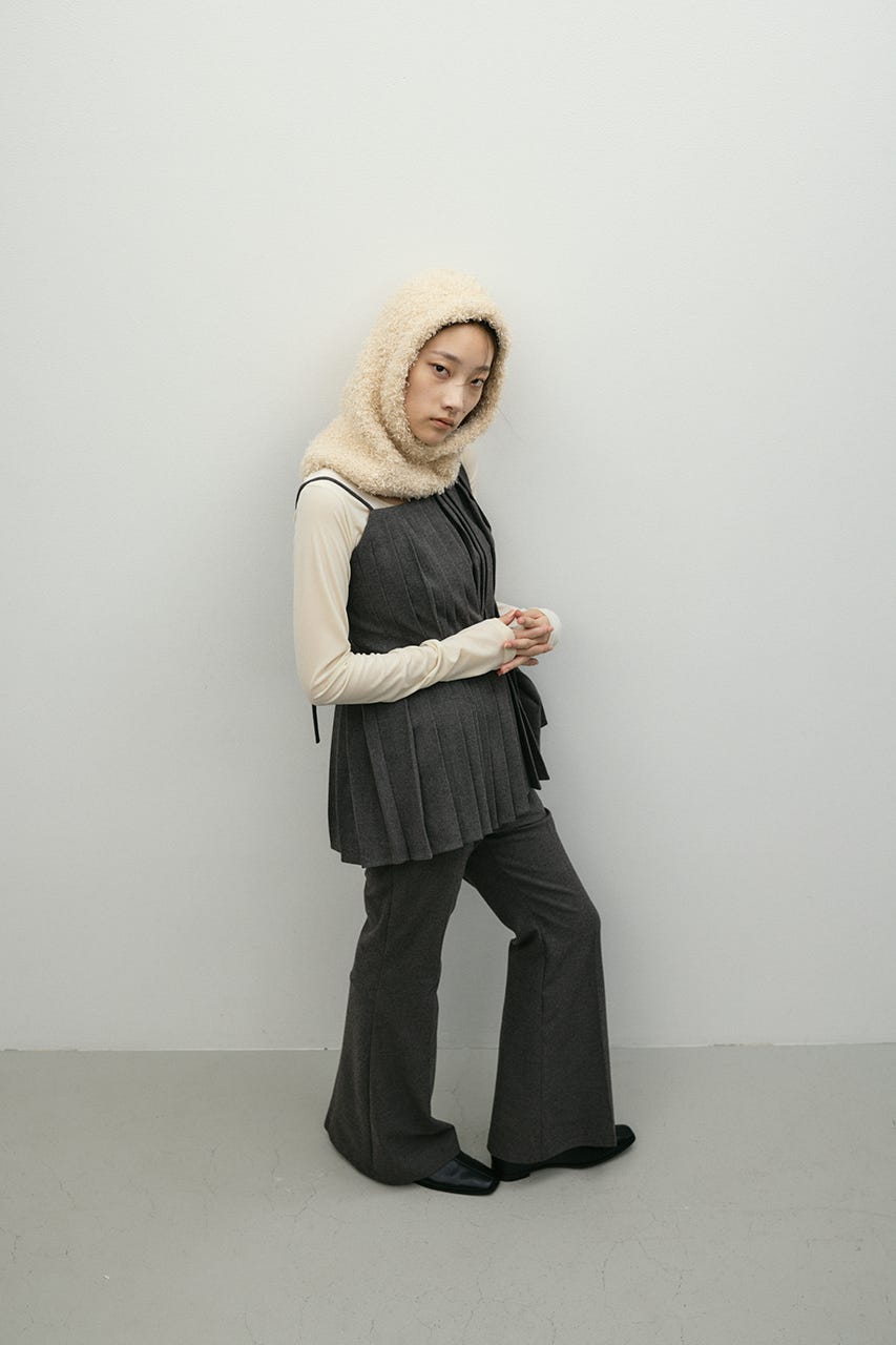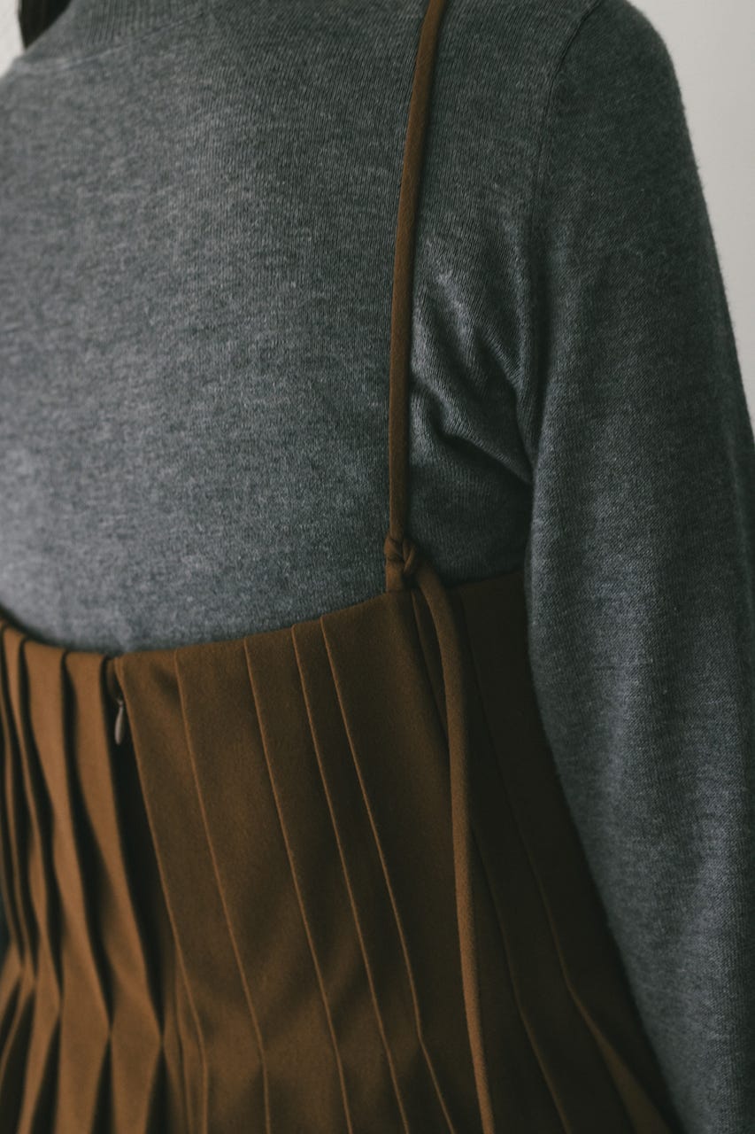 ランダムにタッキングしたデザインがポイントのペプラムキャミトップ。