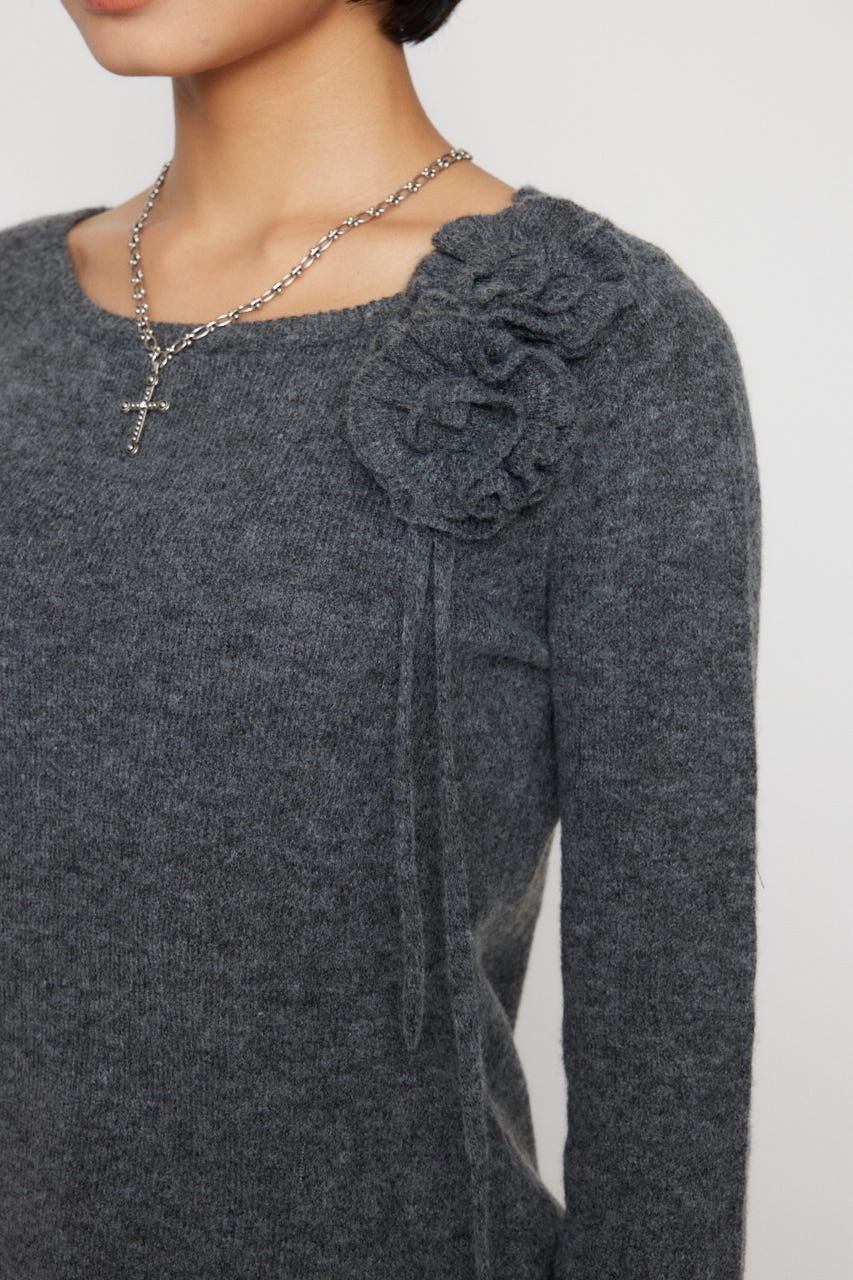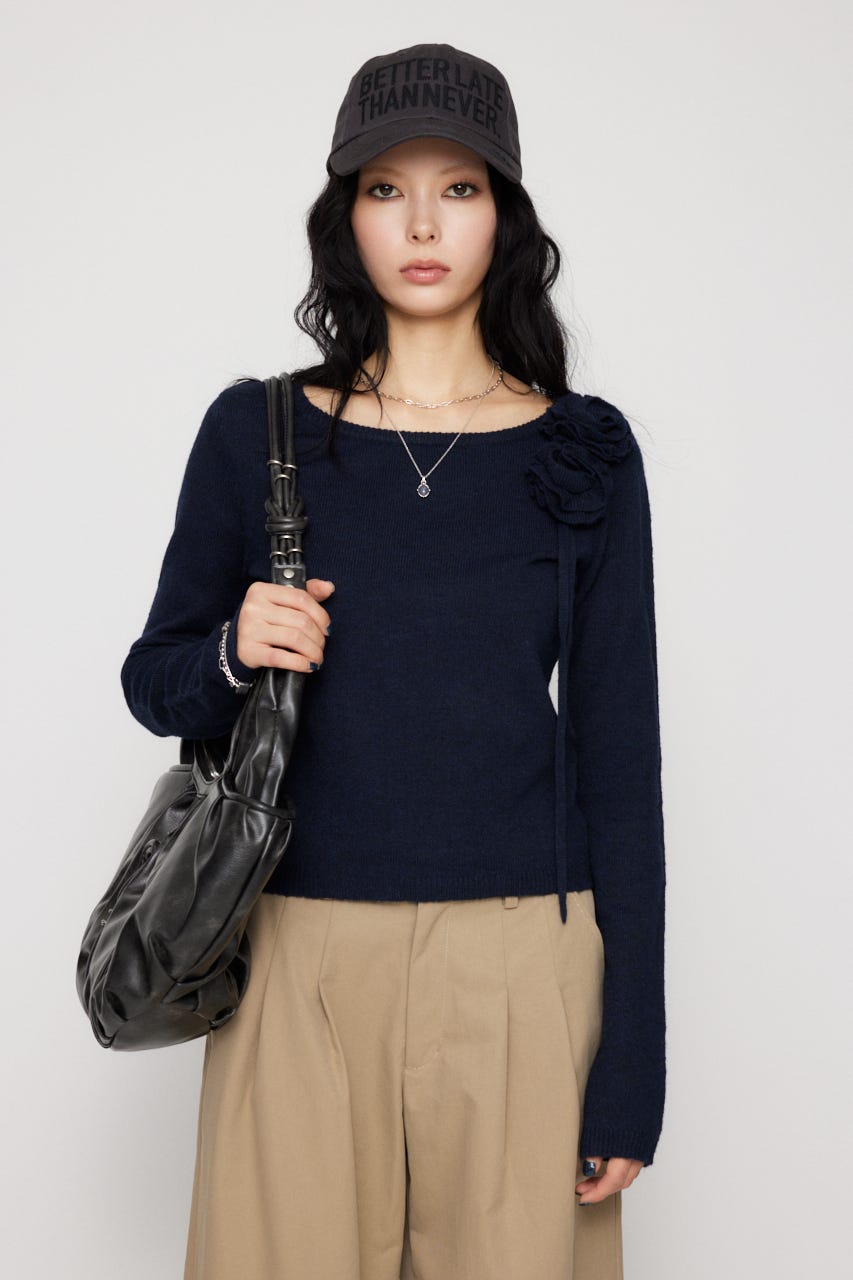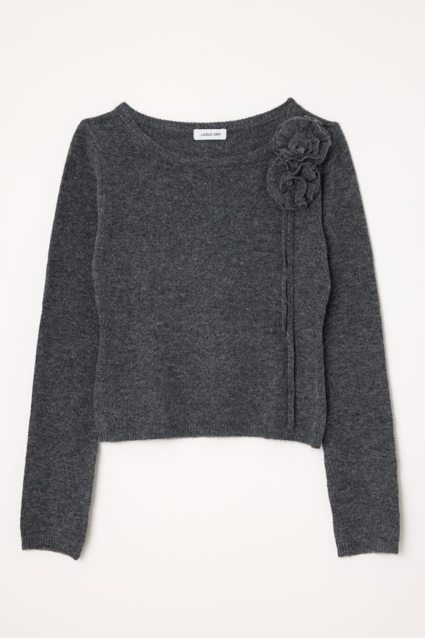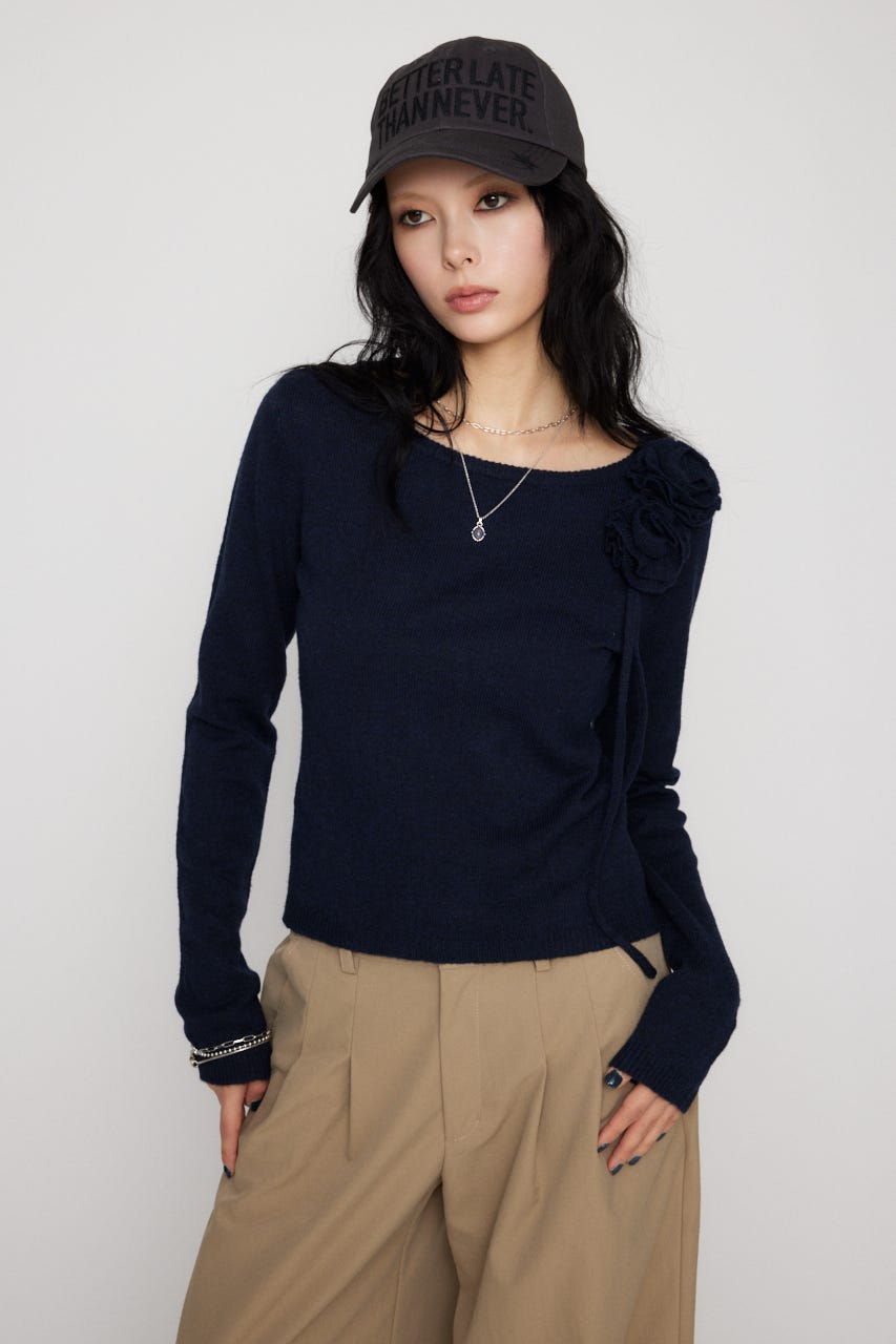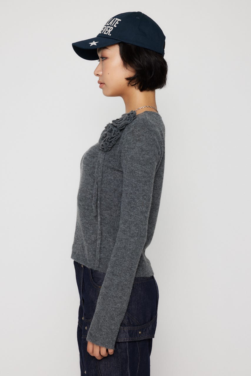 ■POINT:軽やかな質感とローズモチーフのコサージュがポイントのニット。