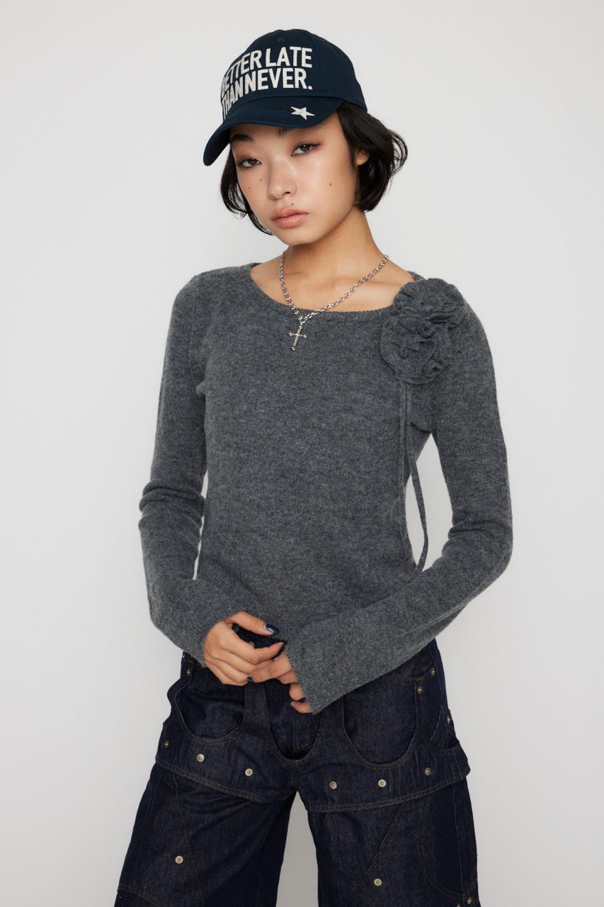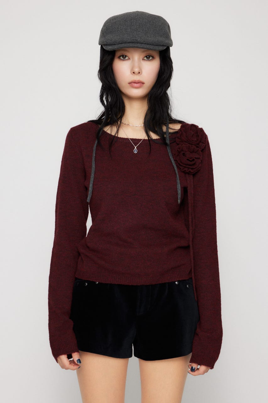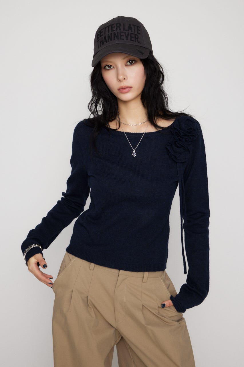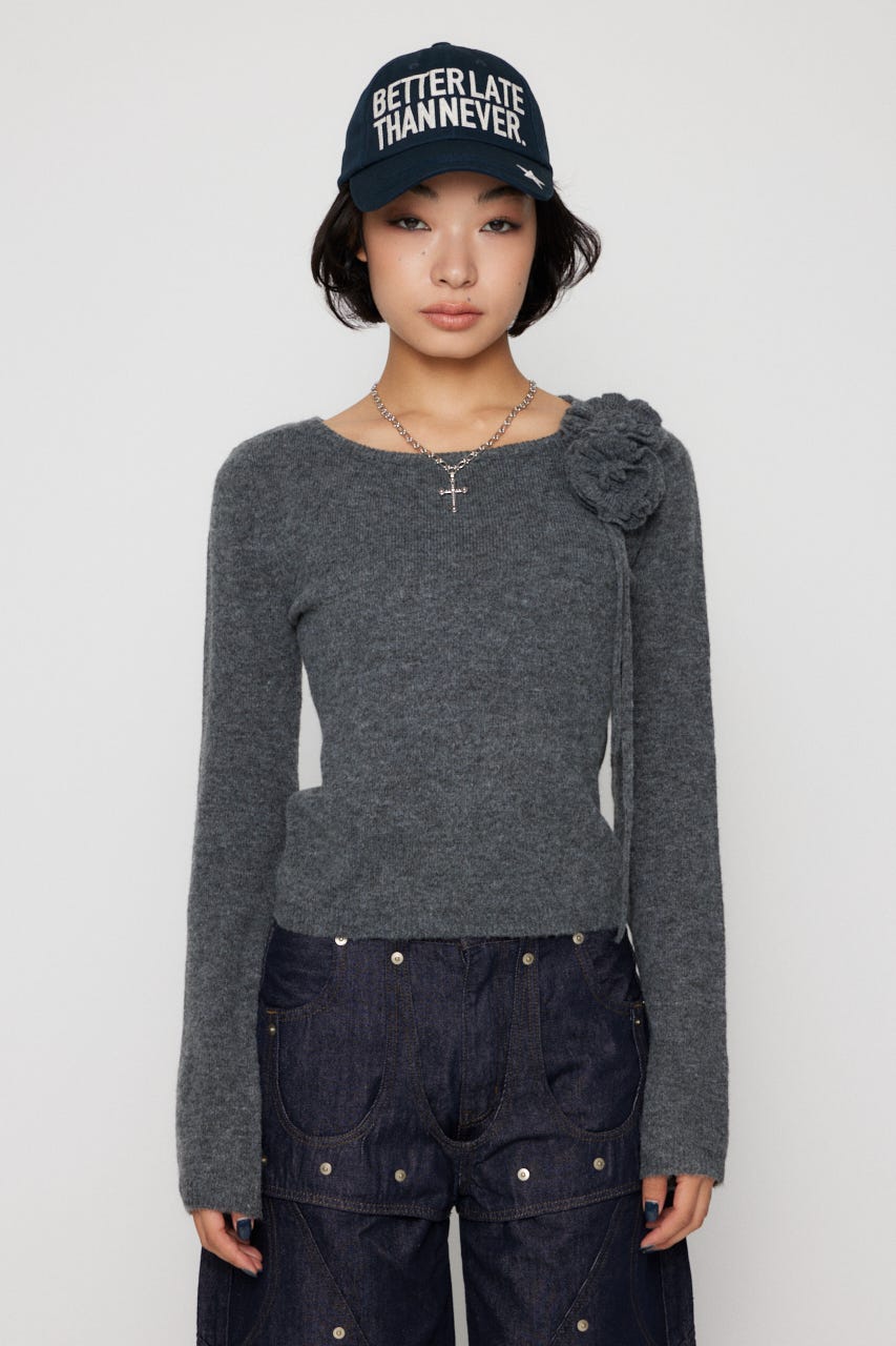 ■POINT:軽やかな質感とローズモチーフのコサージュがポイントのニット。