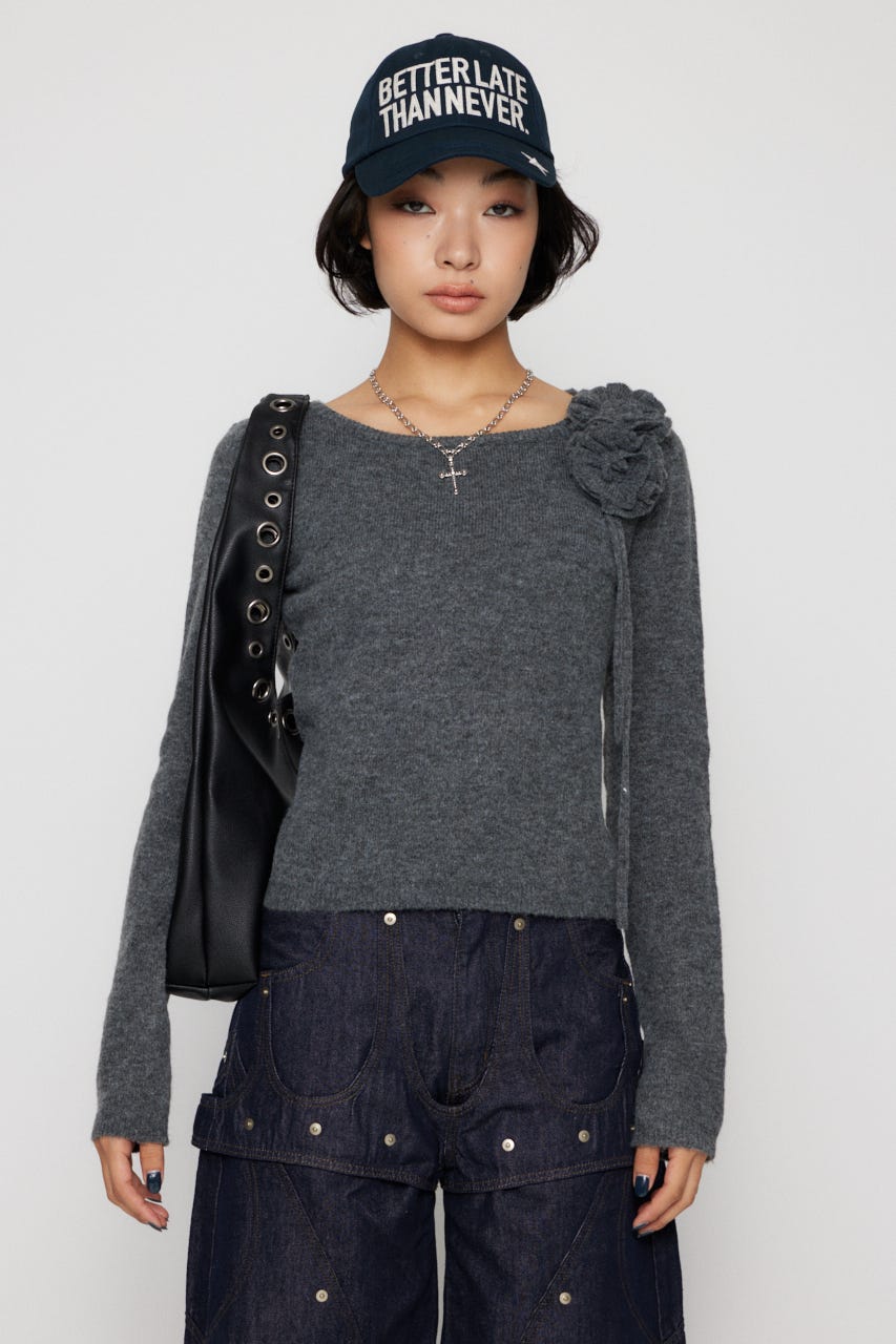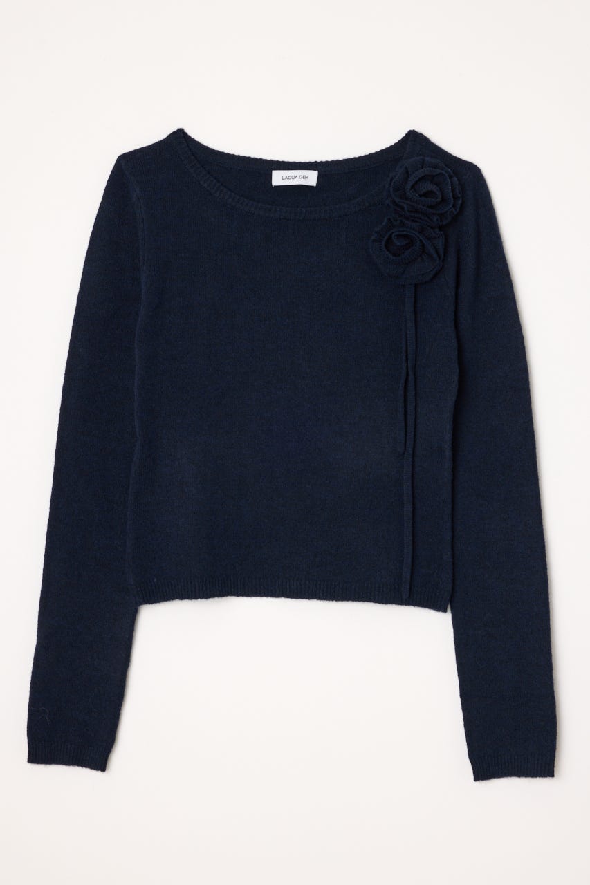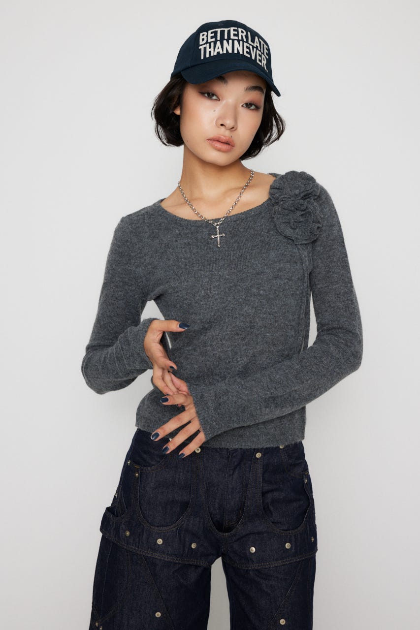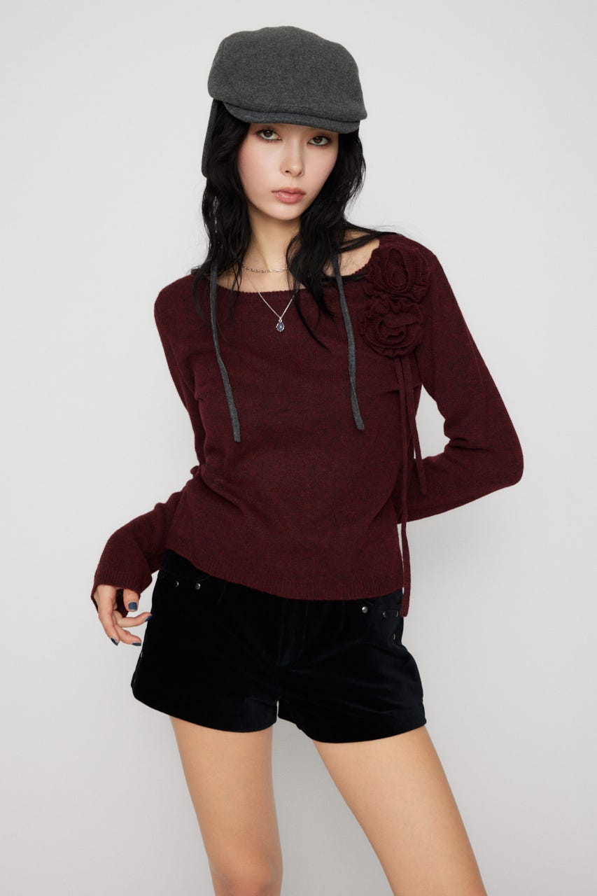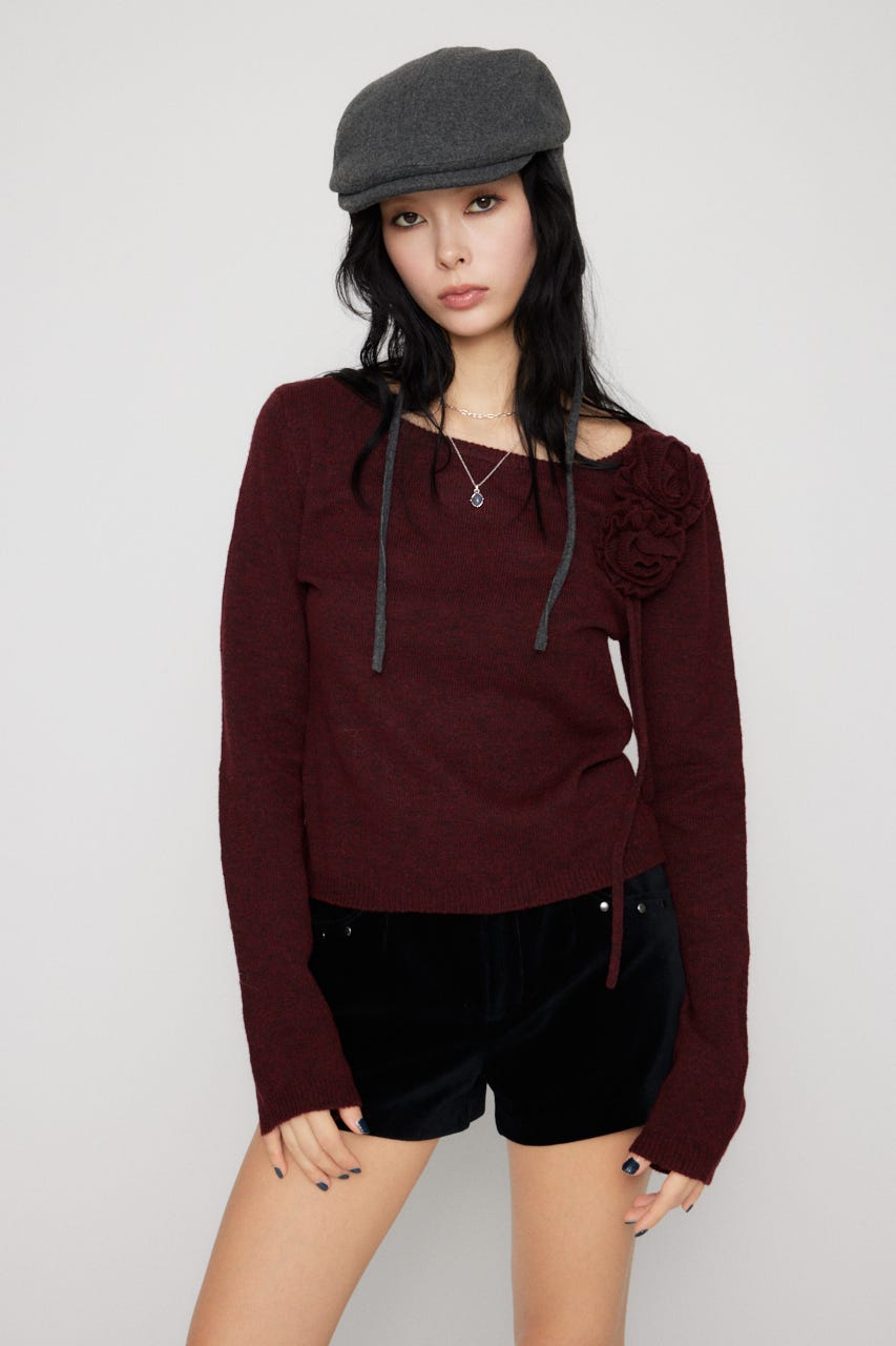 ■POINT:軽やかな質感とローズモチーフのコサージュがポイントのニット。
