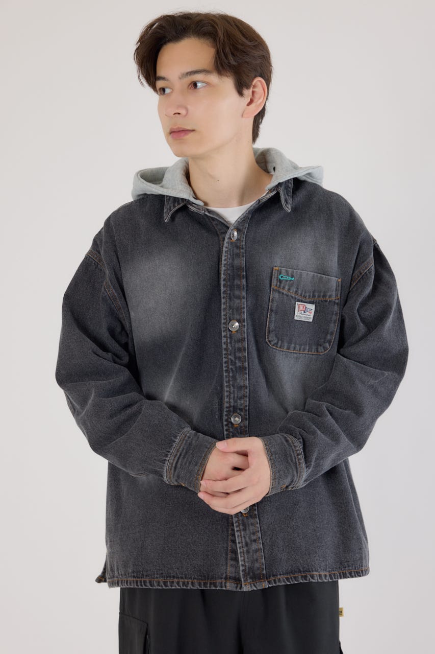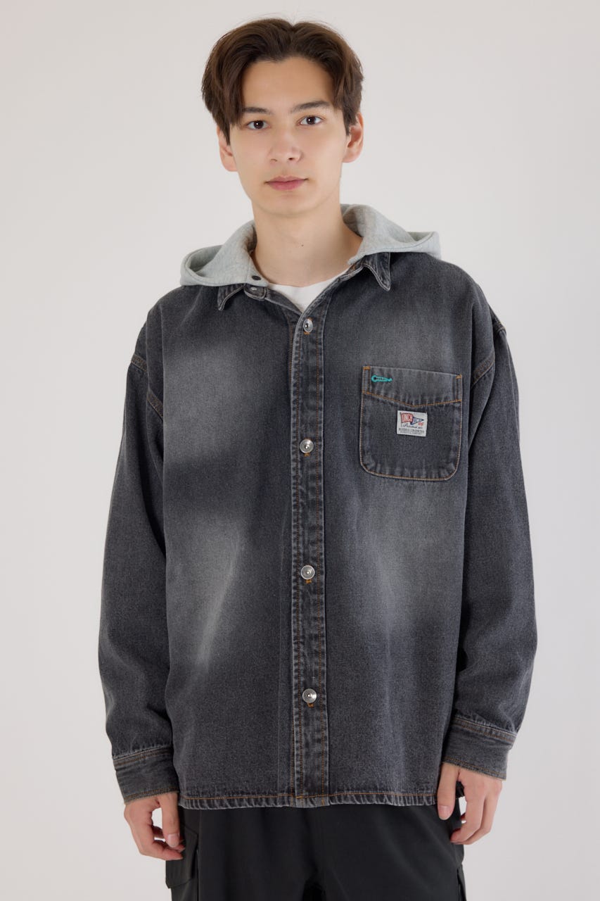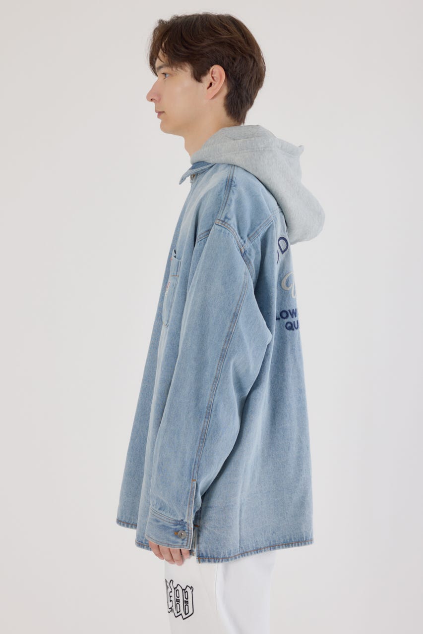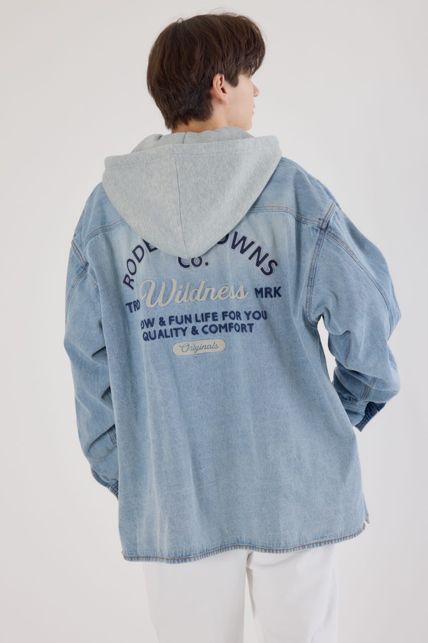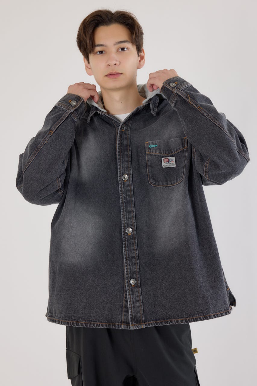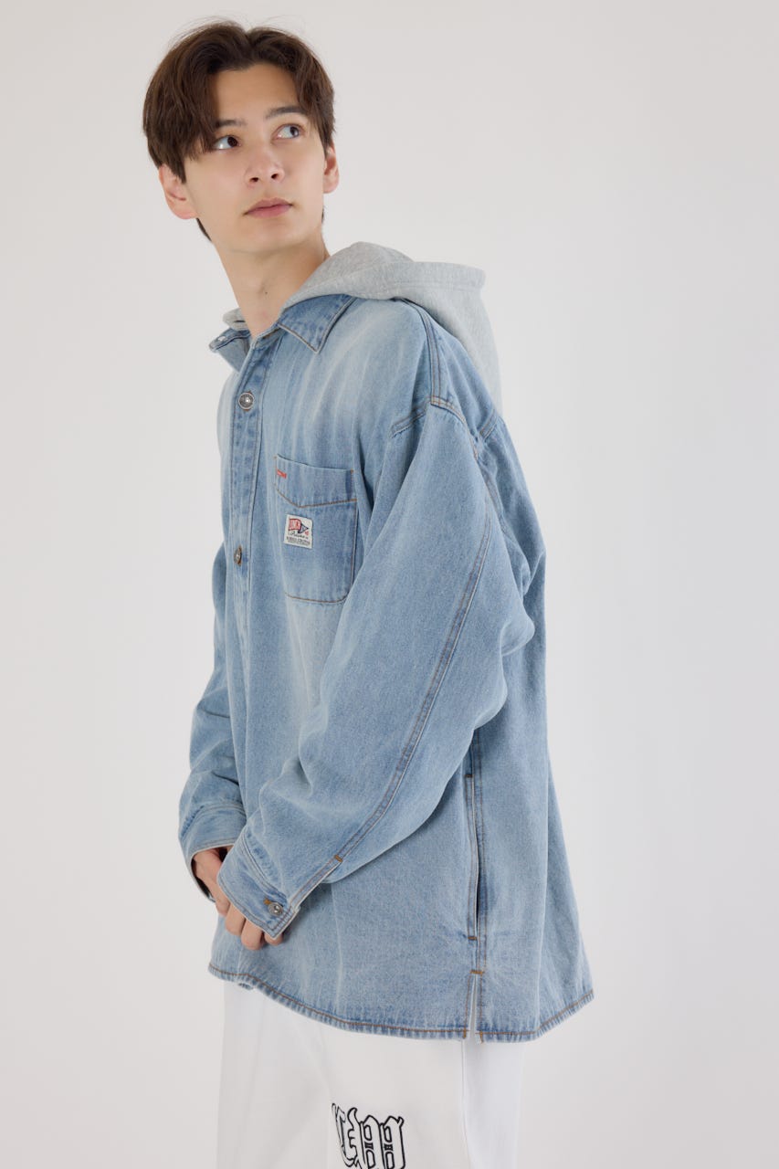 しっかりとしたデニム生地を使用したフード付きのデニムシャツジャケット。