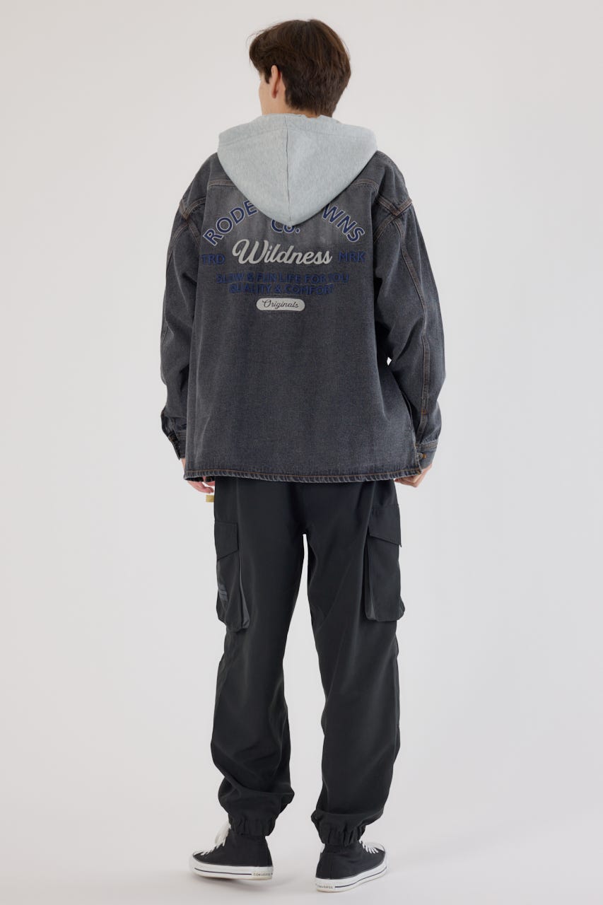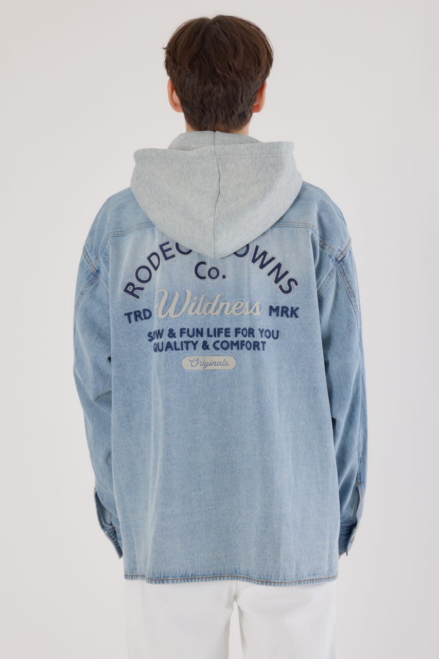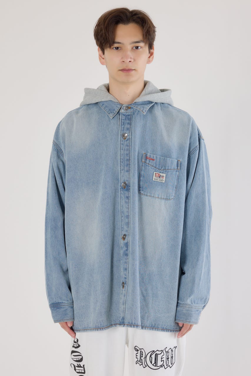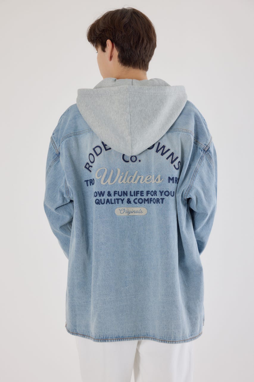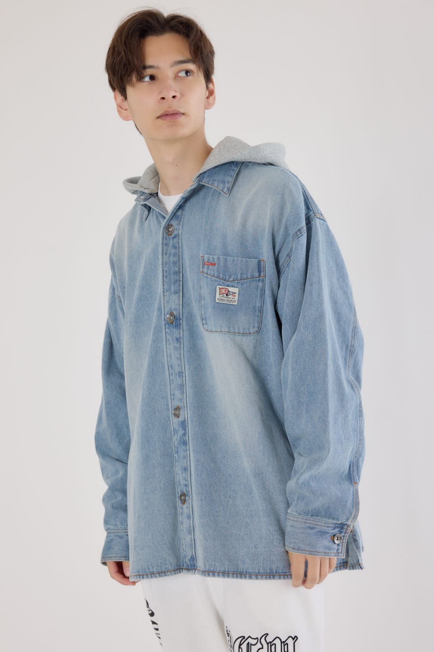しっかりとしたデニム生地を使用したフード付きのデニムシャツジャケット。