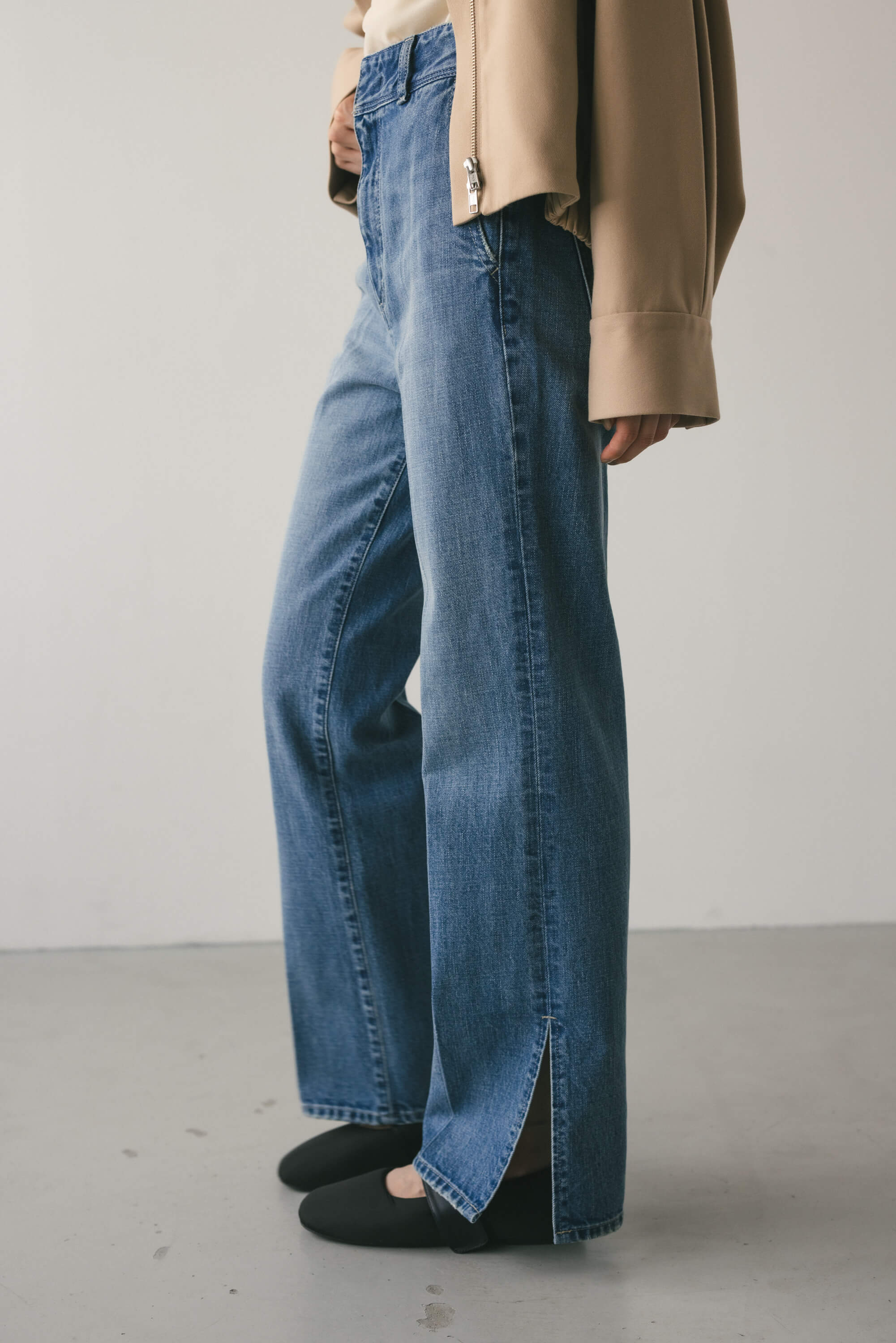 裾にスリットを入れたスタイリッシュなデザインのデニムパンツ。