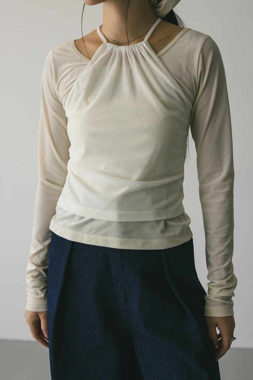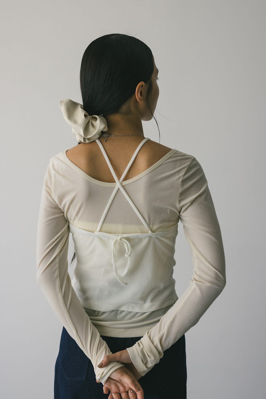 肩紐はネック部分で結んでも、バックにループがついているのでキャミソールとしても着ていただける2WAY仕様です。