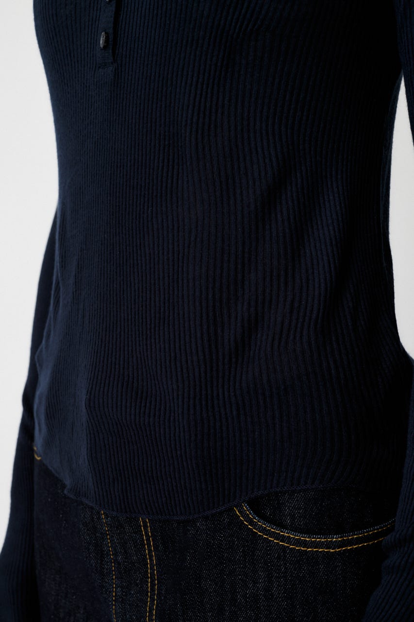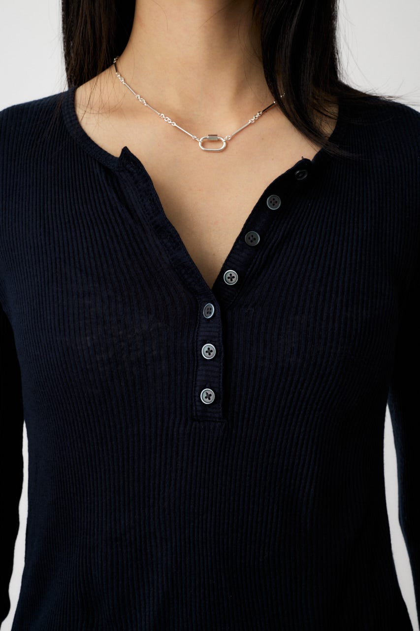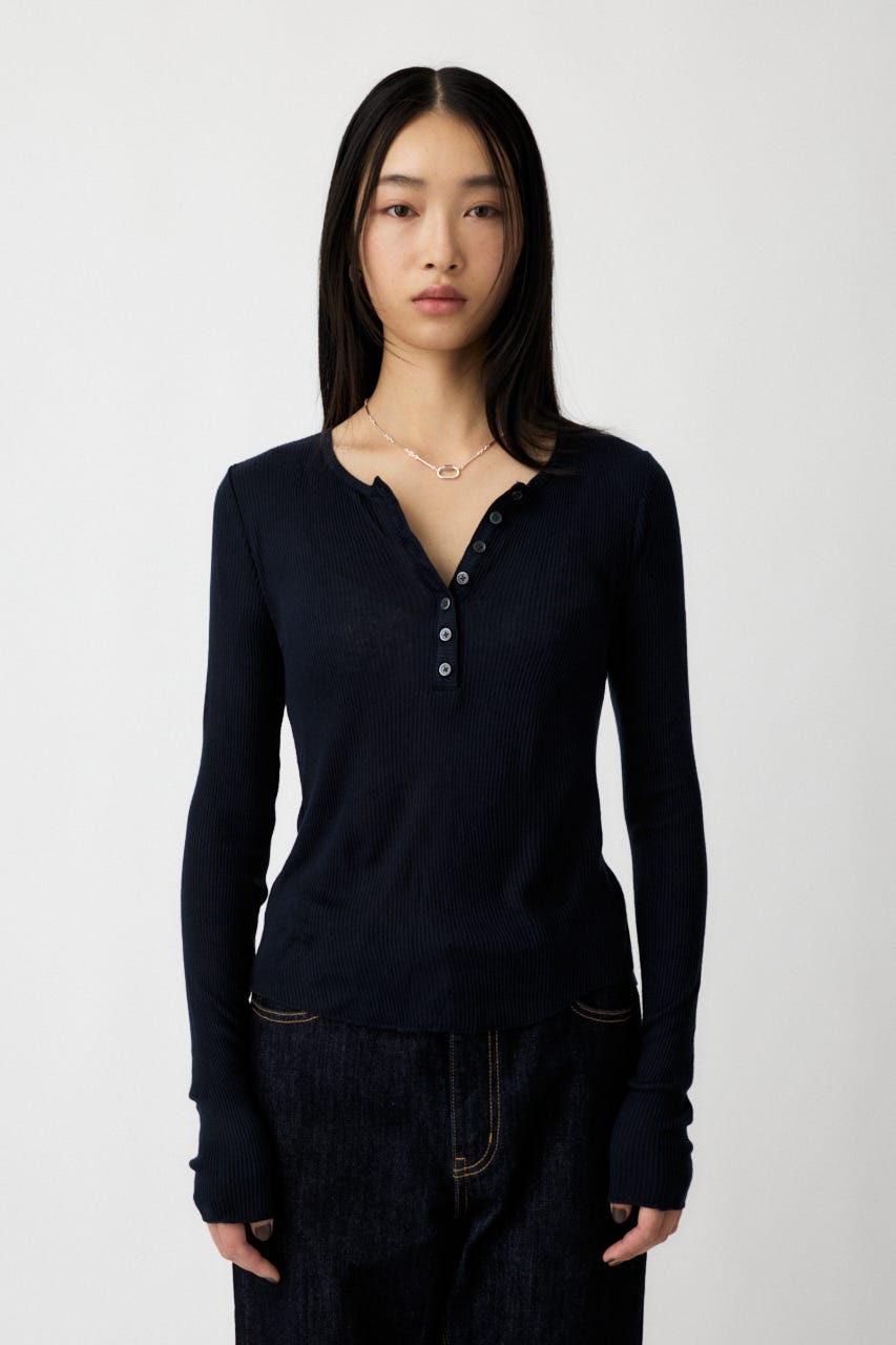 華奢なヘンリーネックの襟元と、繊細な細いリブが、カジュアルなアイテムを上品に、女性らしく見せてくれるポイントに。