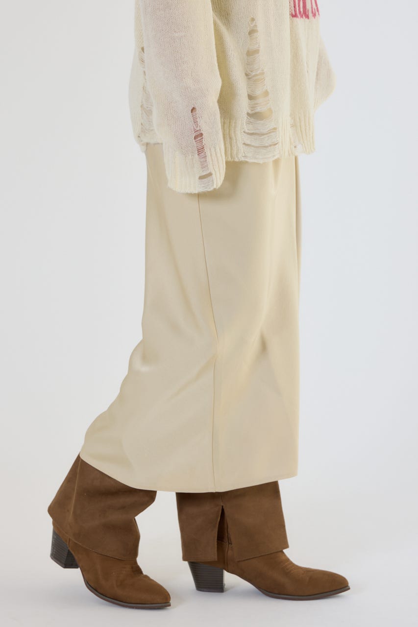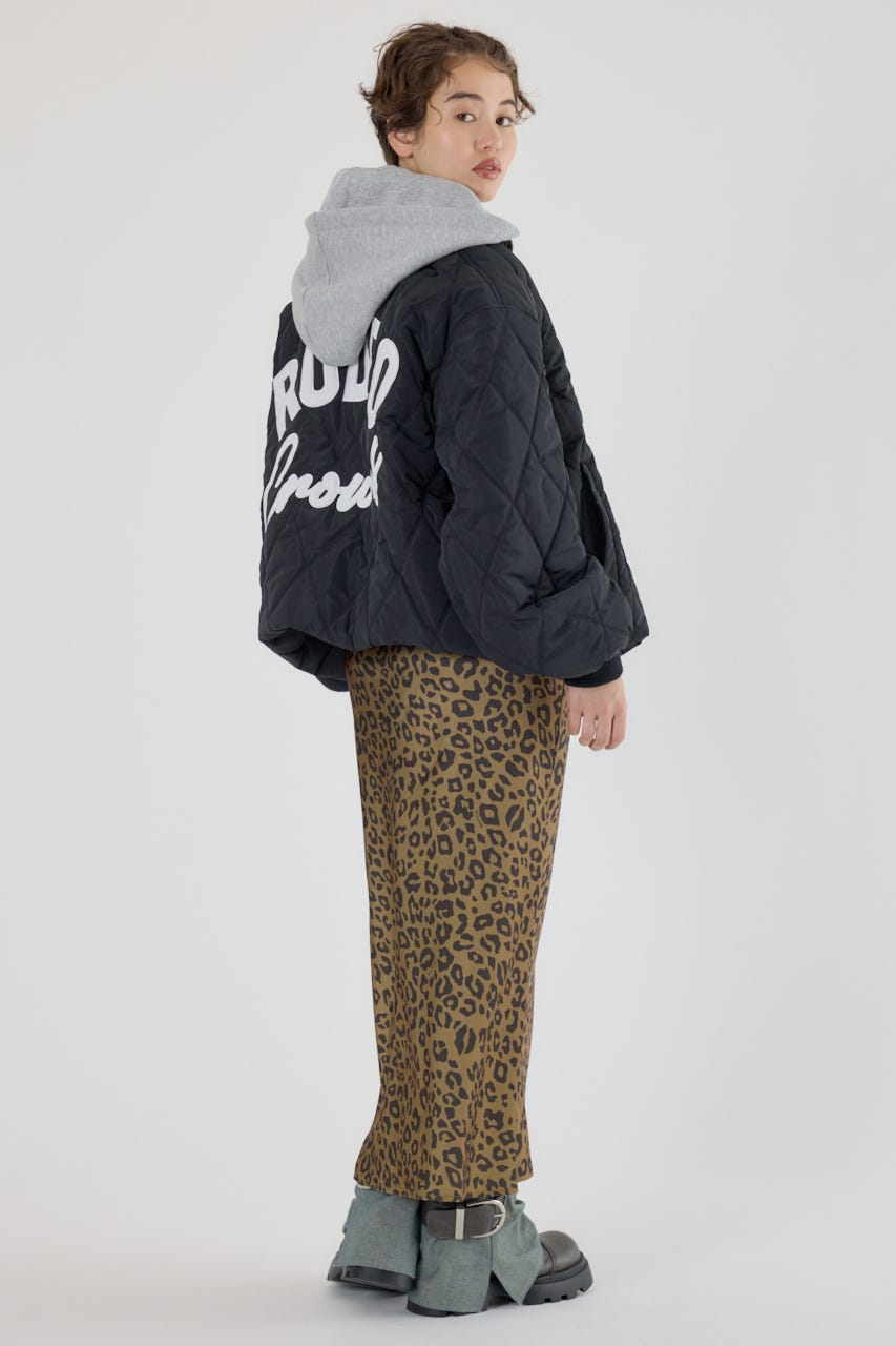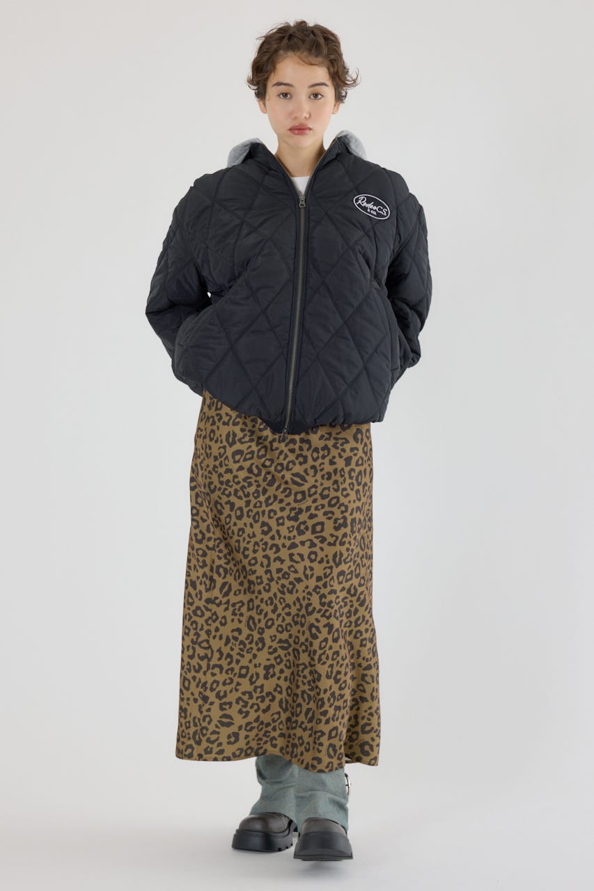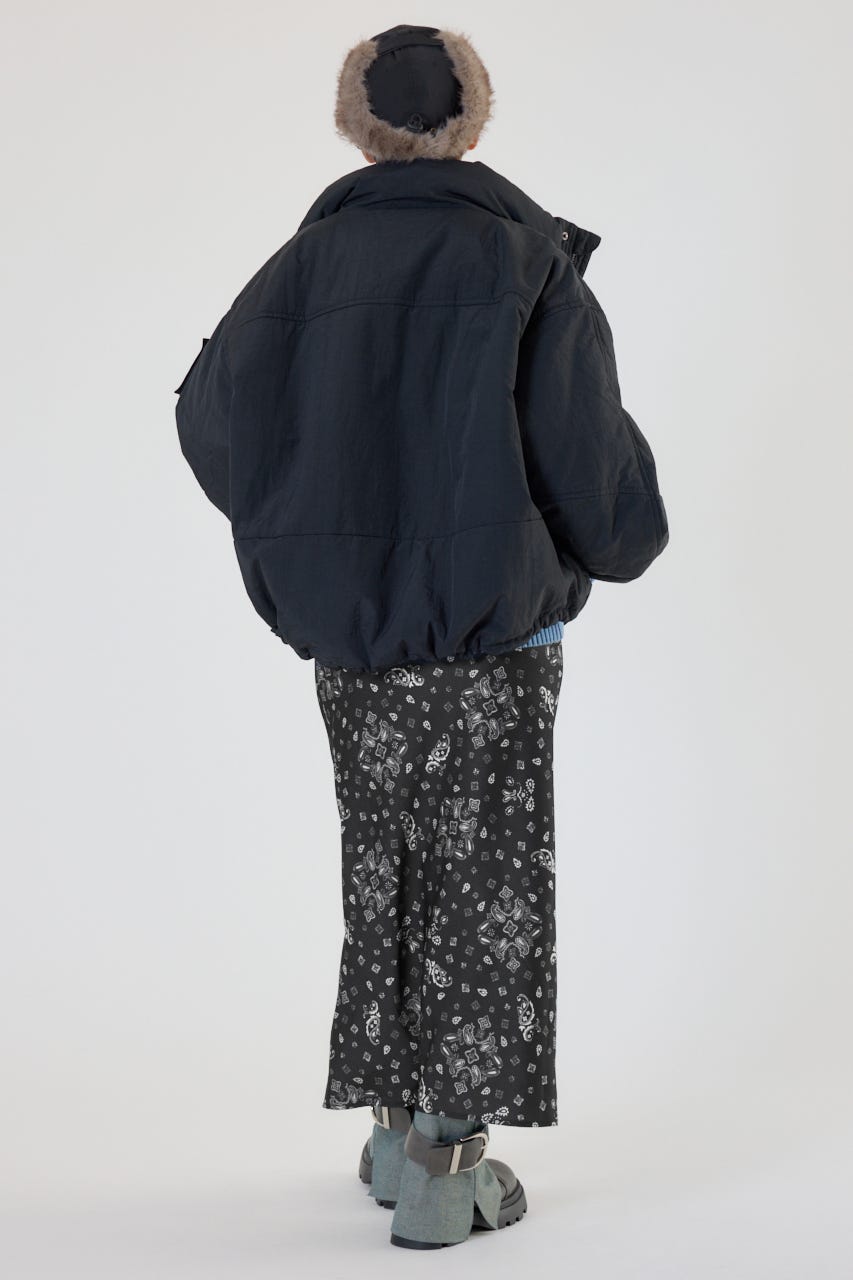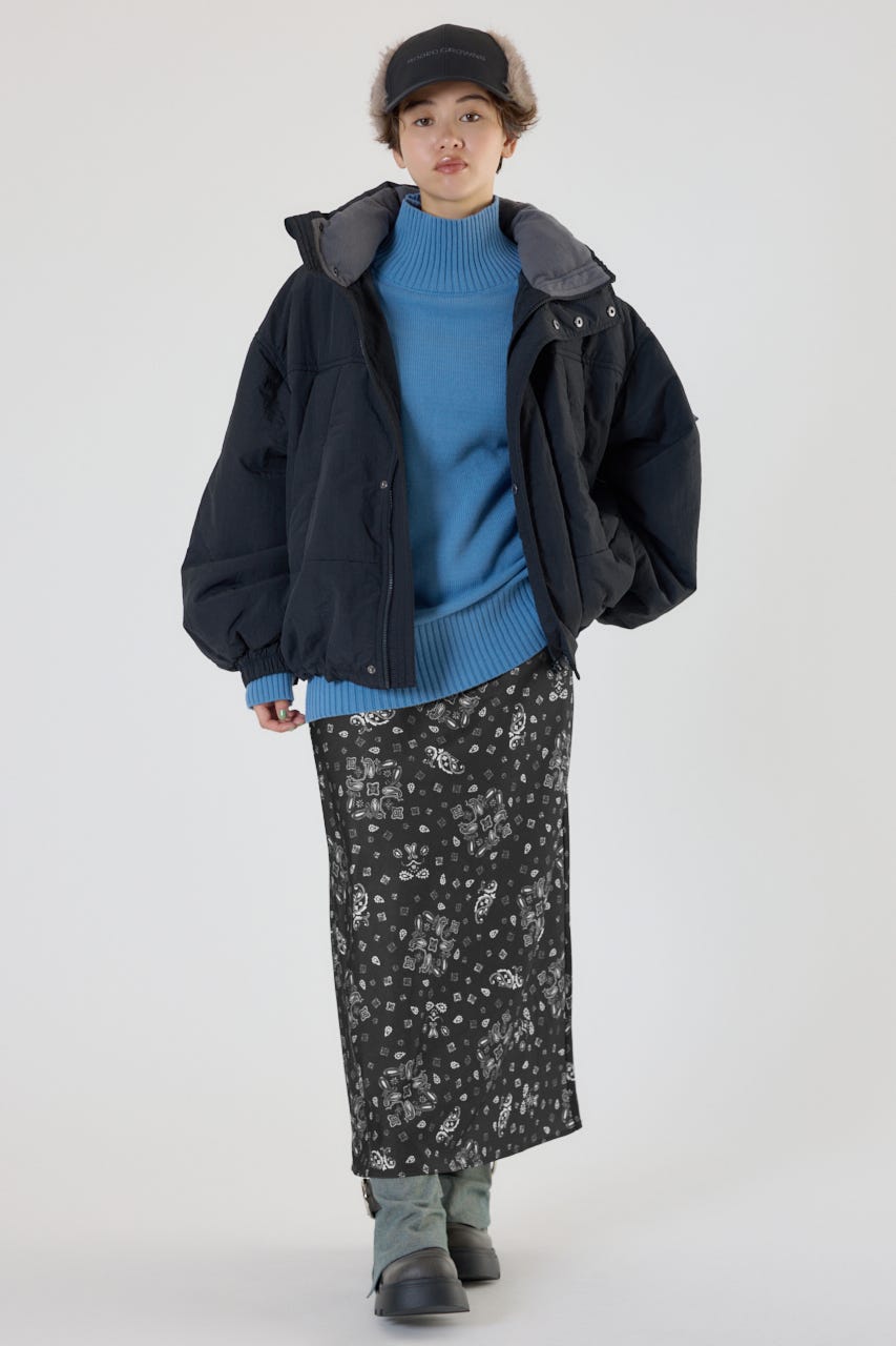 カジュアルなプリントスウェットやボリュームニットと合わせるのがバランスが良いです。