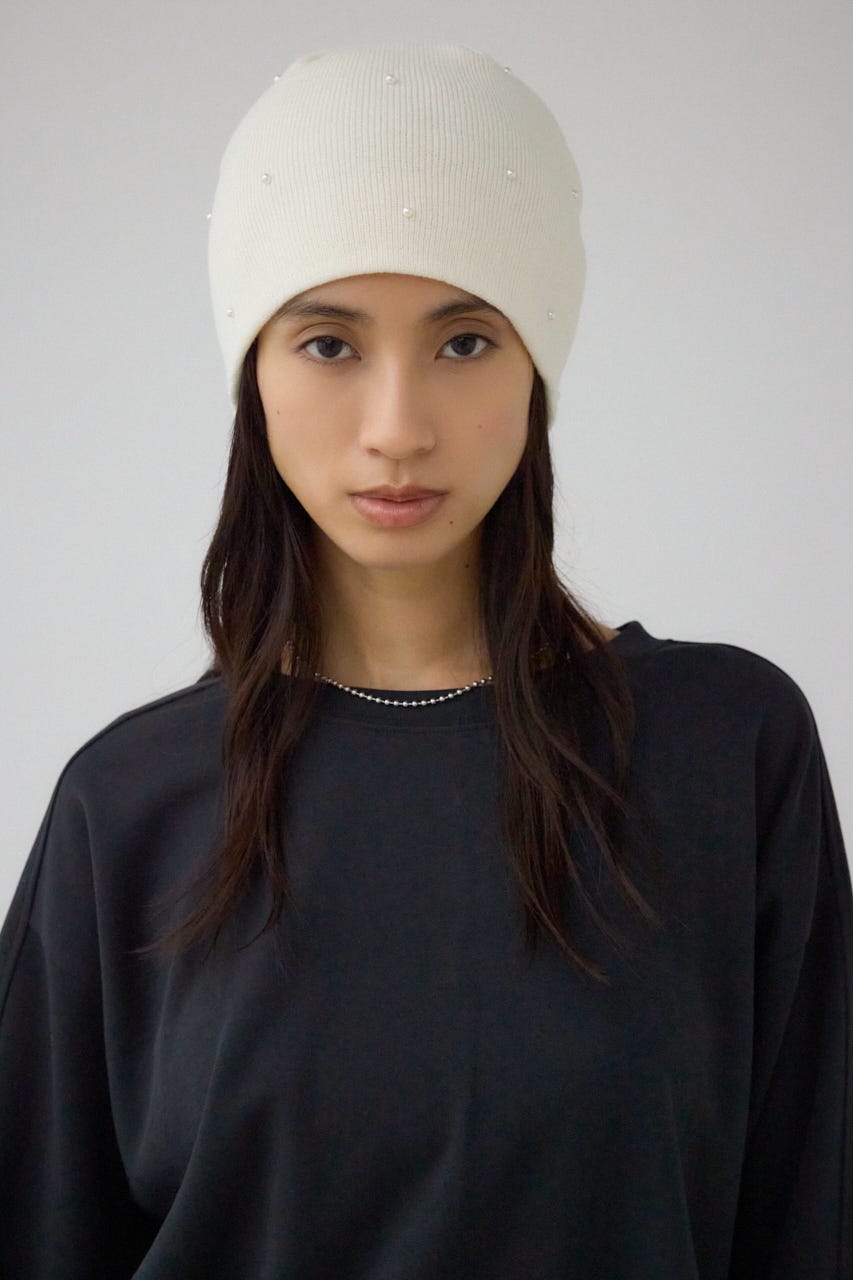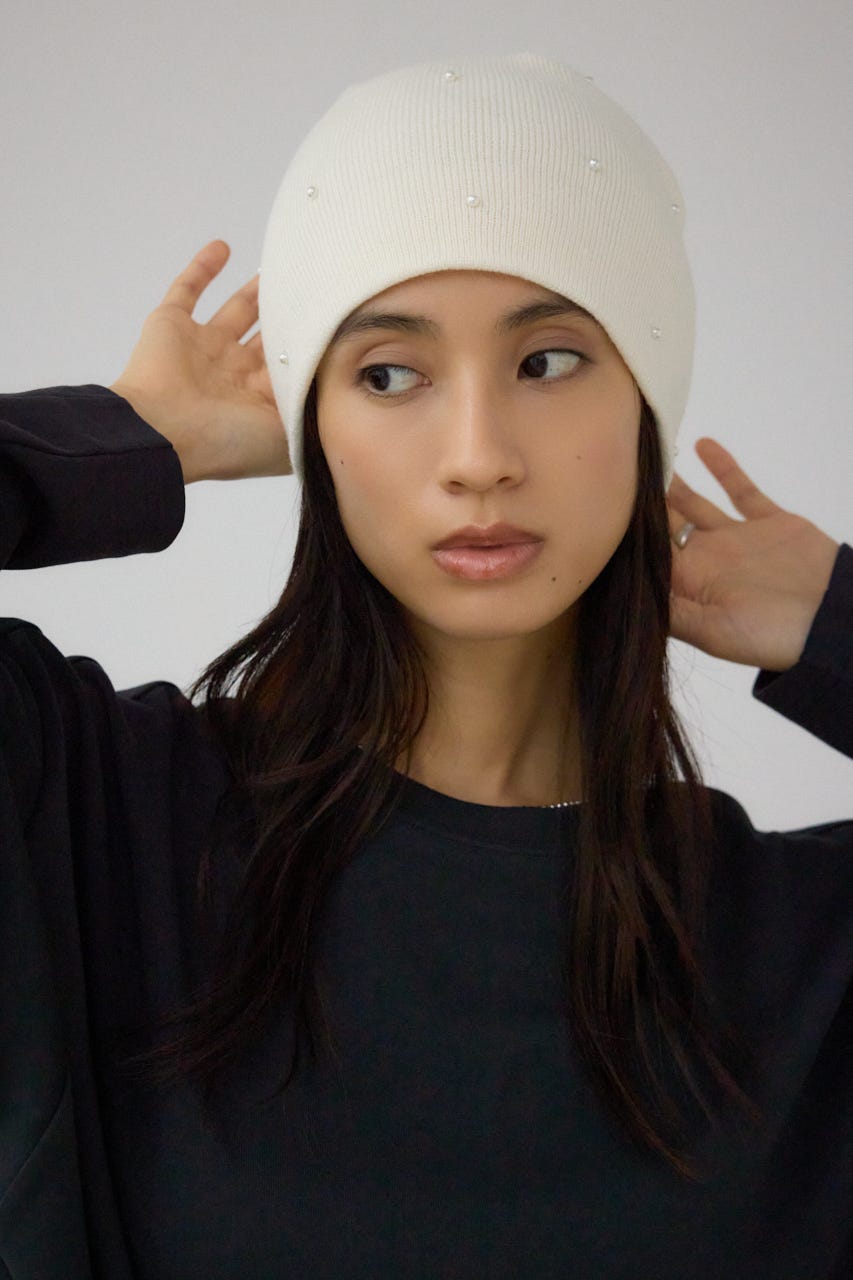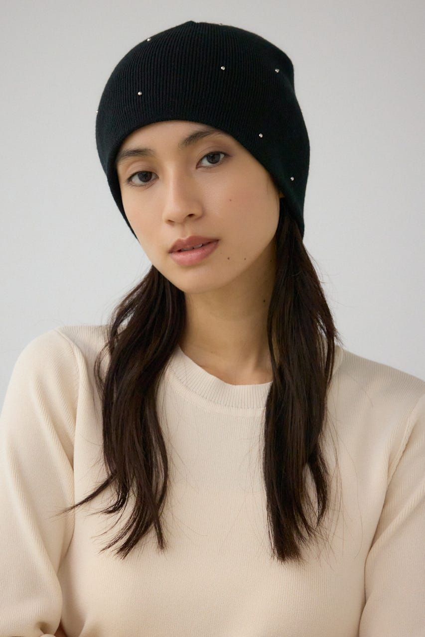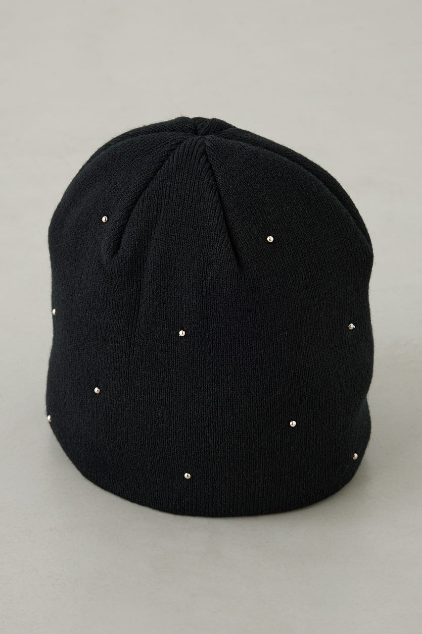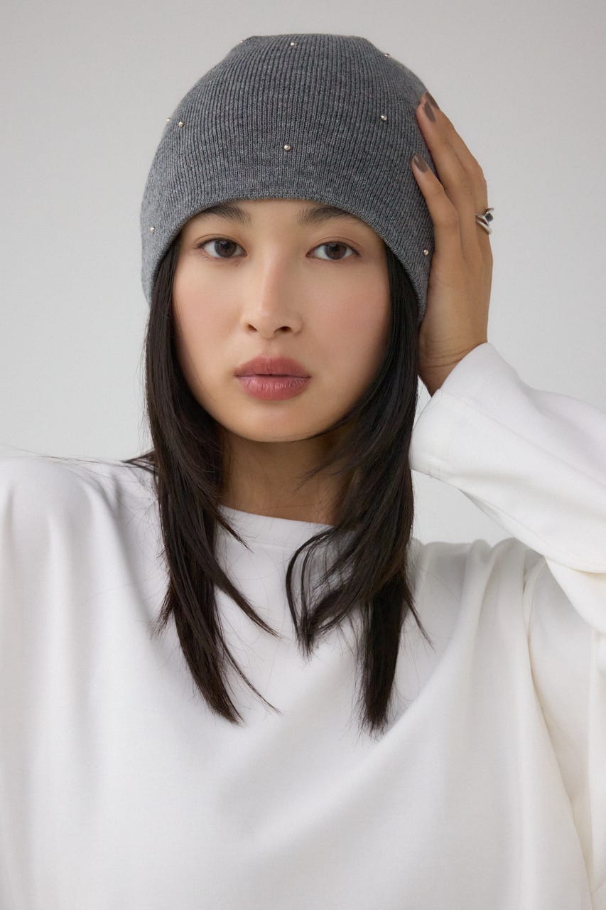キラッと光るスタッズとパールがアクセントの、冬の主役ニットキャップ。