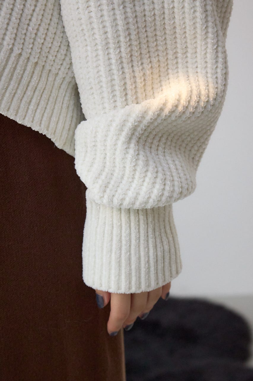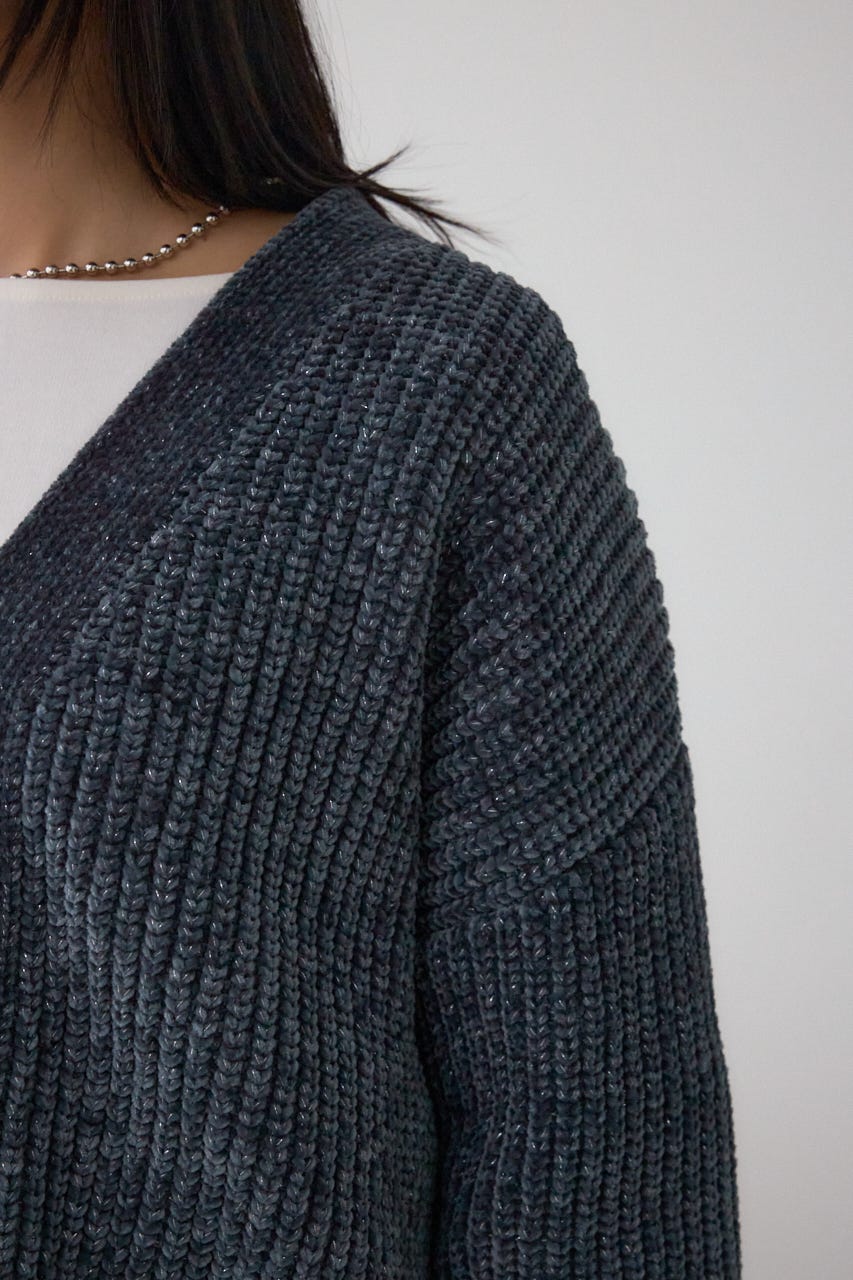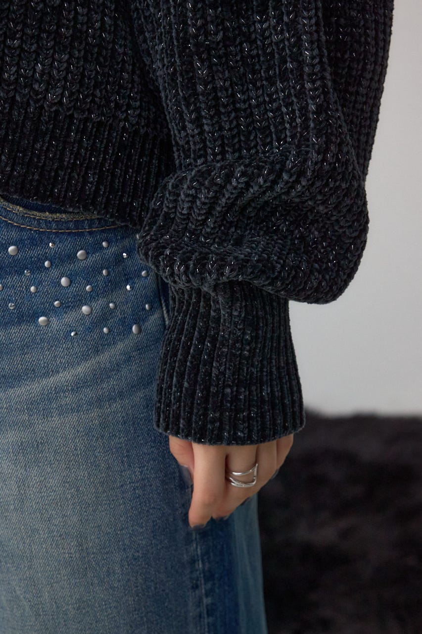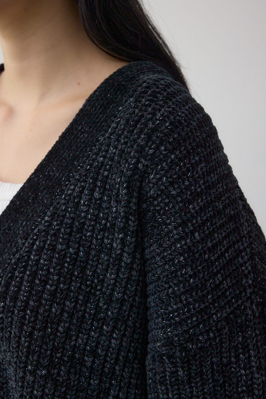 ベロアのような光沢感が特徴のモール糸に、ラメ糸を引き揃えて度詰めに編んでいます。