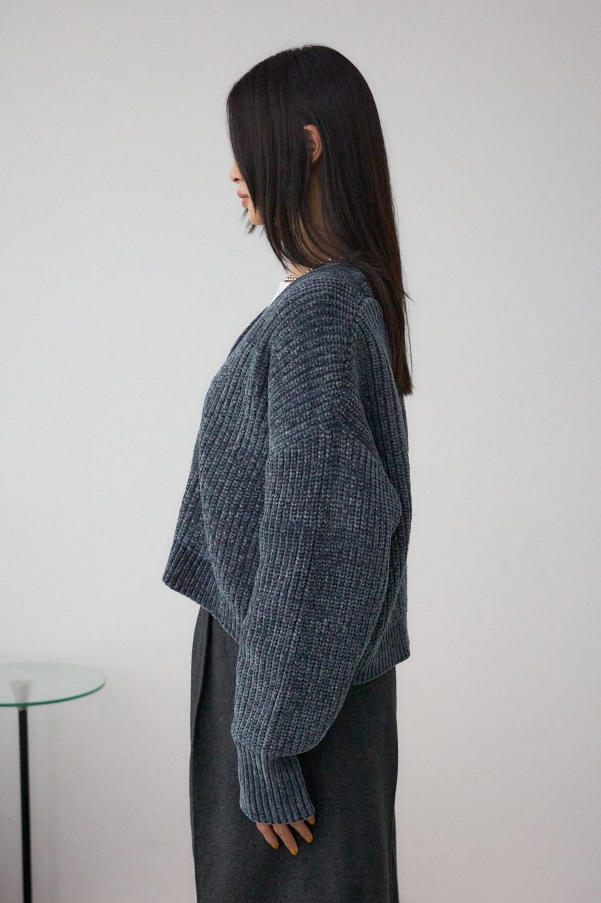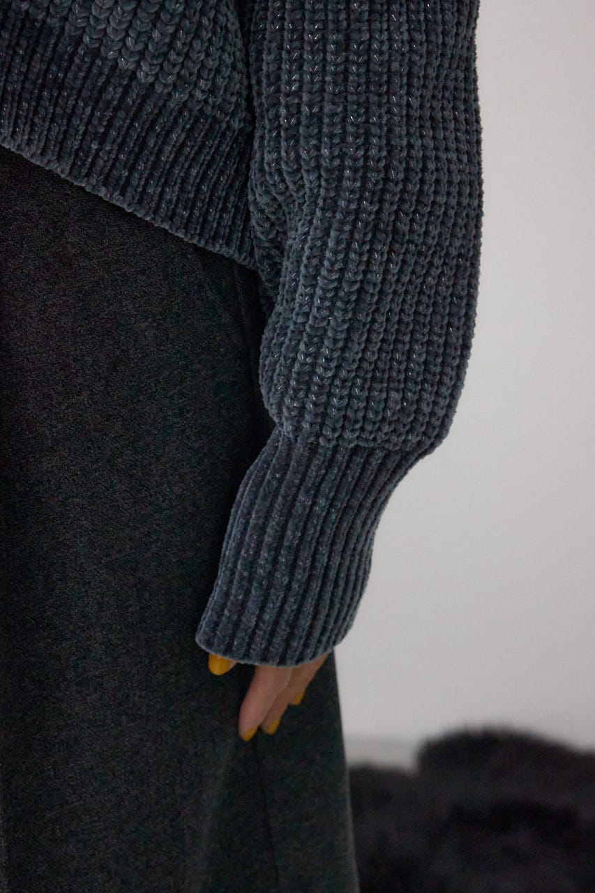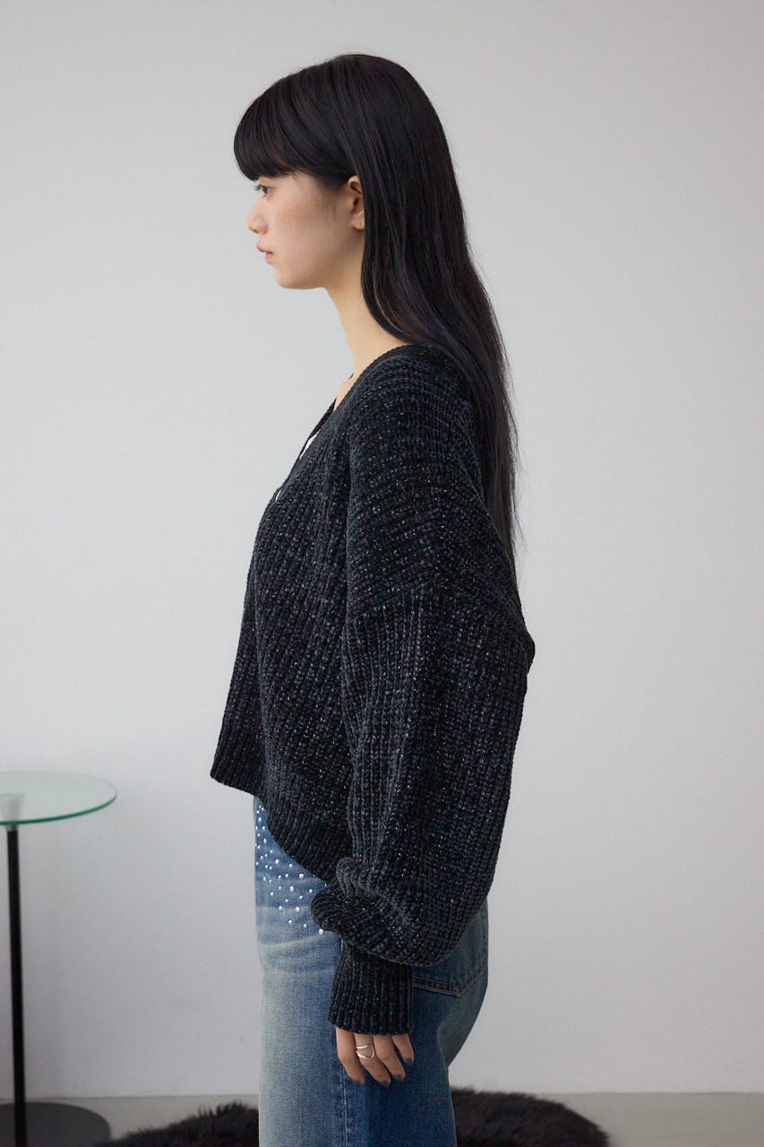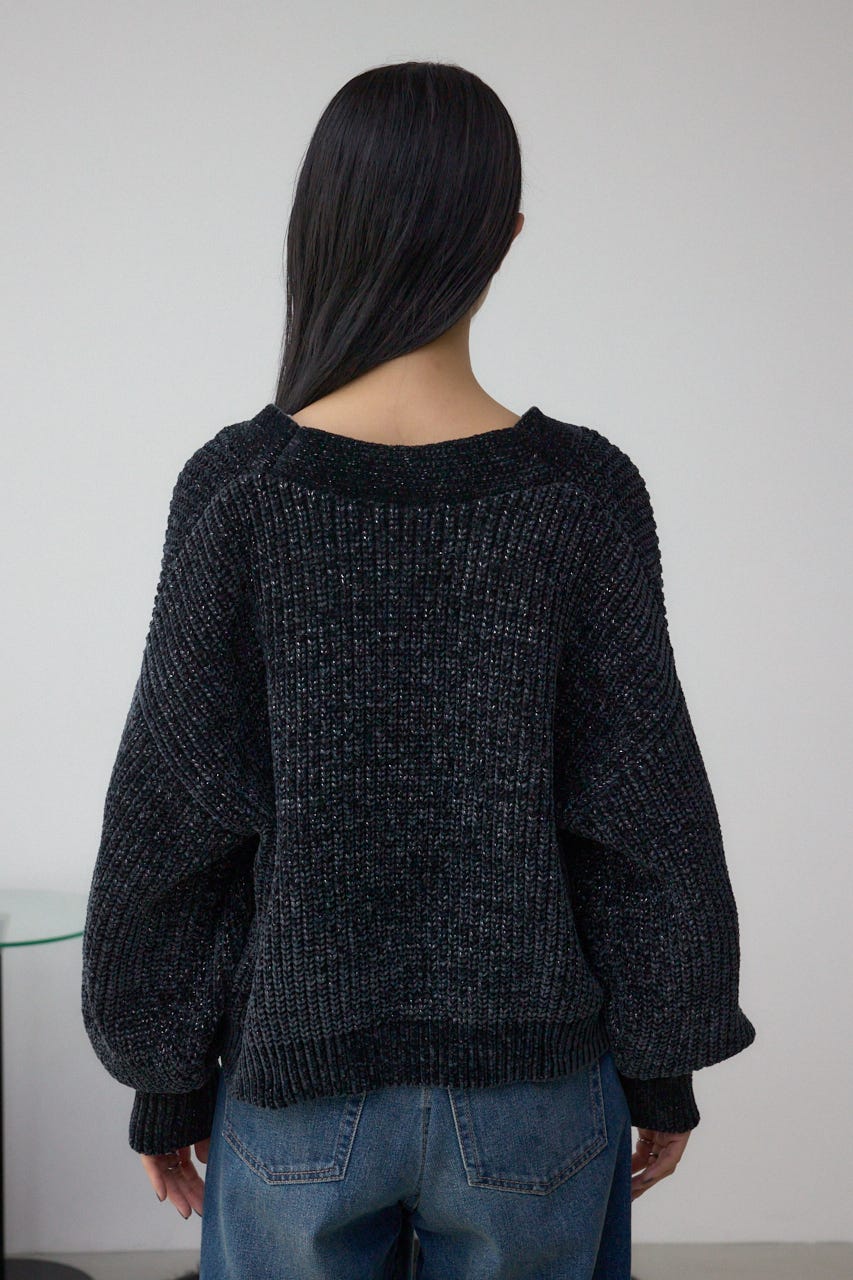 ベロアのような光沢感が特徴のモール糸に、ラメ糸を引き揃えて度詰めに編んでいます。