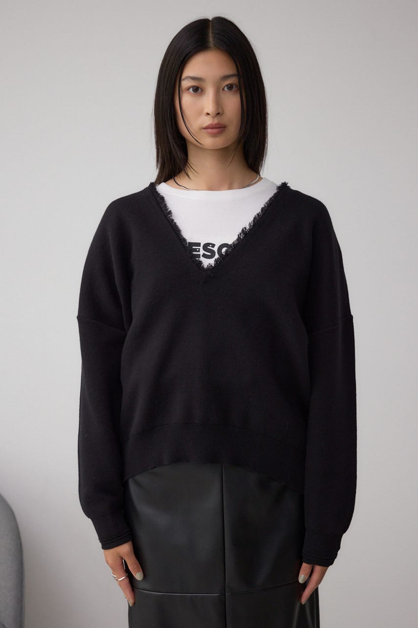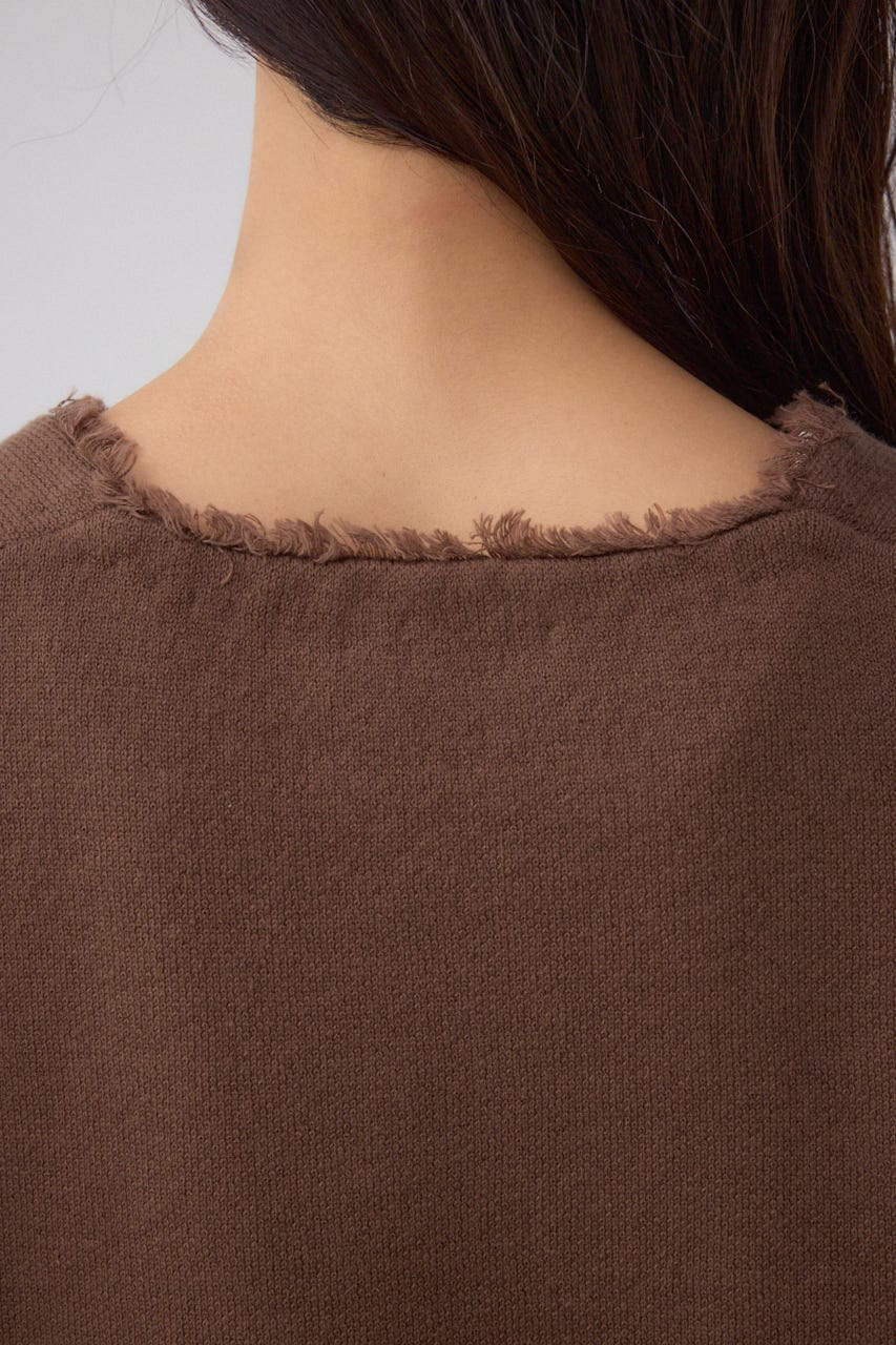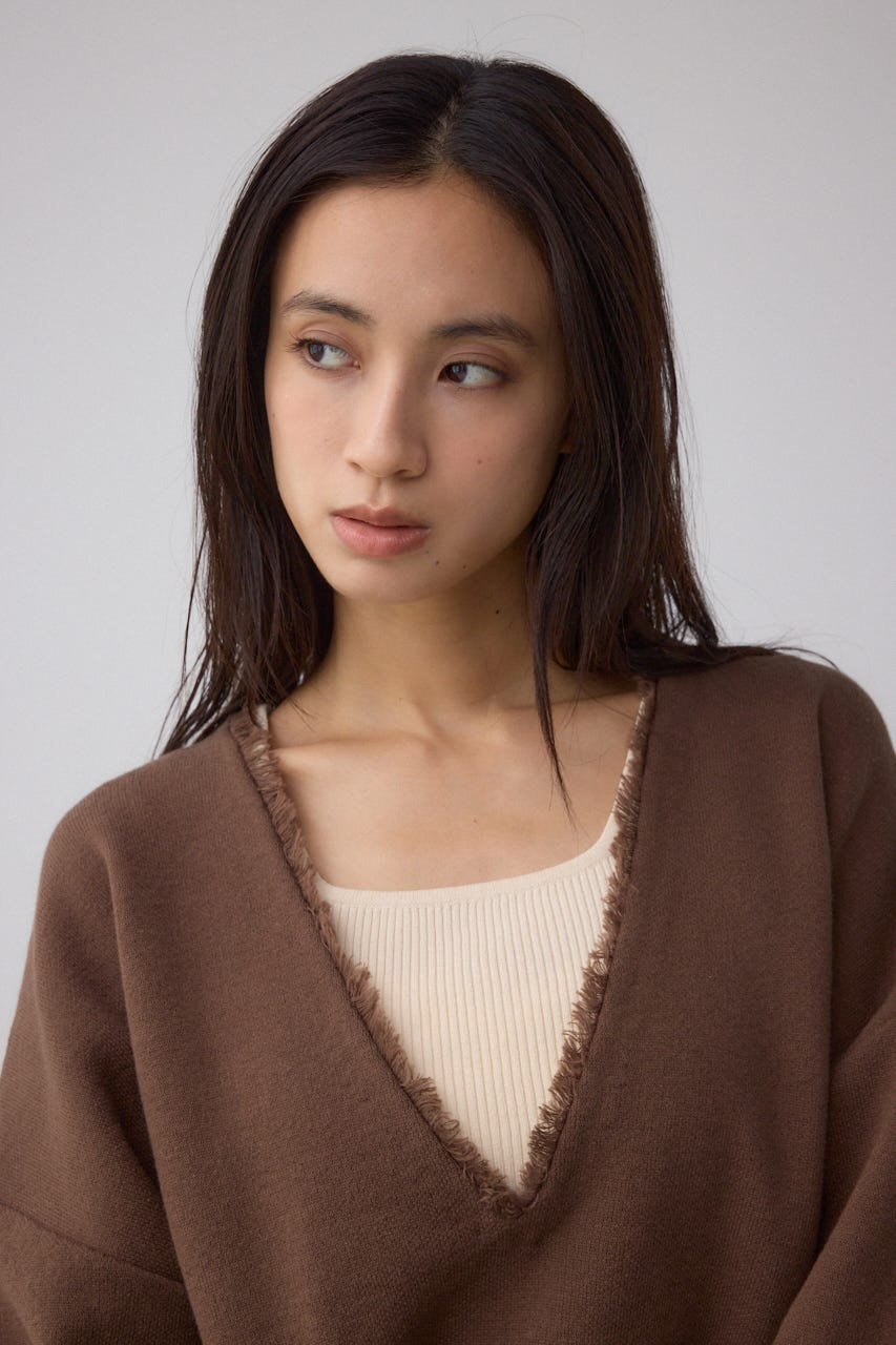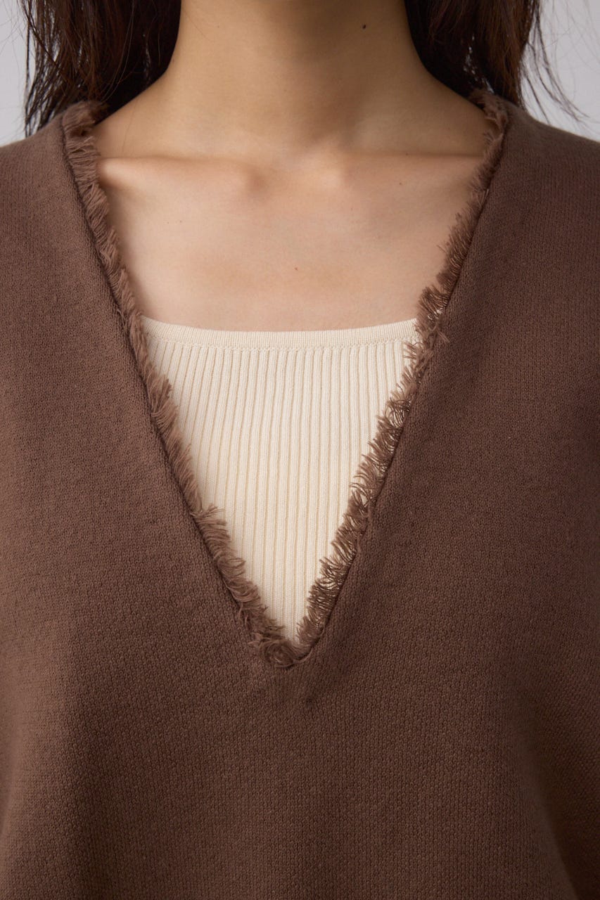 ネックラインにフリンジを施し、シンプルながらもさりげないアクセントをプラス。