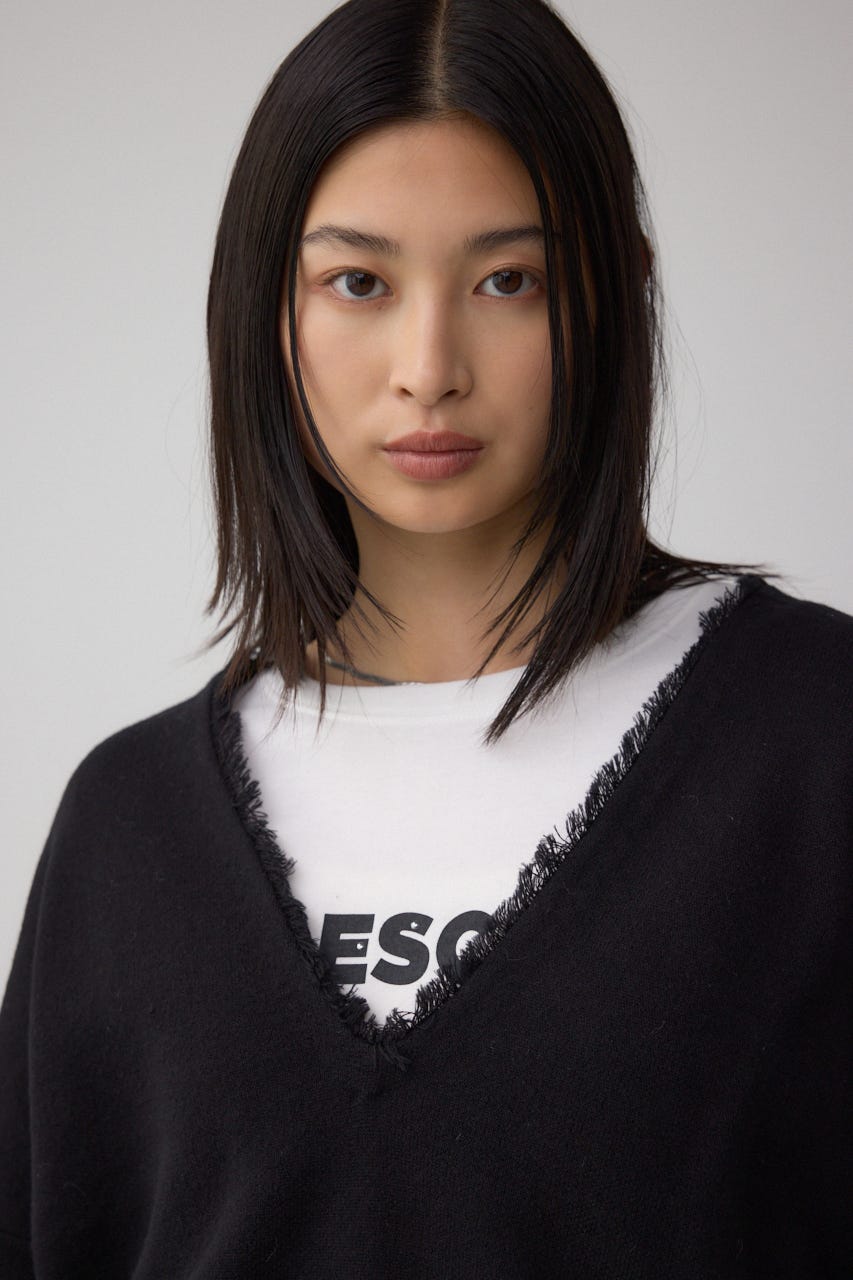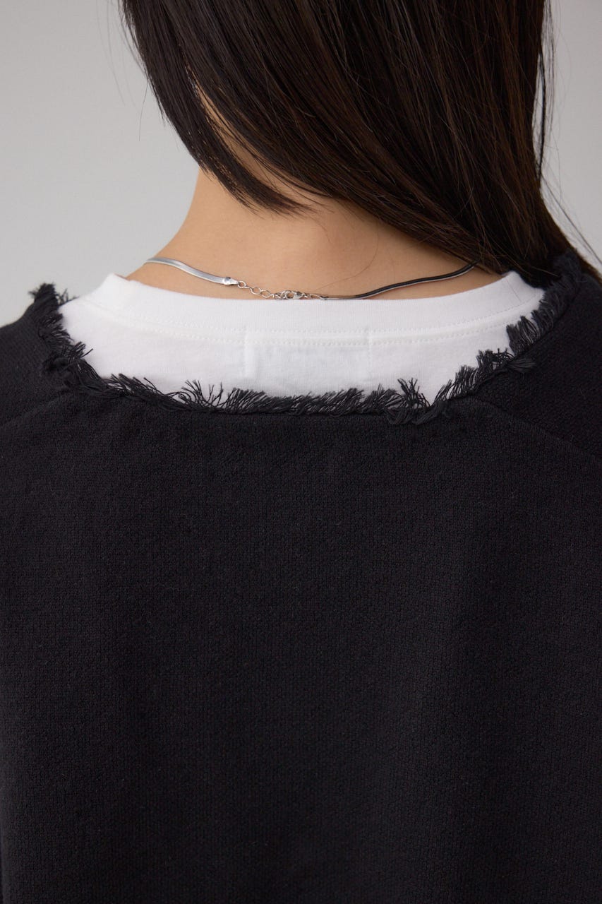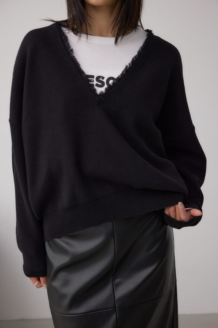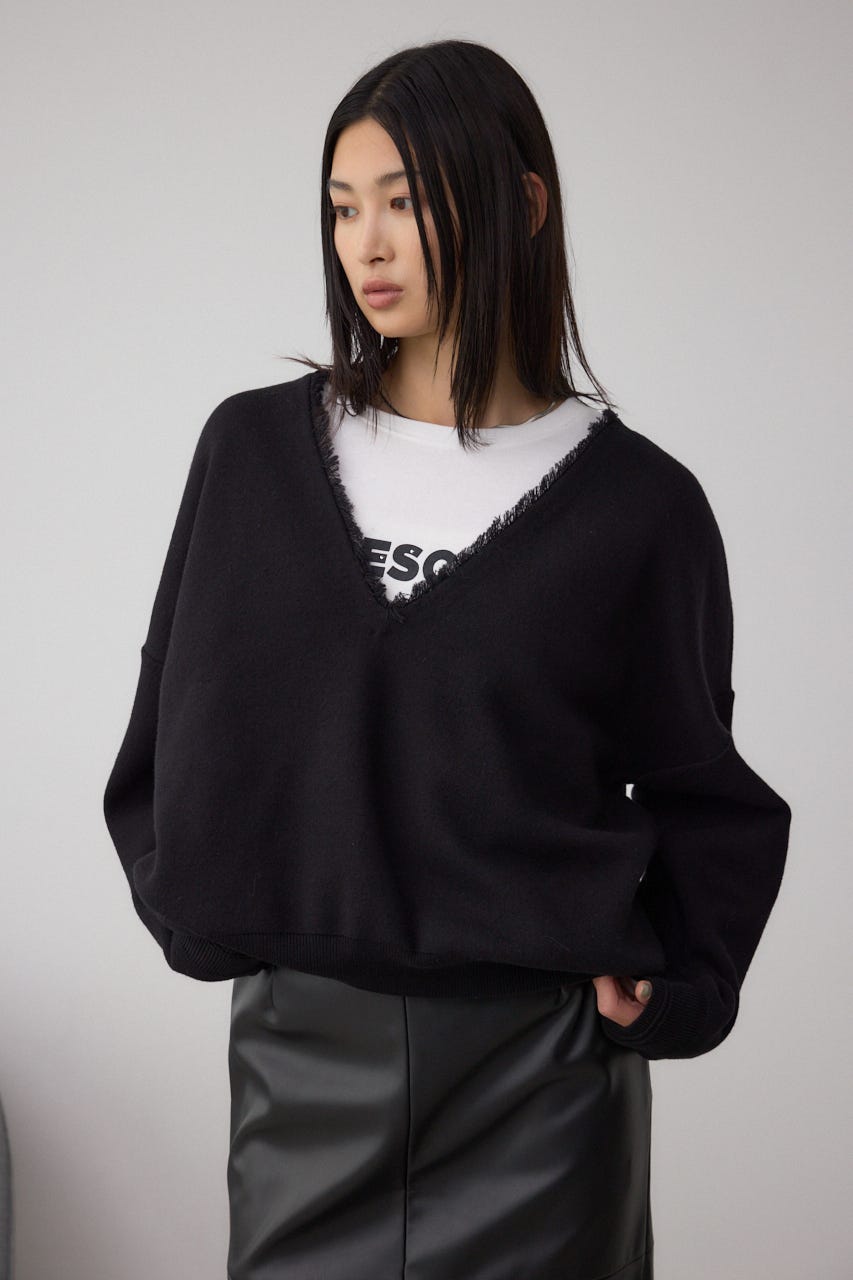 ネックラインにフリンジを施し、シンプルながらもさりげないアクセントをプラス。