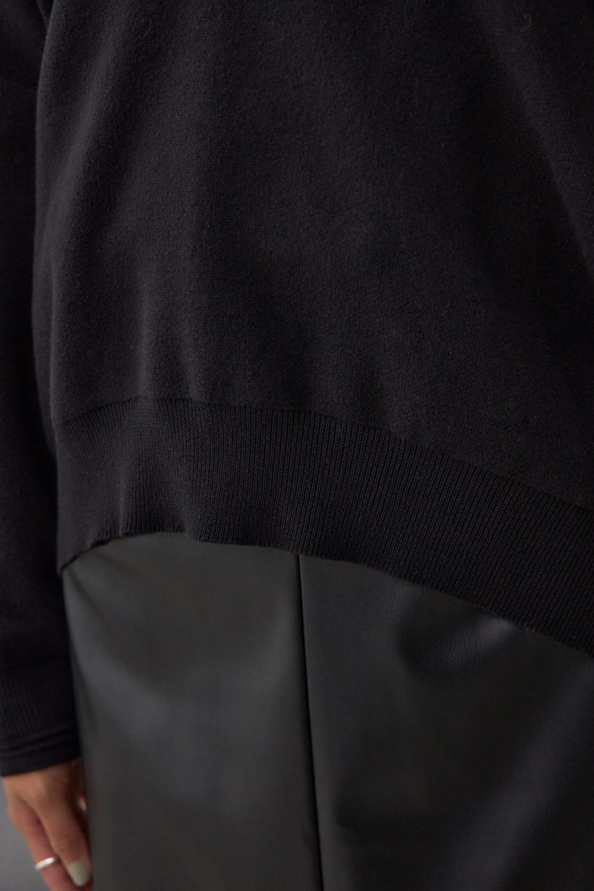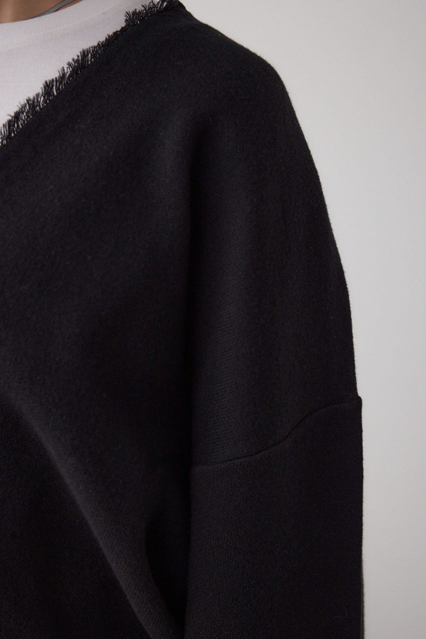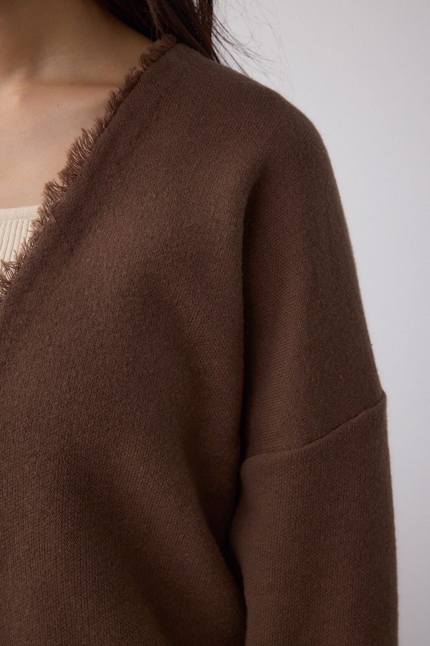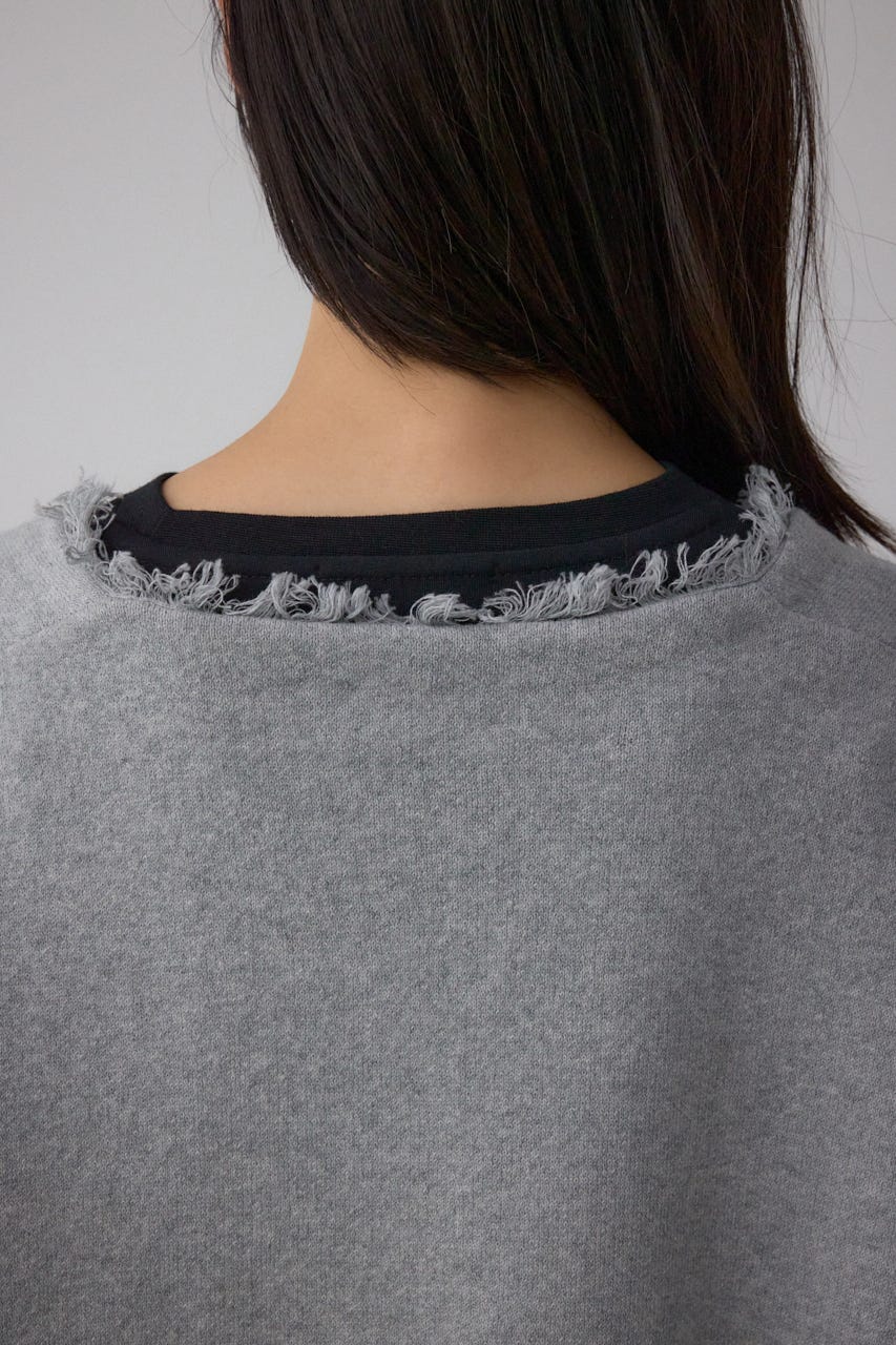 ネックラインにフリンジを施し、シンプルながらもさりげないアクセントをプラス。