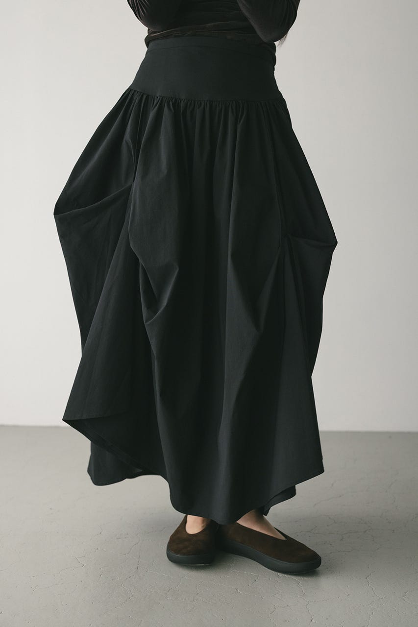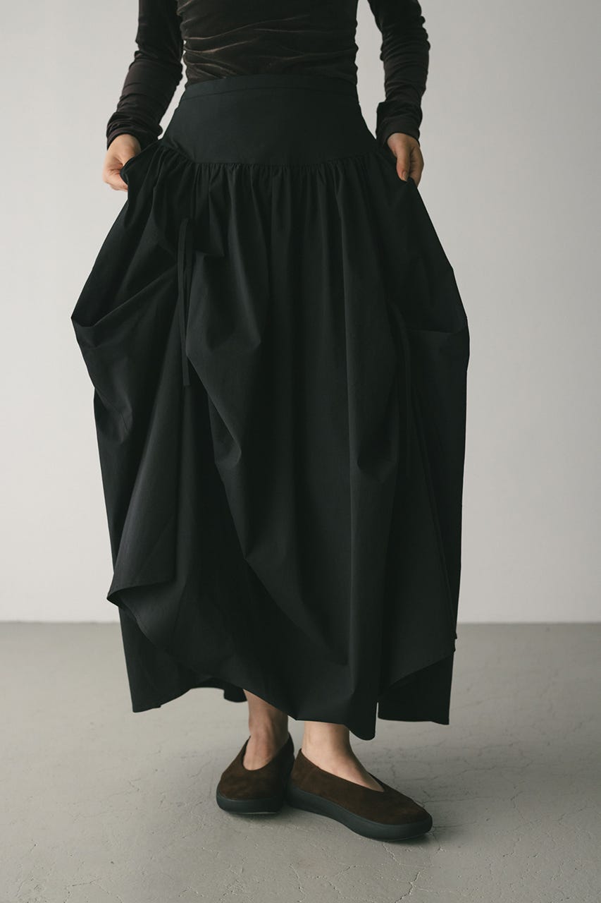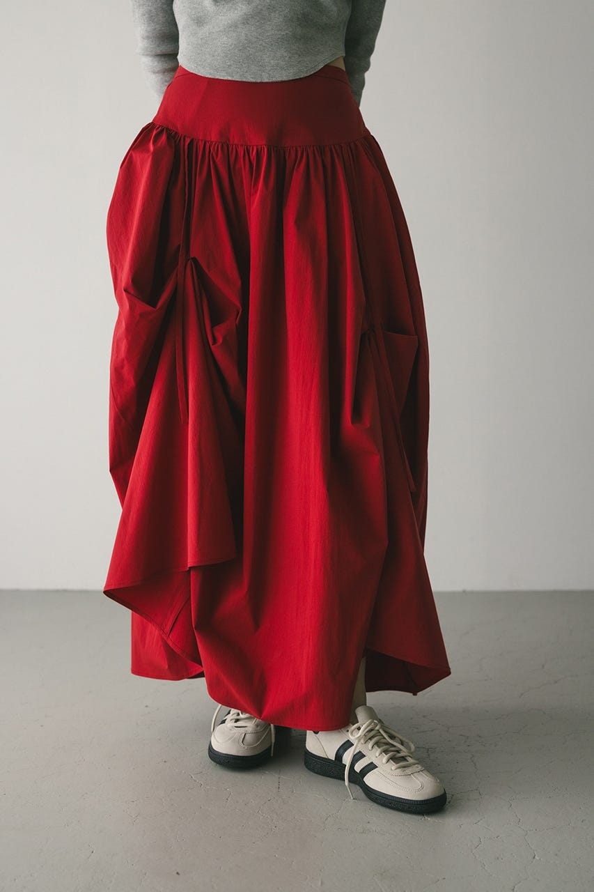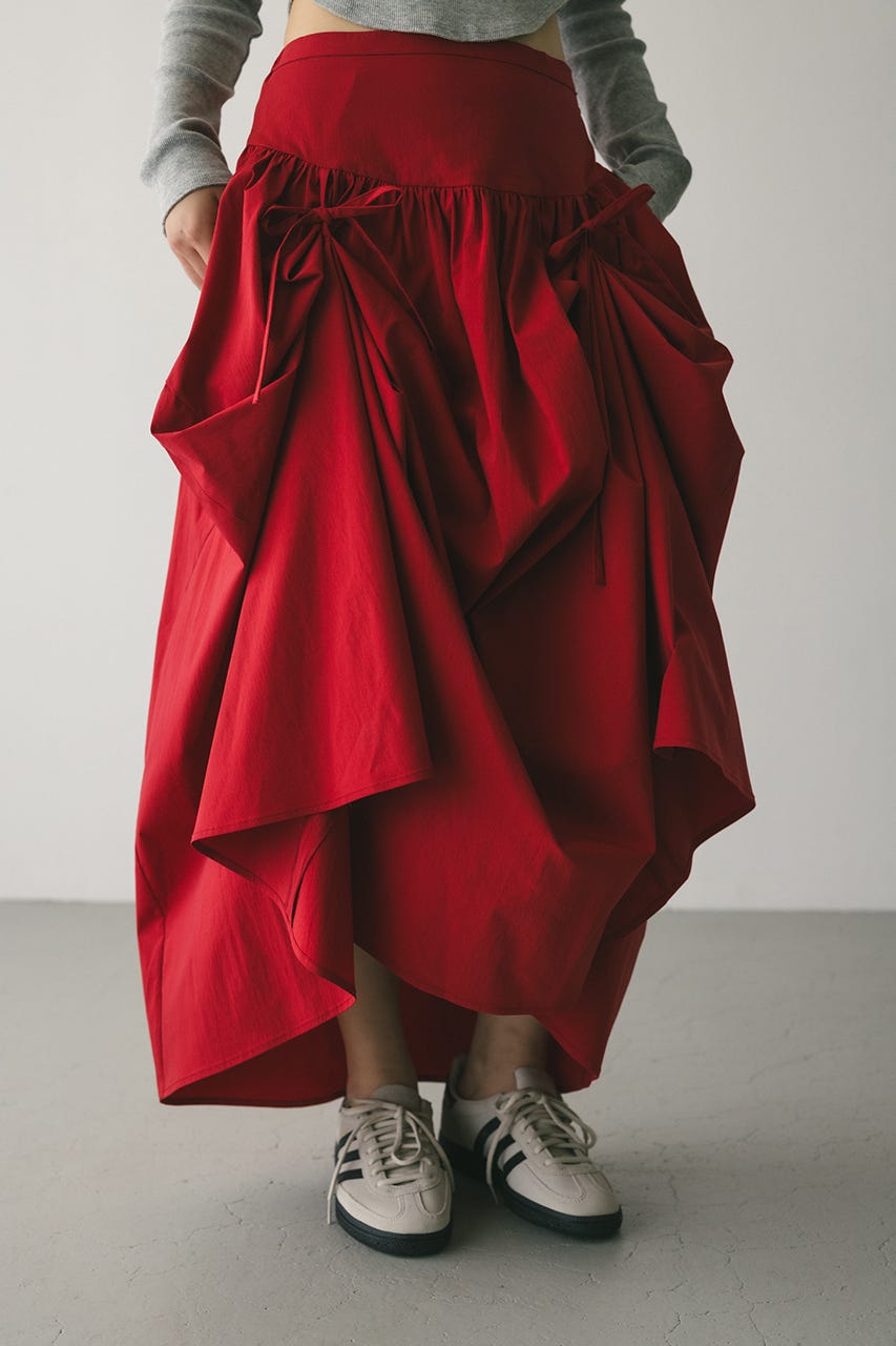 トレンド感のあるボリュームとポイントになるリボン結びで作られるタックがユニークなデザインに導くロングスカート。