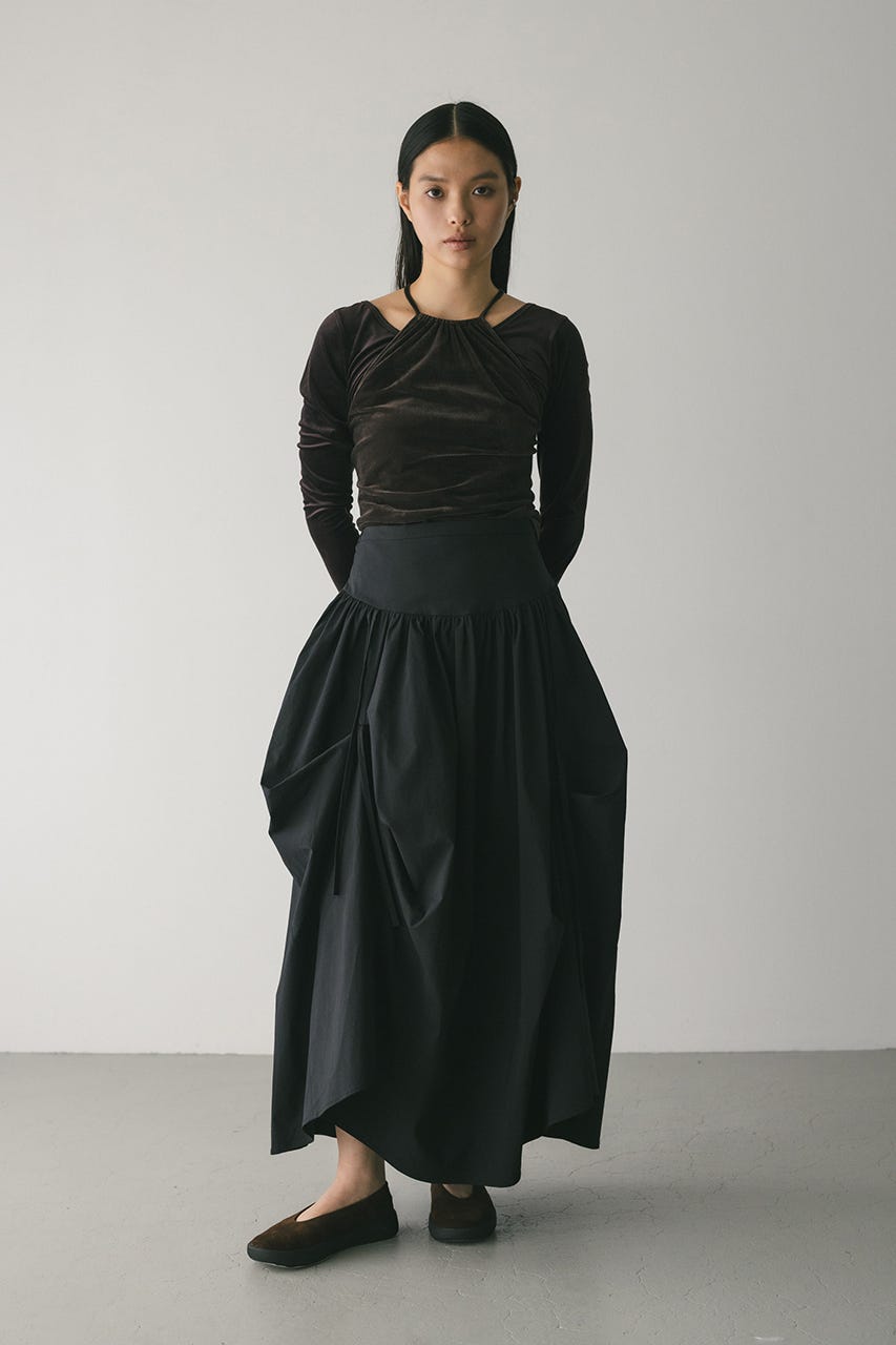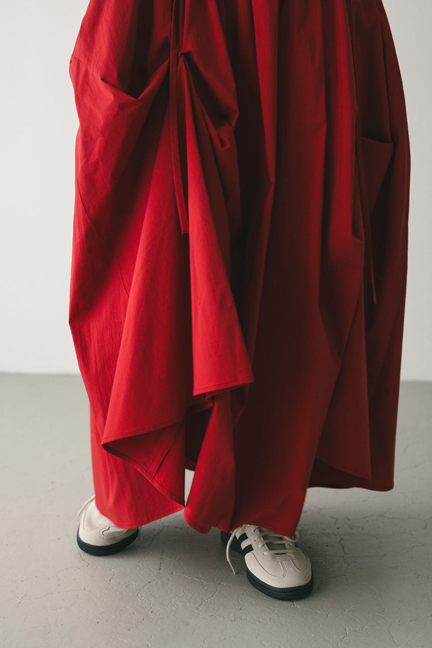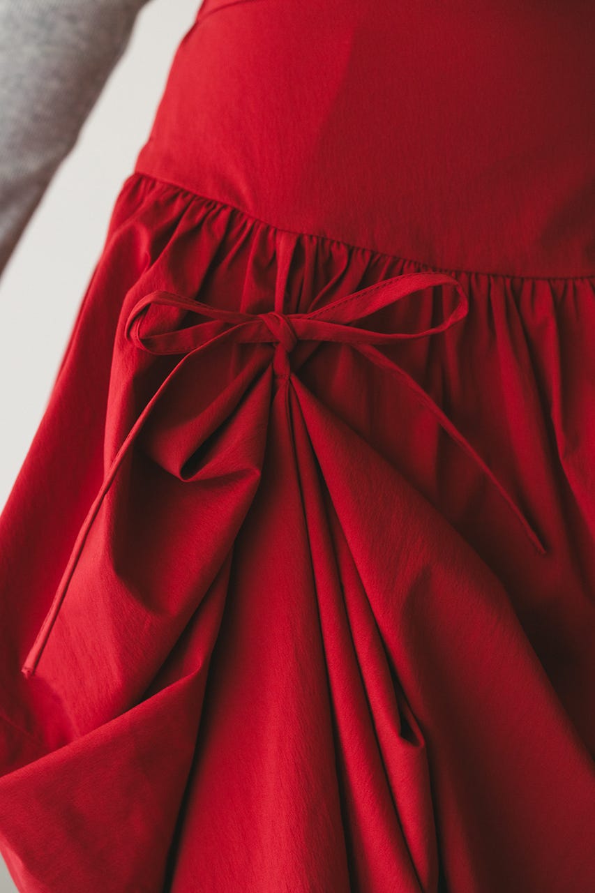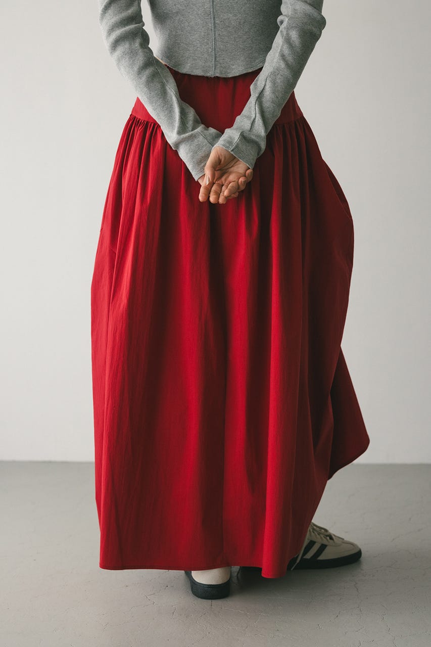 トレンド感のあるボリュームとポイントになるリボン結びで作られるタックがユニークなデザインに導くロングスカート。