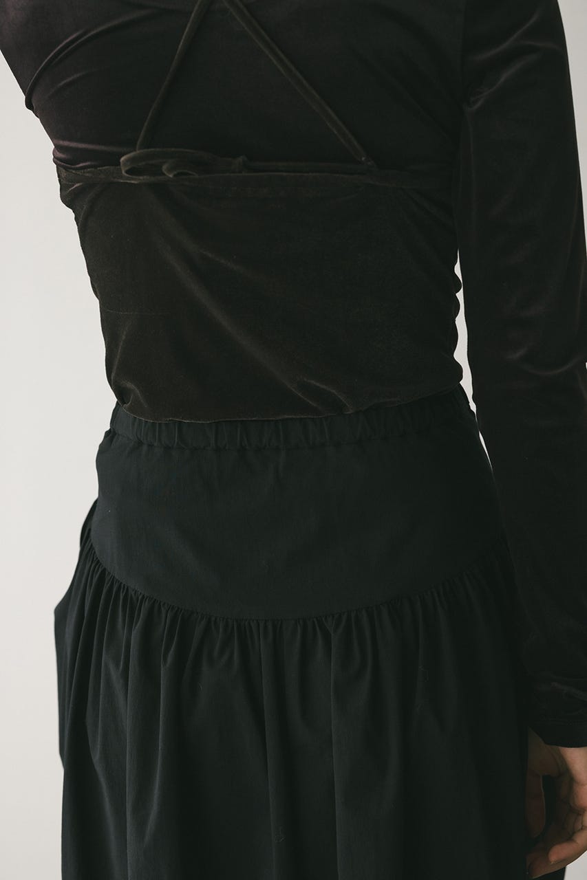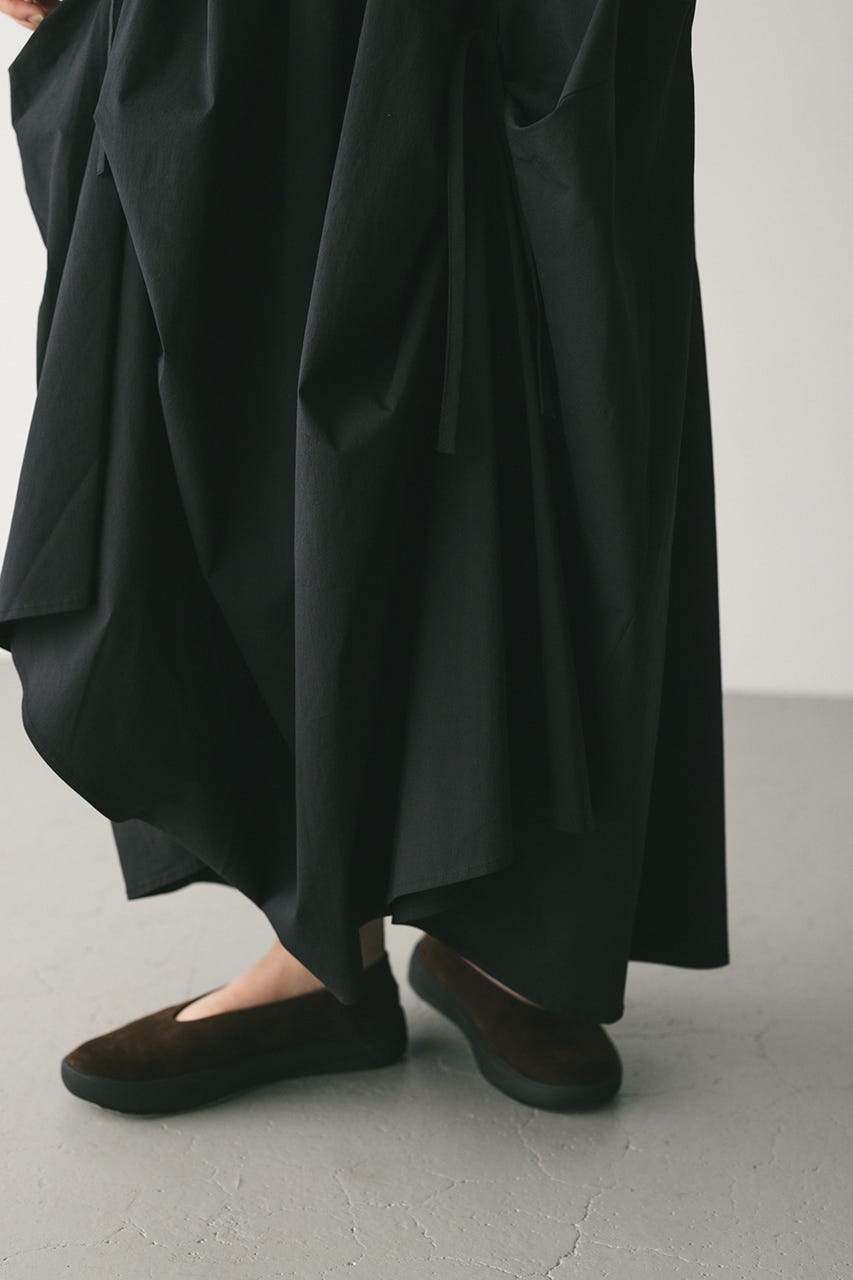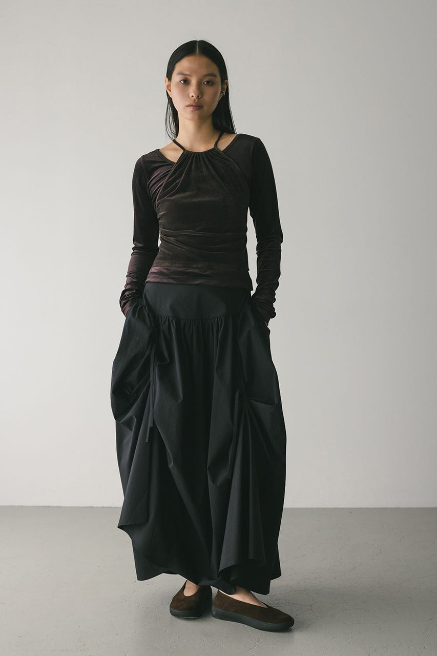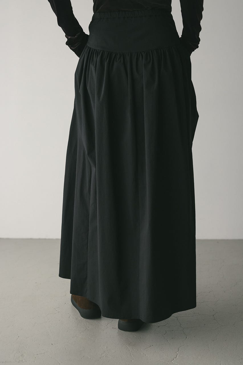 トレンド感のあるボリュームとポイントになるリボン結びで作られるタックがユニークなデザインに導くロングスカート。