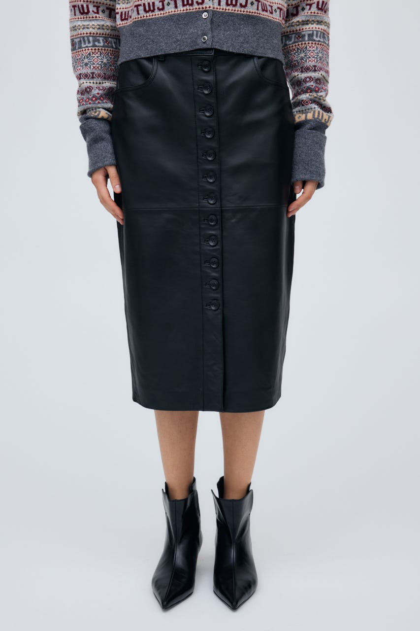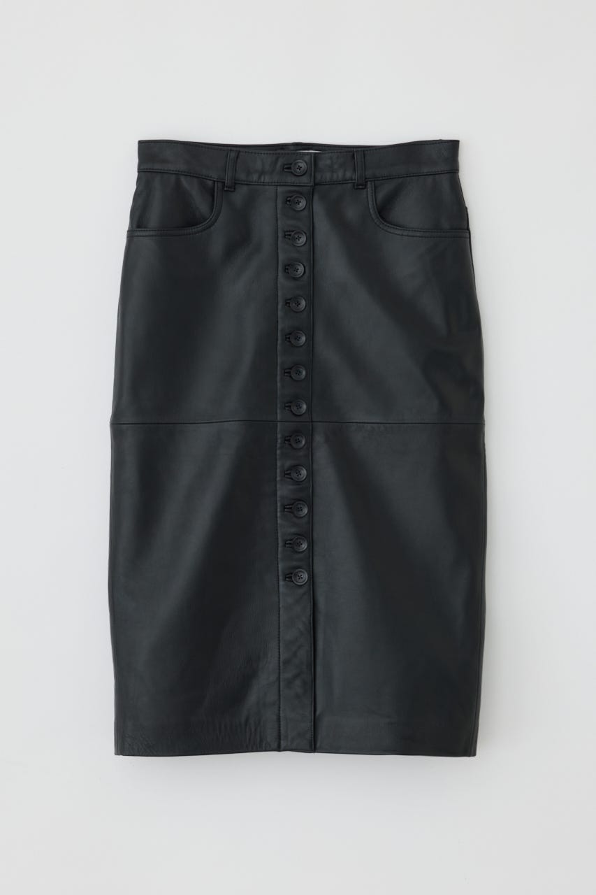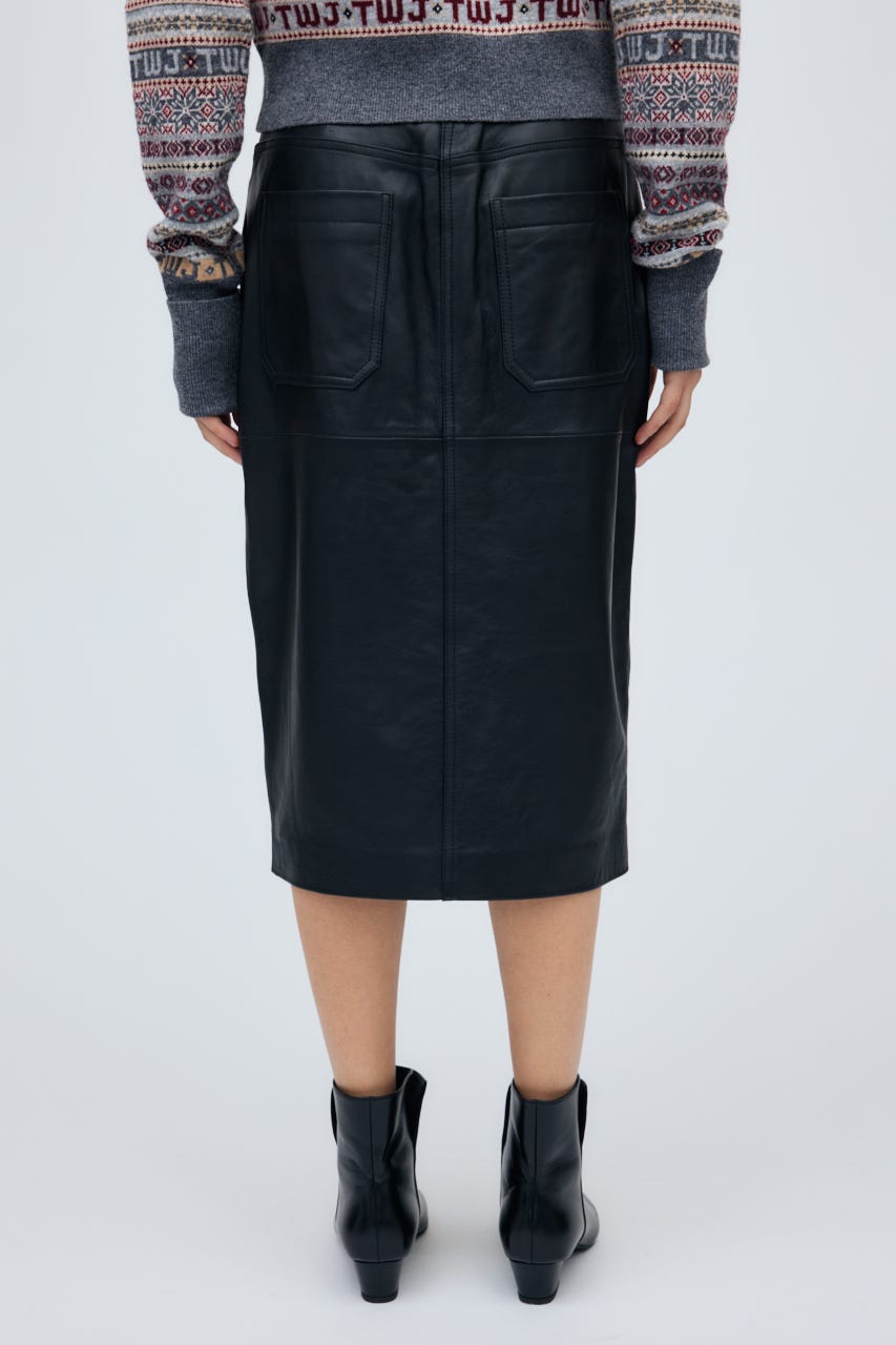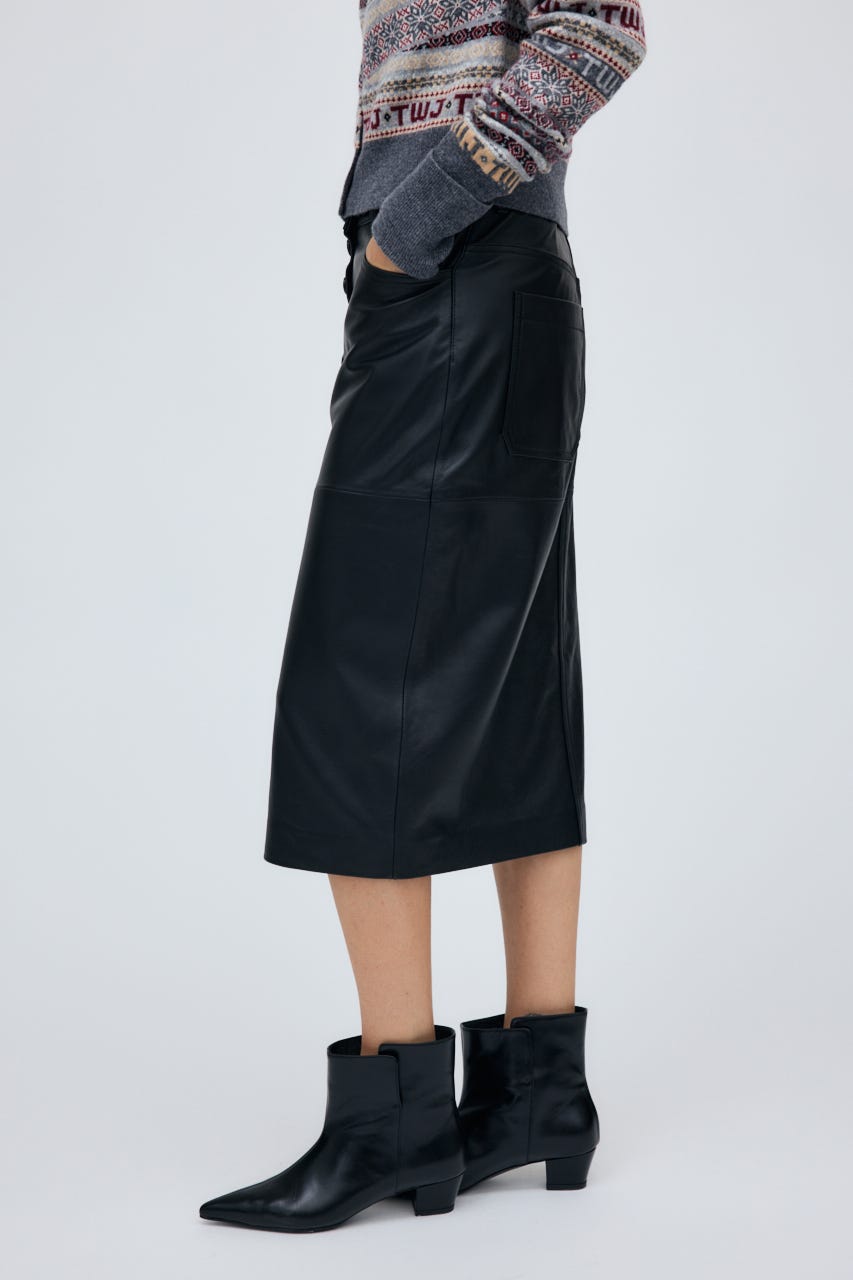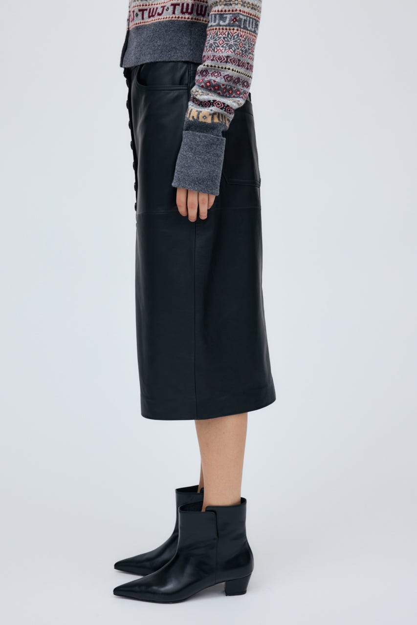 セミマットでフラットな表面感とソフトでスムーズな手触りが特徴的なラムレザーを使用したスカート。