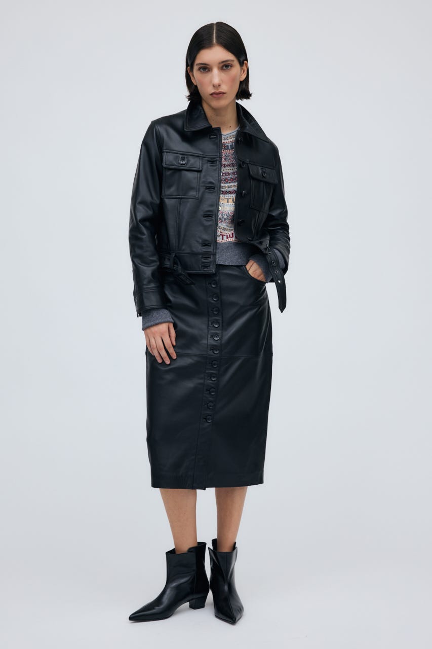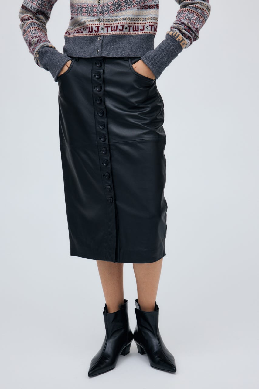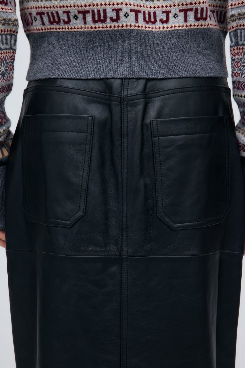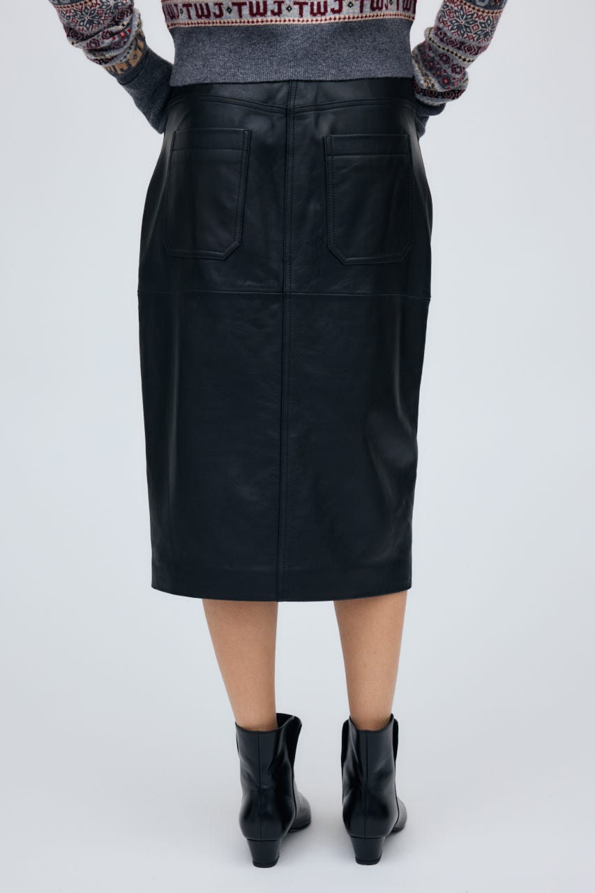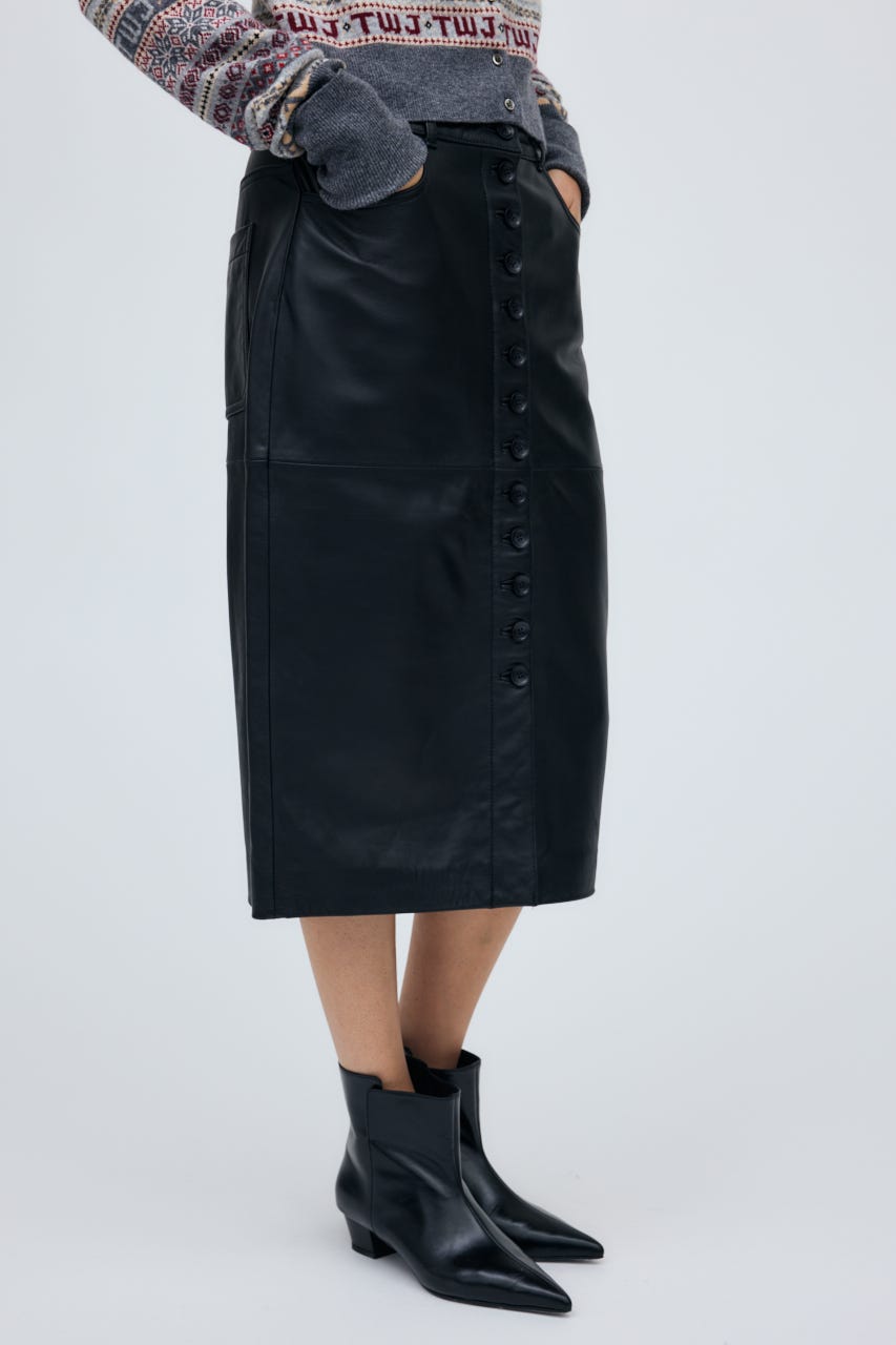 セミマットでフラットな表面感とソフトでスムーズな手触りが特徴的なラムレザーを使用したスカート。