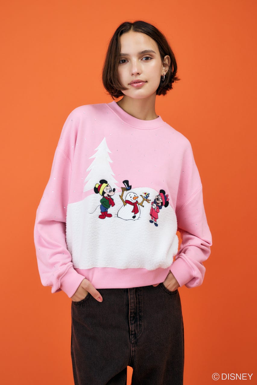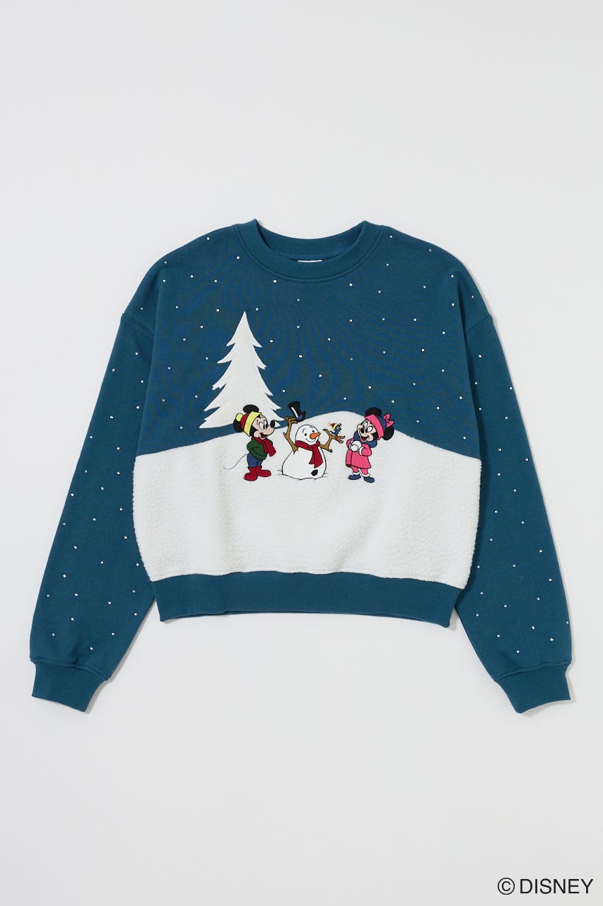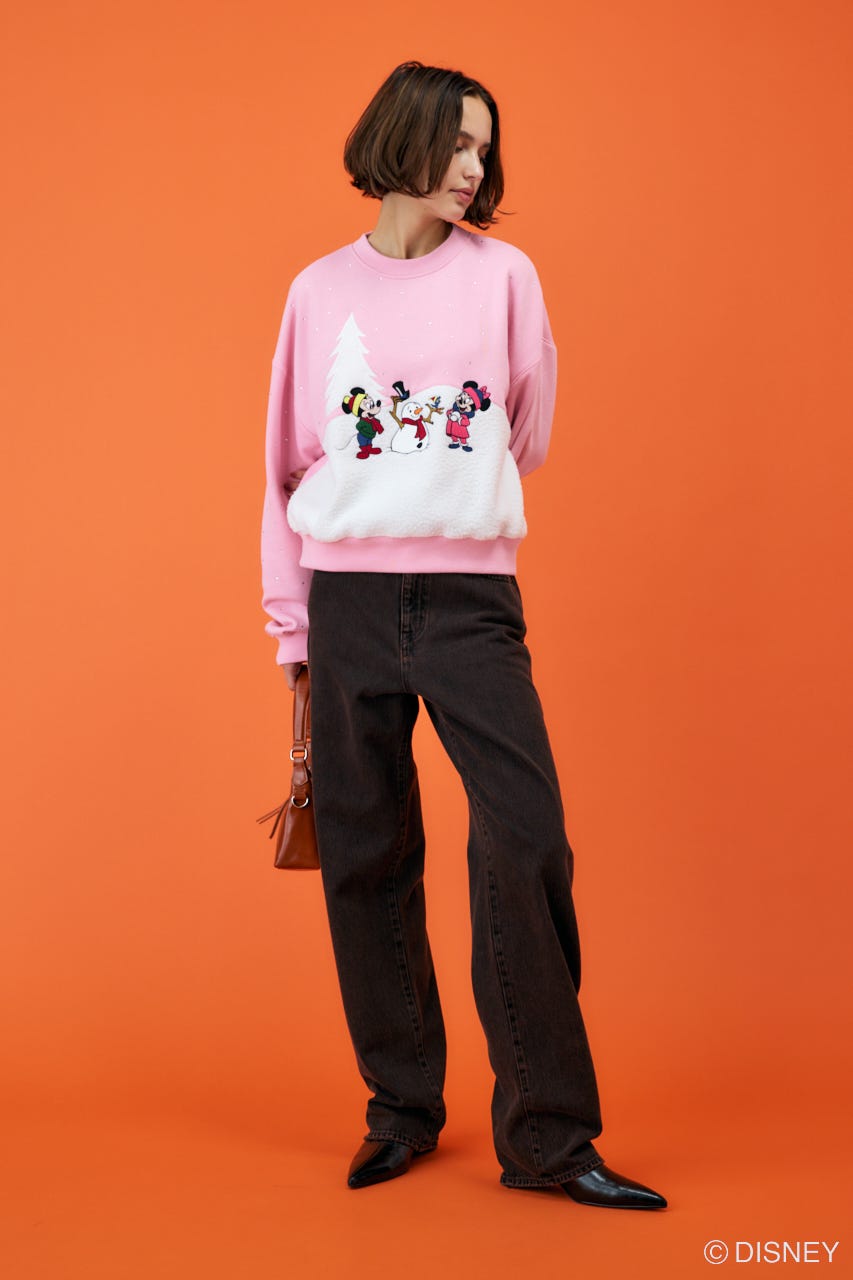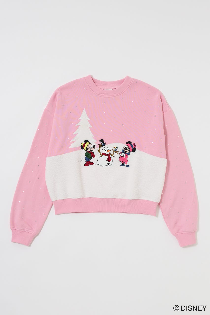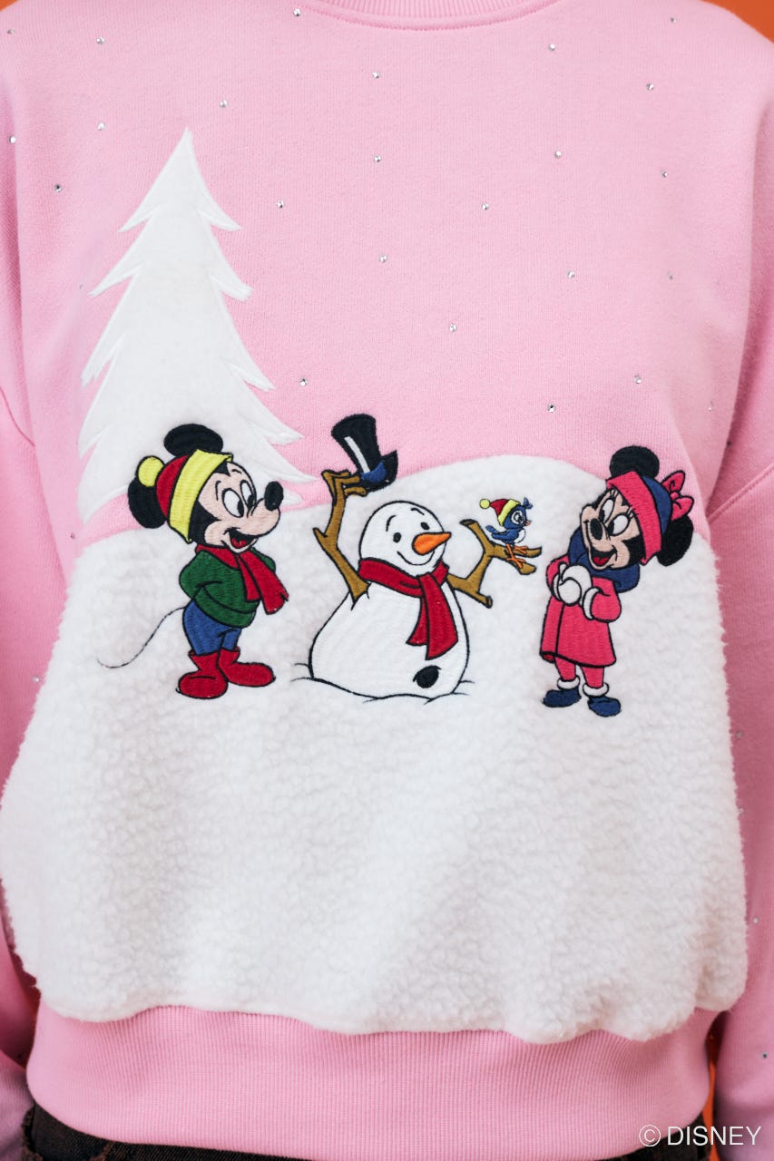 ■POINT:雪山で遊んでいるミッキーとミニー、雪だるまのデザインがレトロでとってもかわいいスウェット。