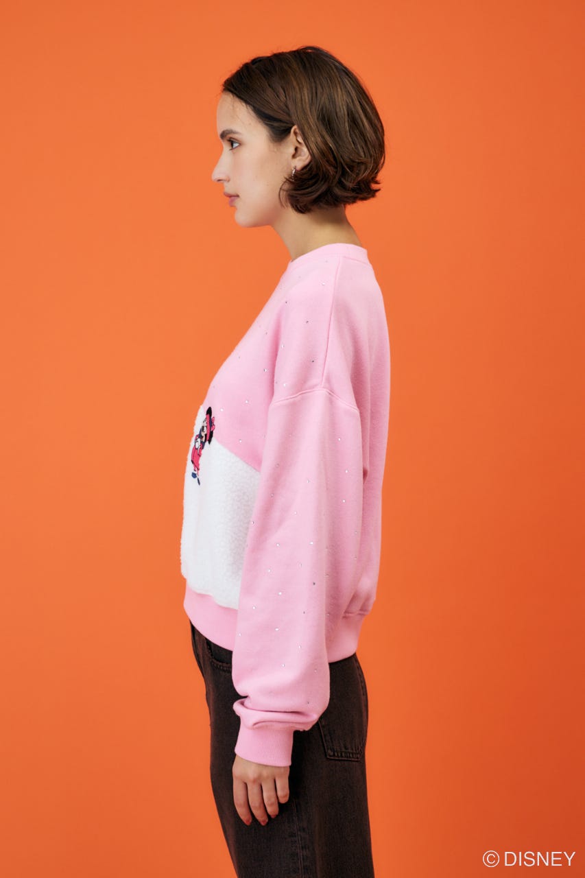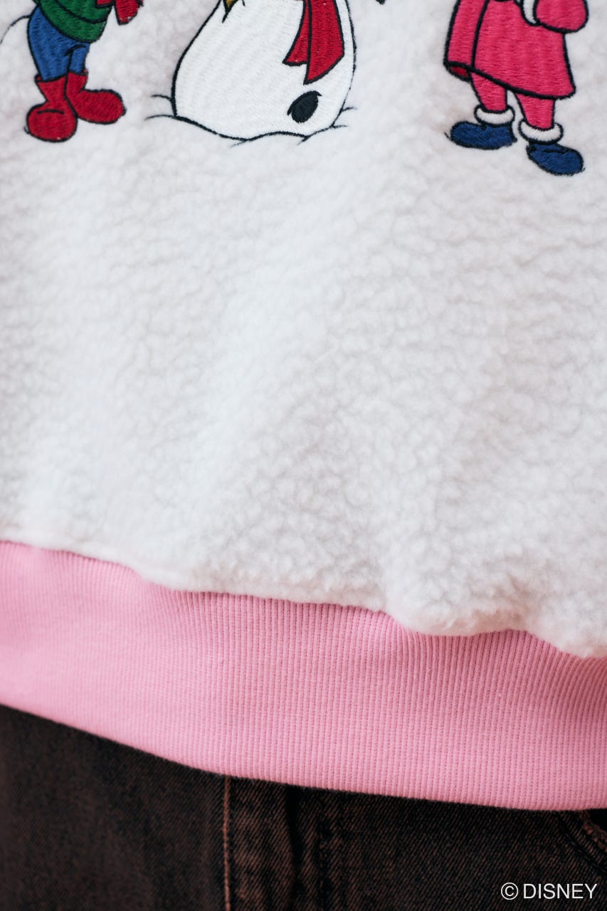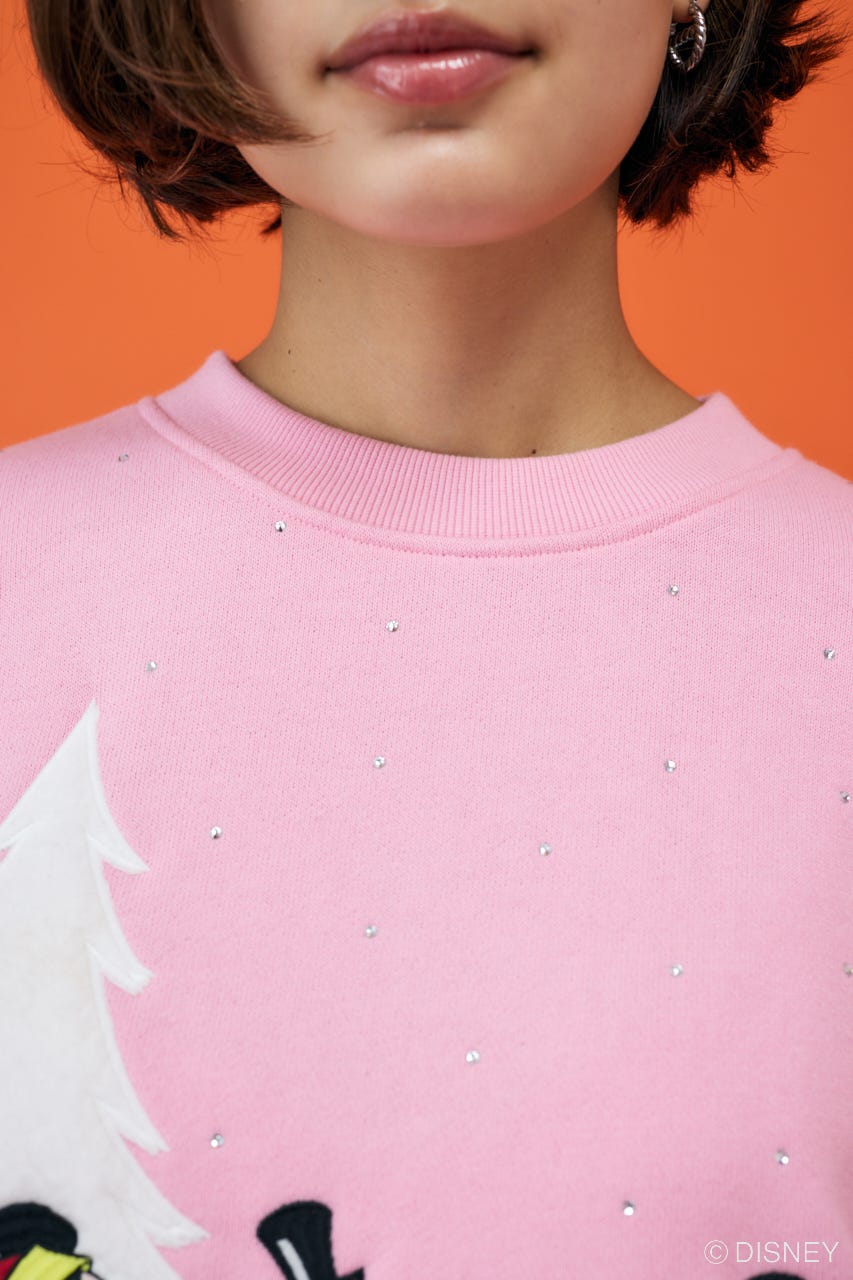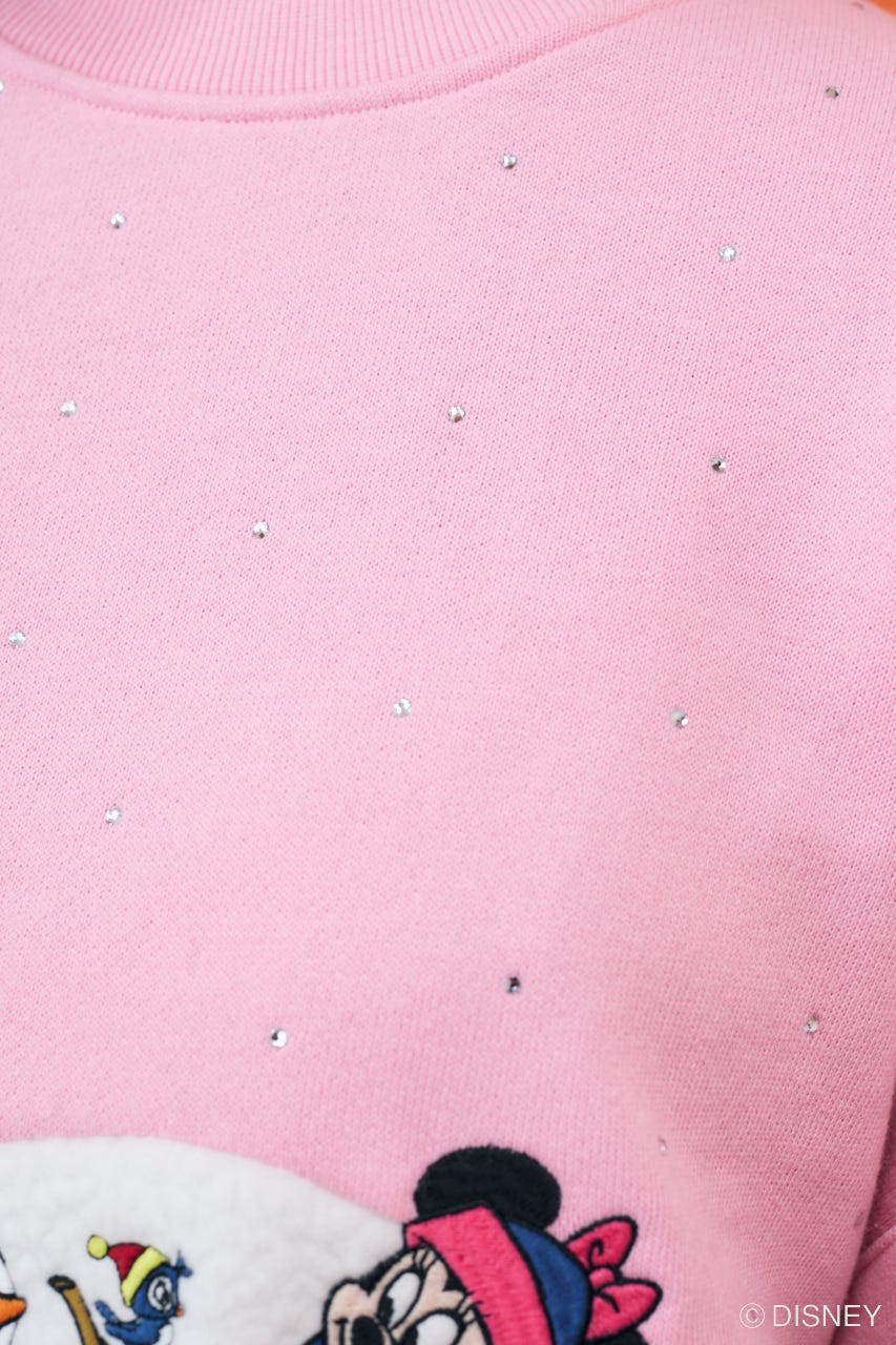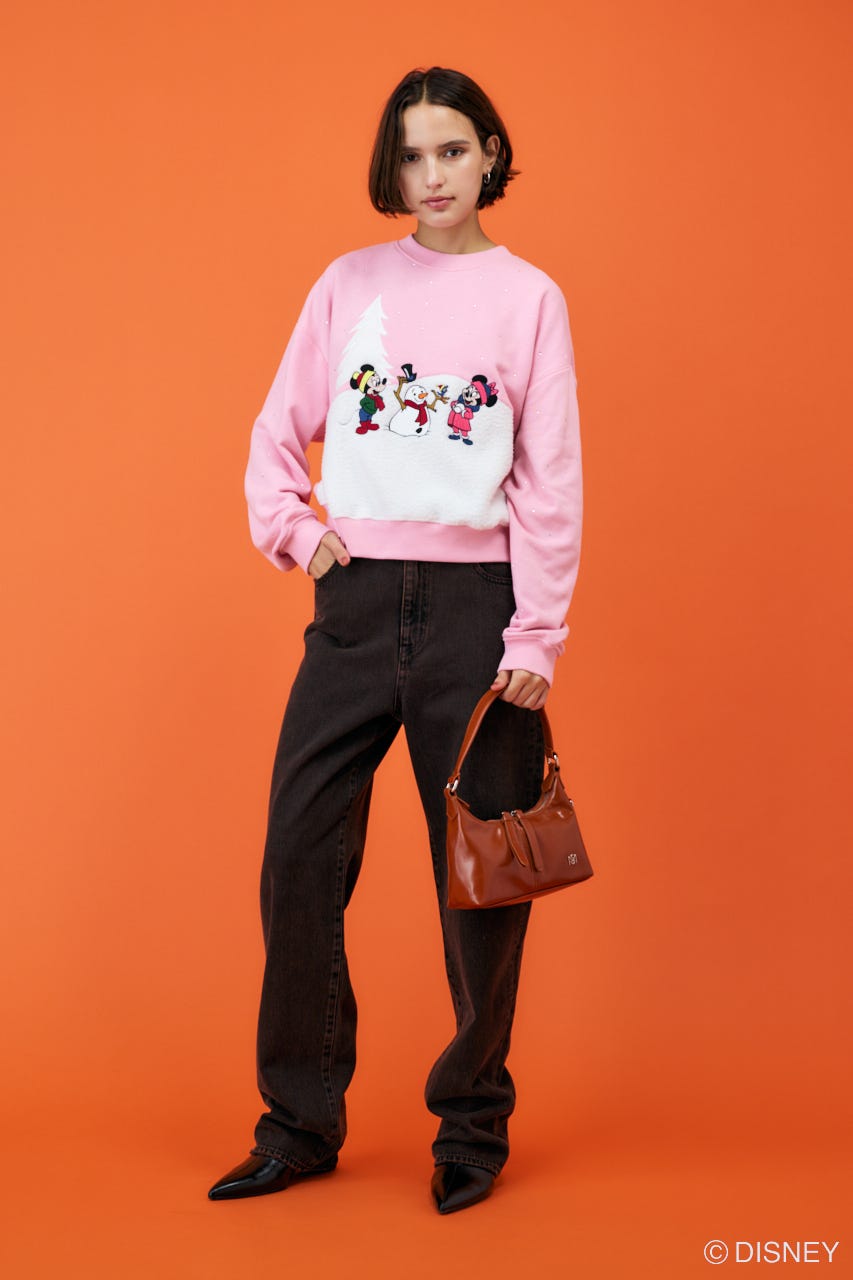 ■POINT:雪山で遊んでいるミッキーとミニー、雪だるまのデザインがレトロでとってもかわいいスウェット。