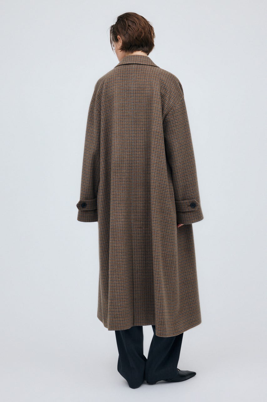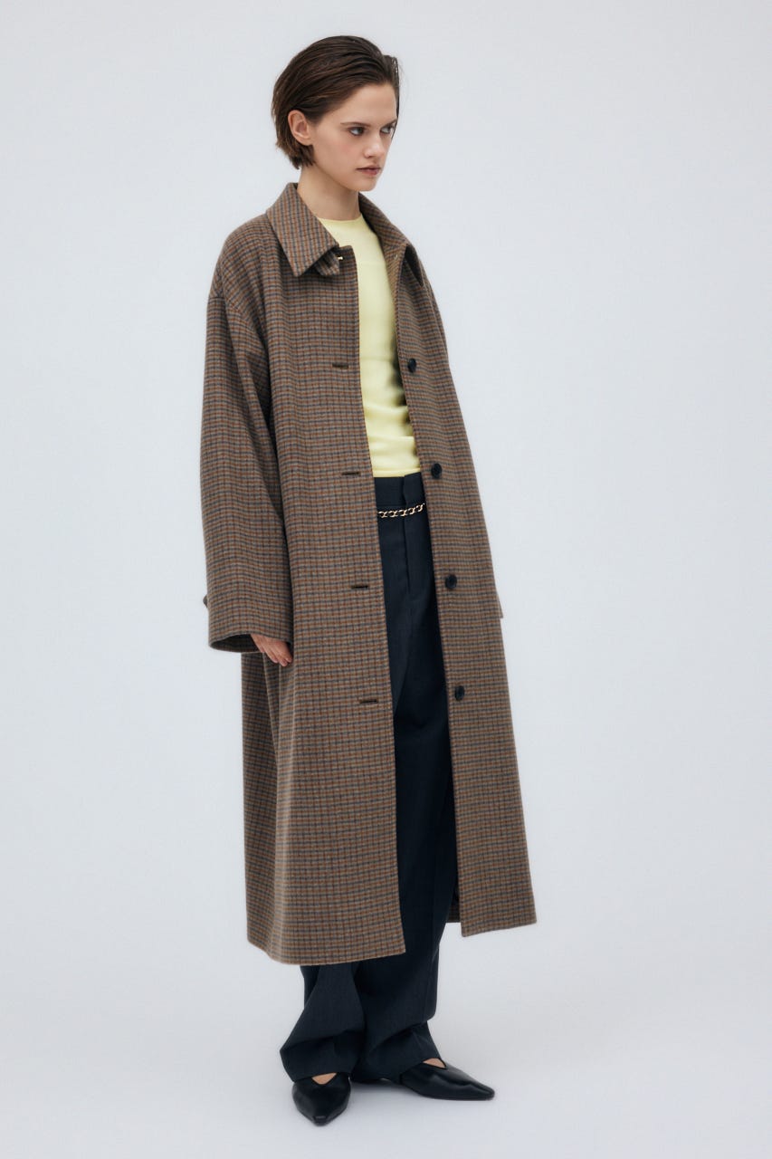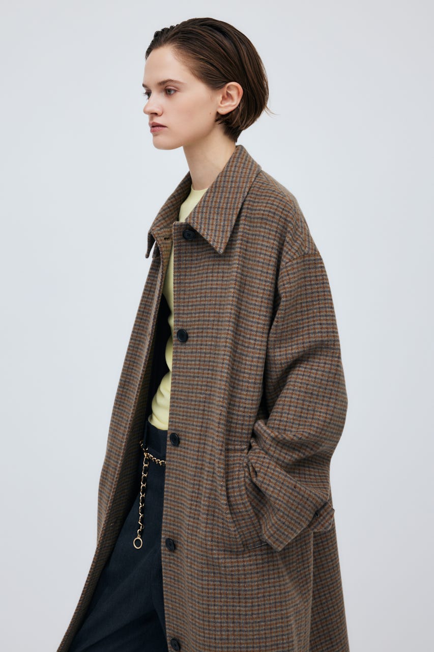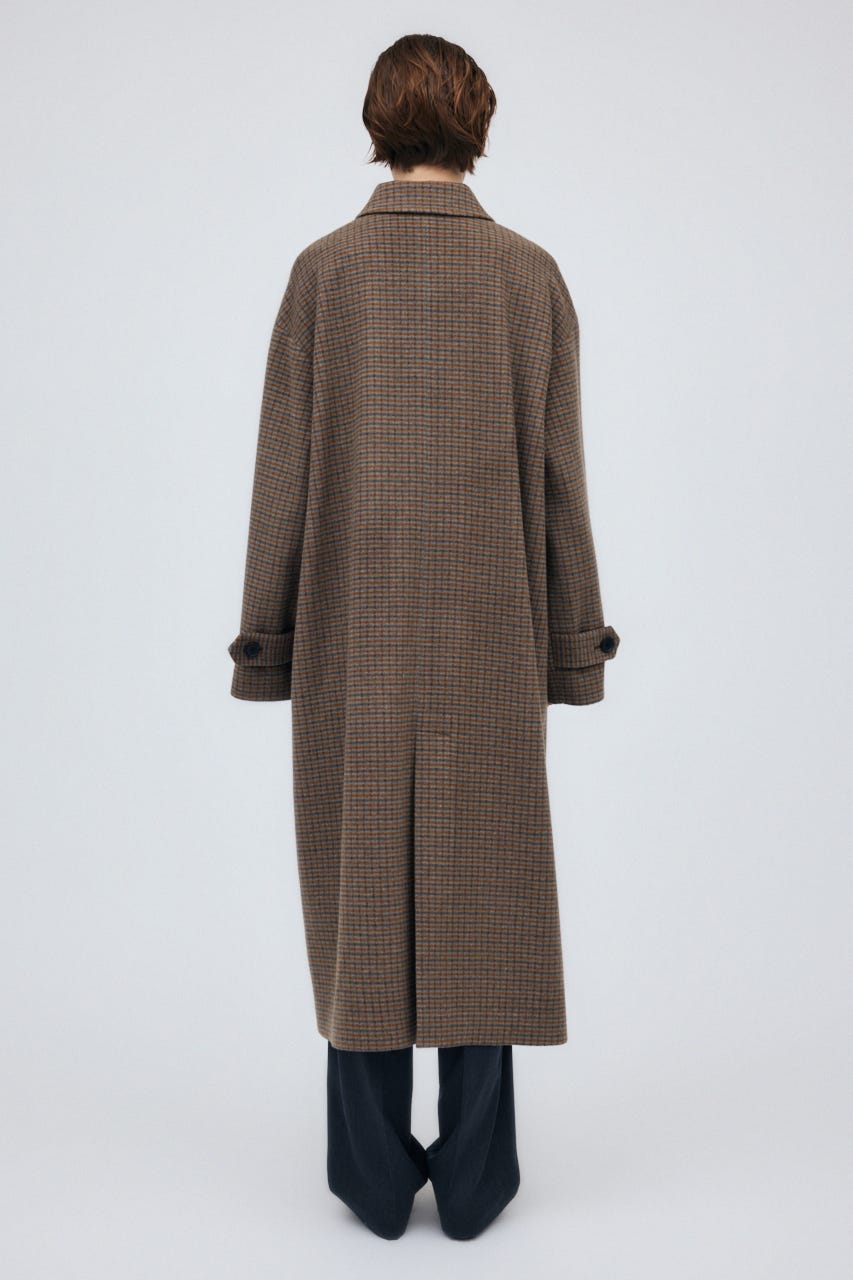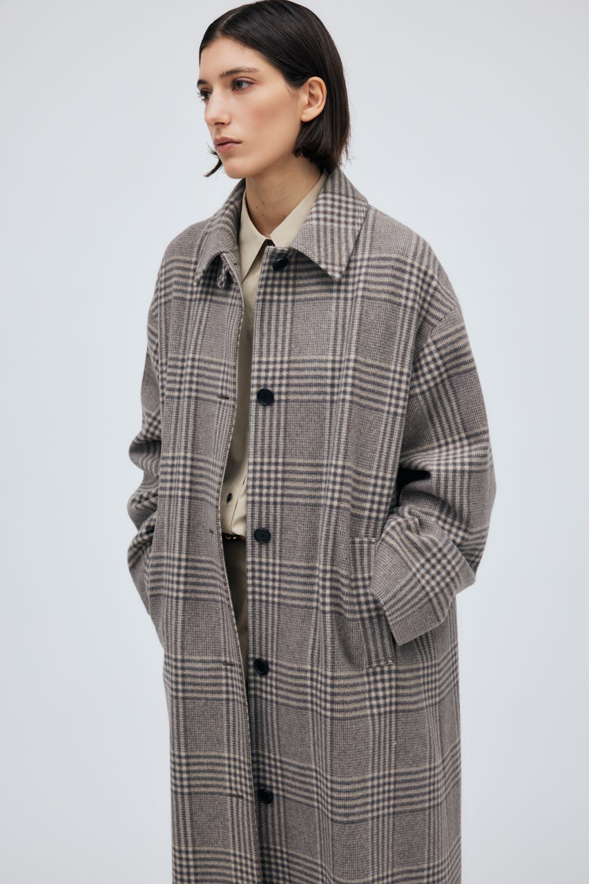 ウールならではの上質な風合いと暖かさ、軽さが特長のマキシ丈のコートは厚手ニットの上にも着やすいオーバーサイズ。