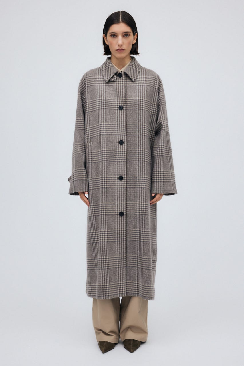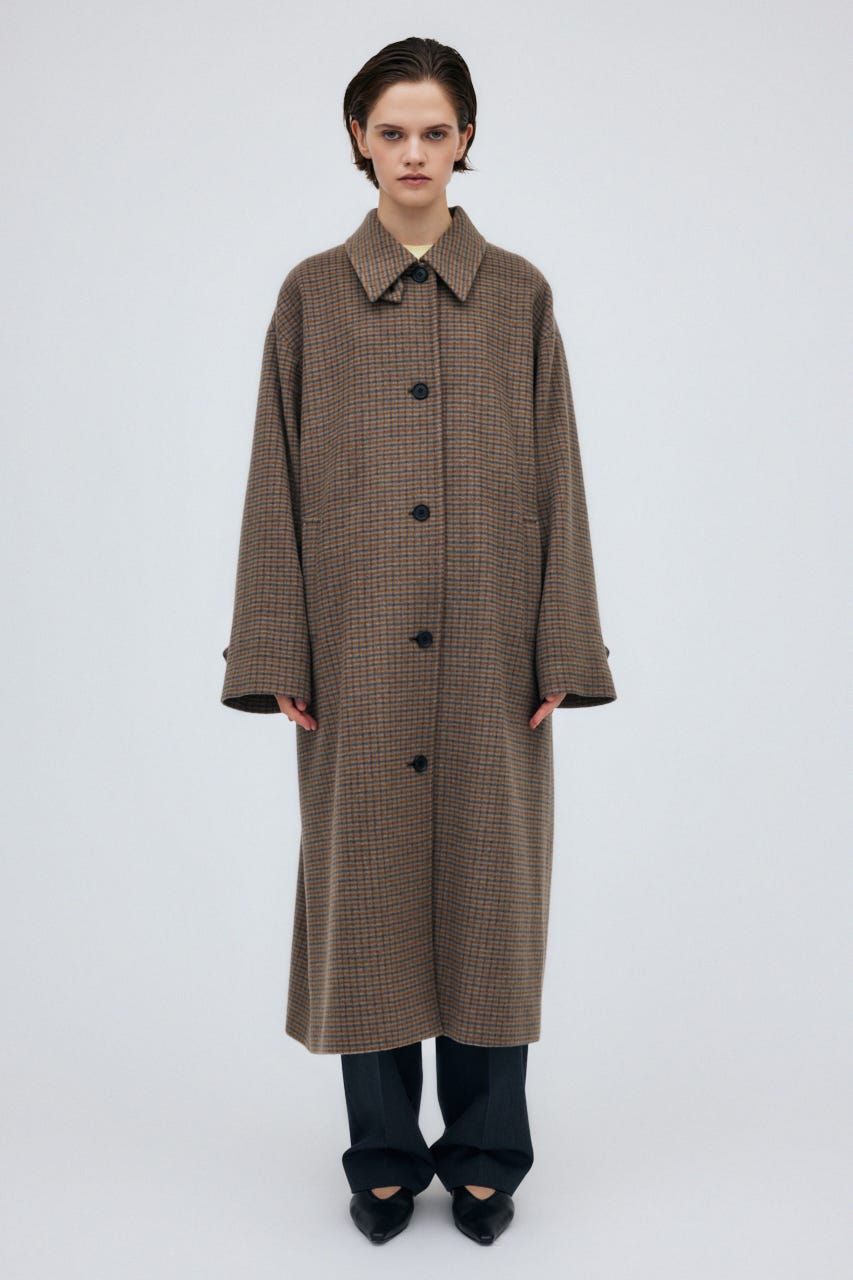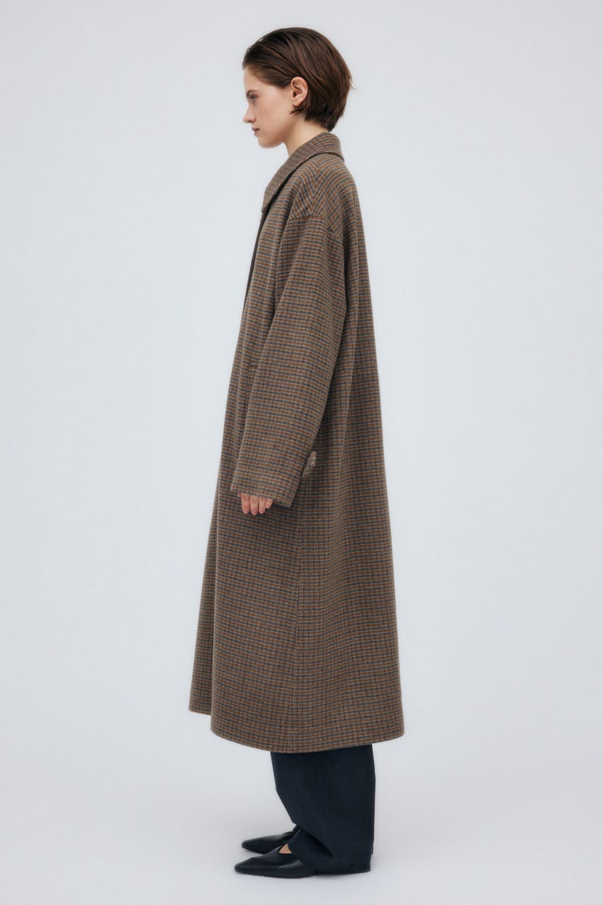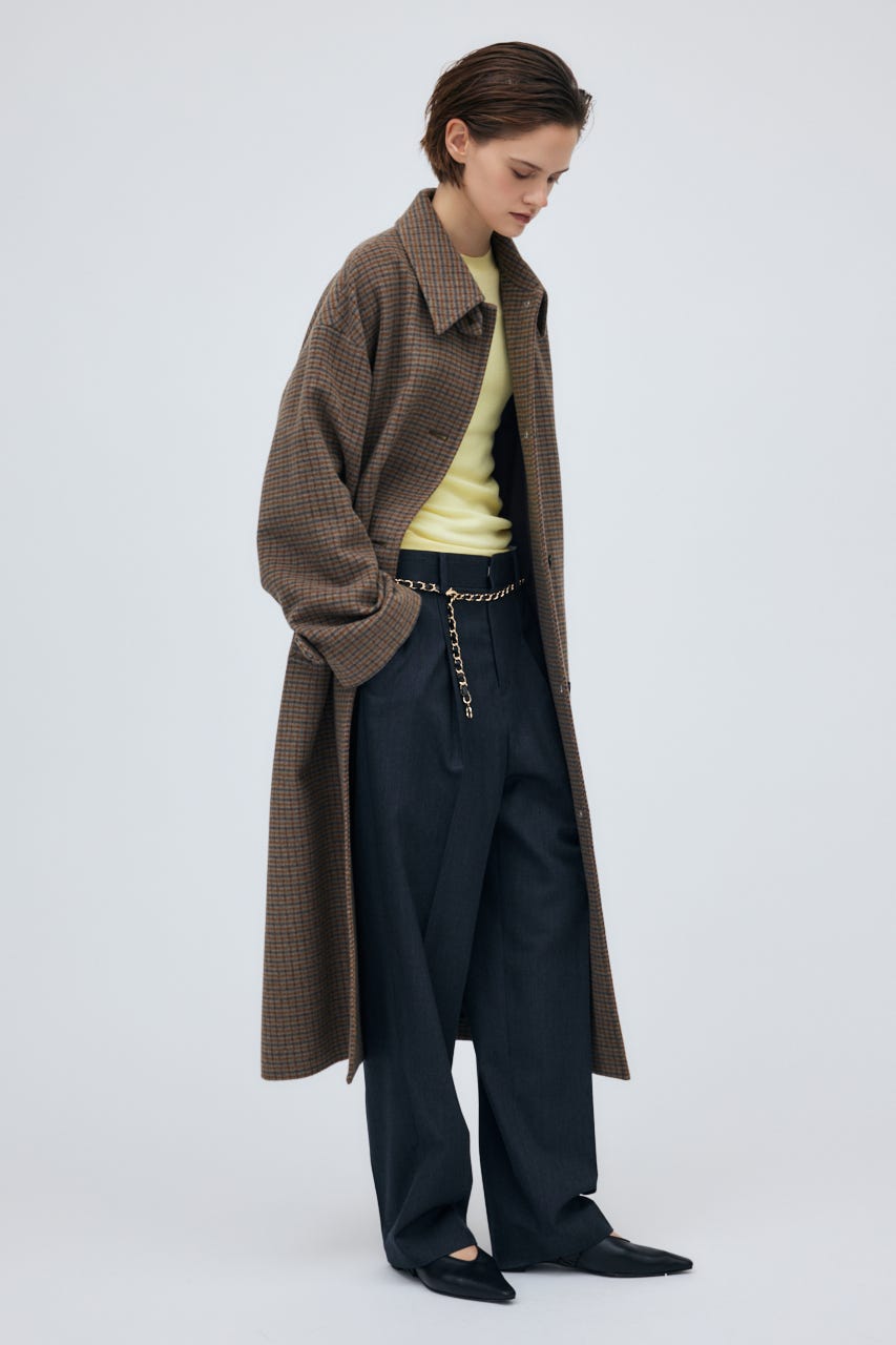 ウールならではの上質な風合いと暖かさ、軽さが特長のマキシ丈のコートは厚手ニットの上にも着やすいオーバーサイズ。