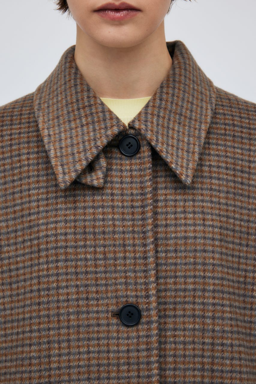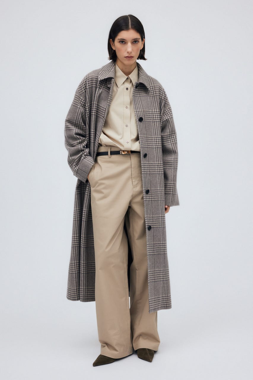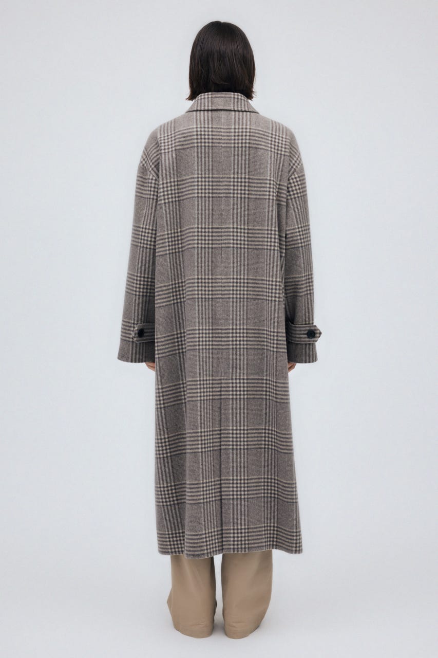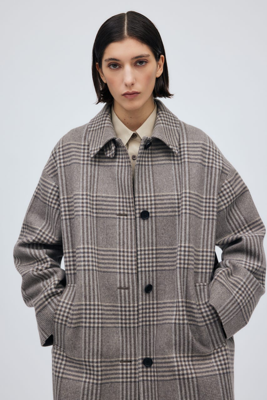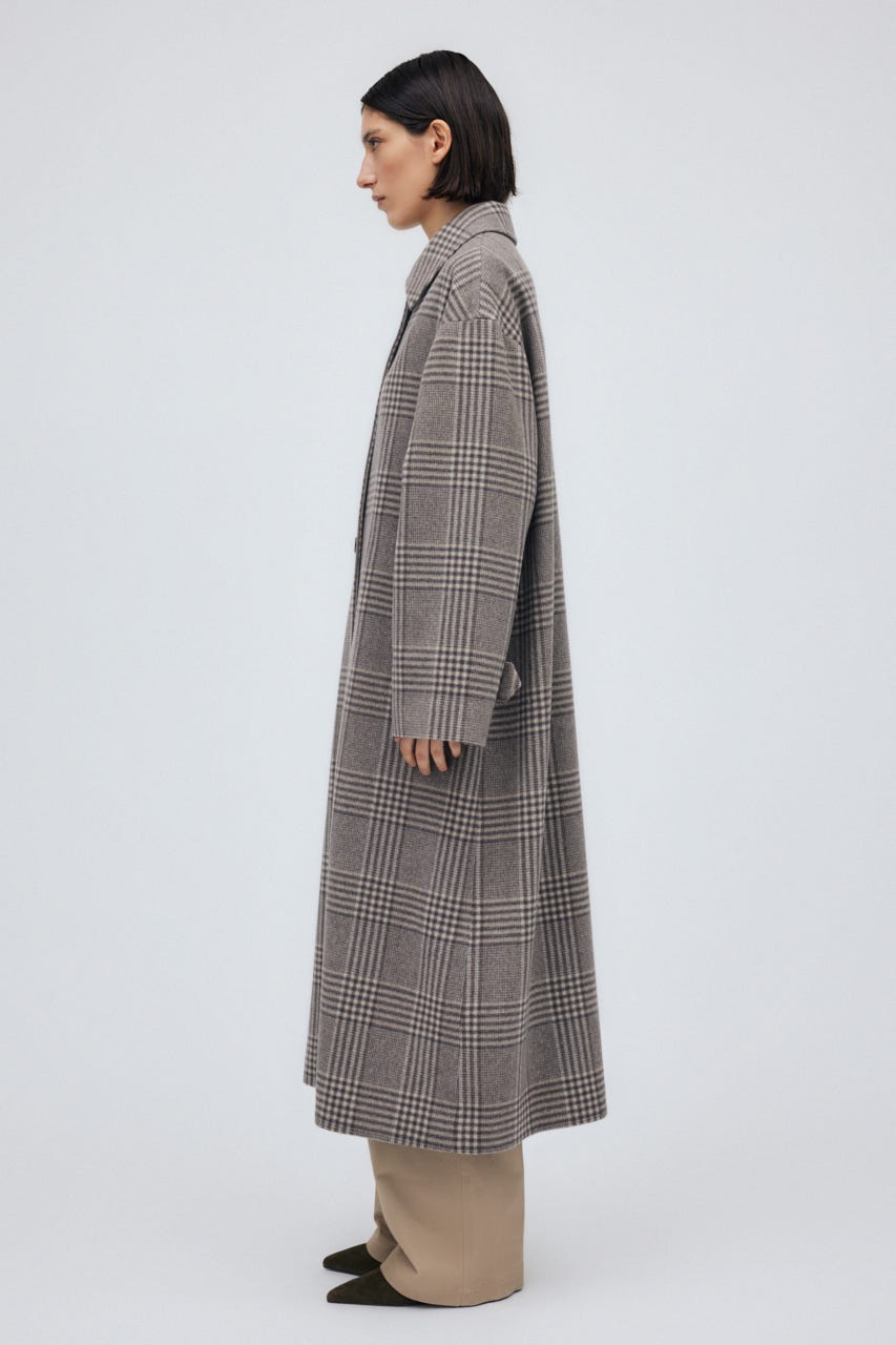 ウールならではの上質な風合いと暖かさ、軽さが特長のマキシ丈のコートは厚手ニットの上にも着やすいオーバーサイズ。