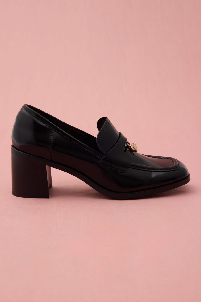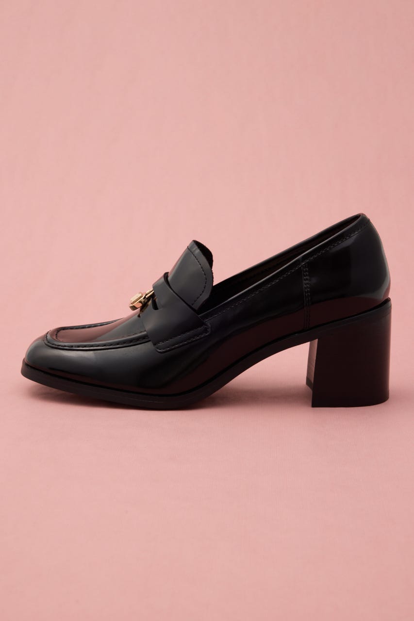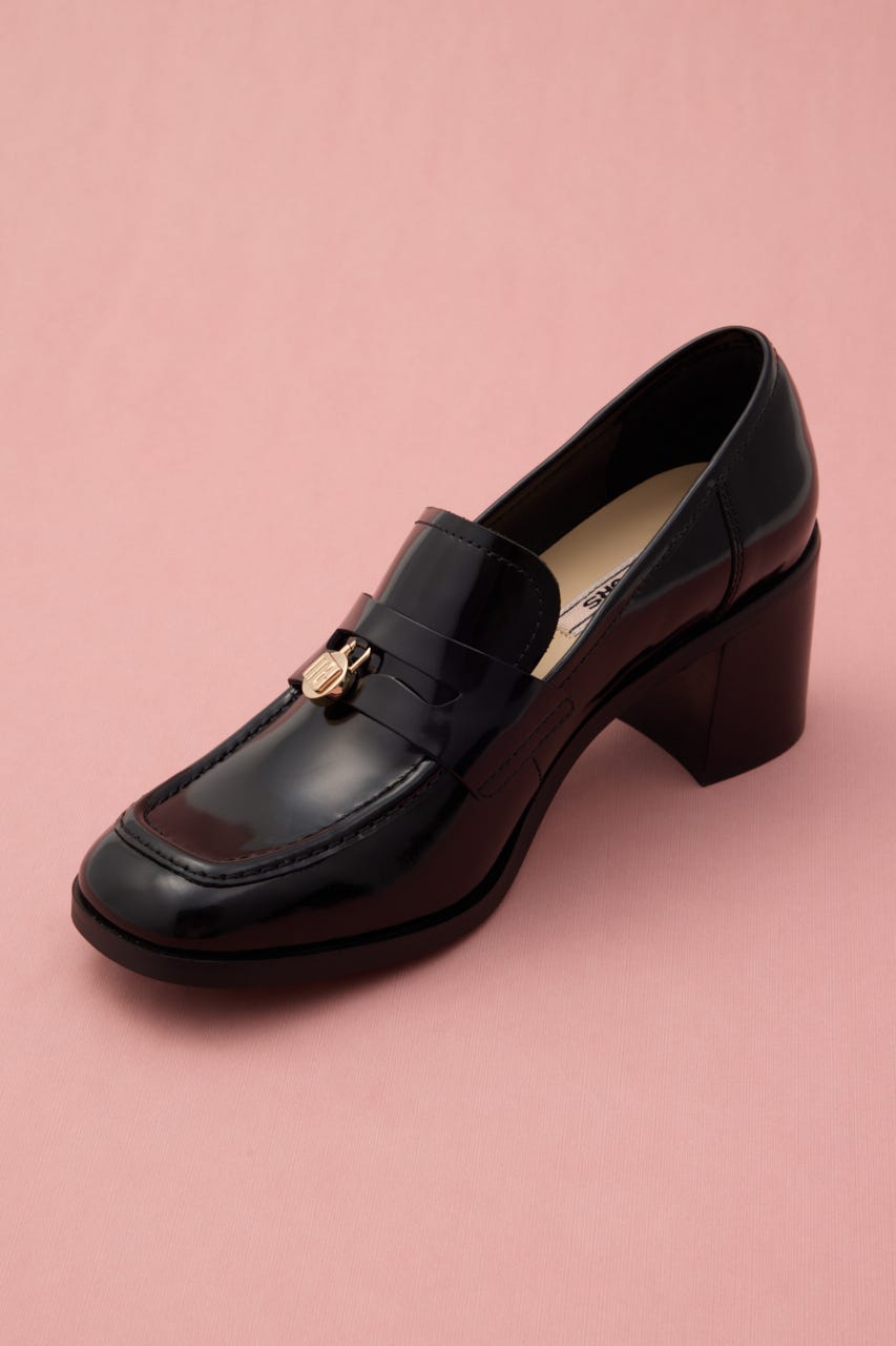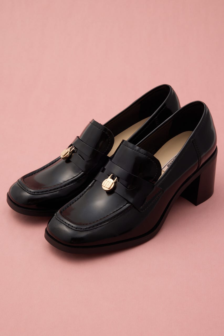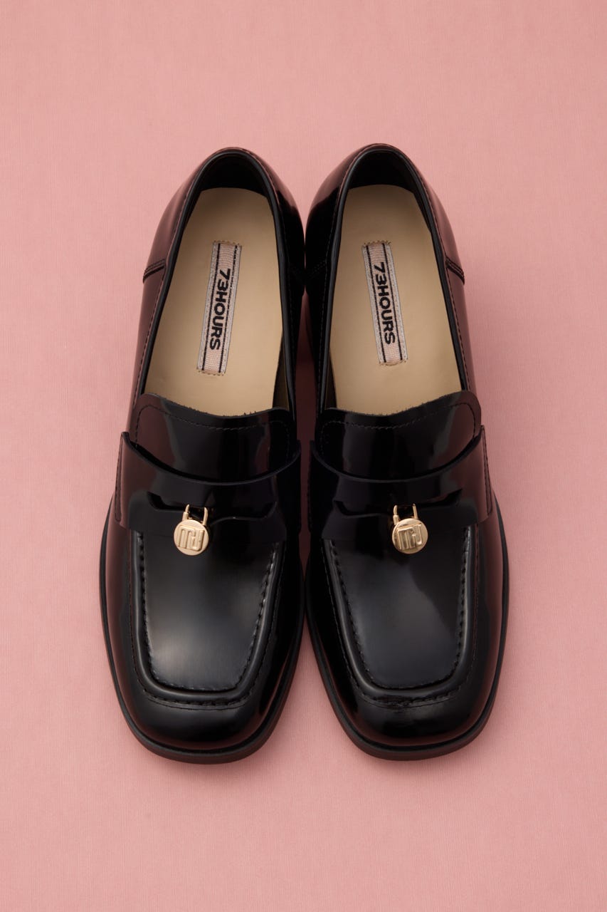 美フォルムなヒールローファー。カジュアルすぎずスタイリッシュなスクエアトゥにオリジナルのコイン錠チャームがワンポイントに。安定感のあるチャンキーヒールで軽快に履いていただけます。