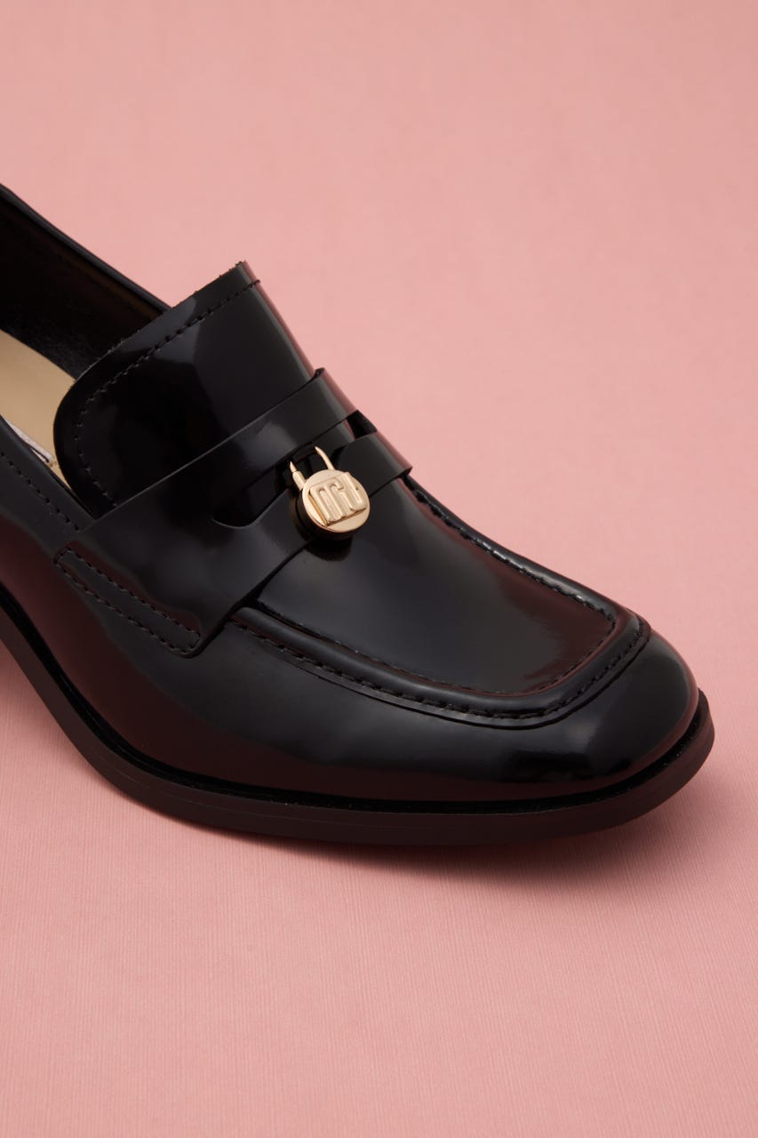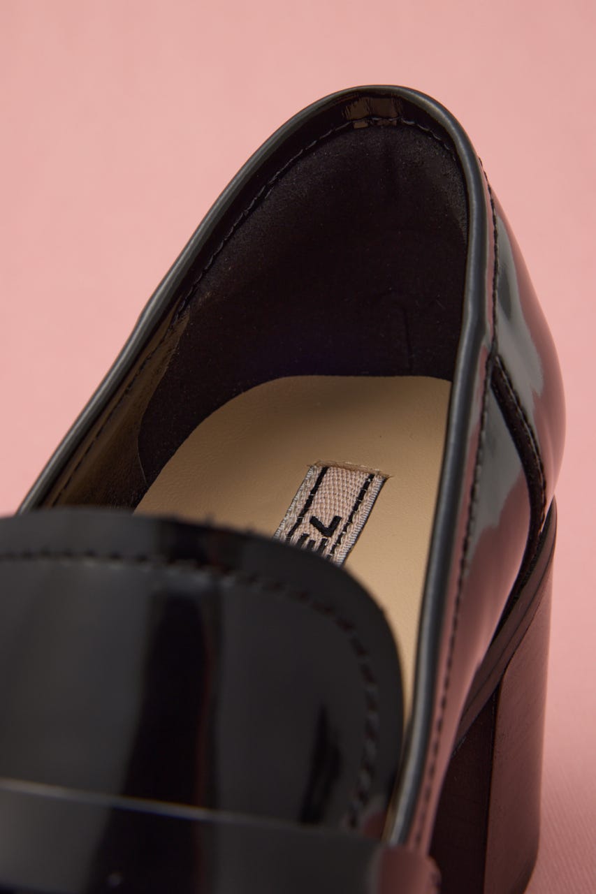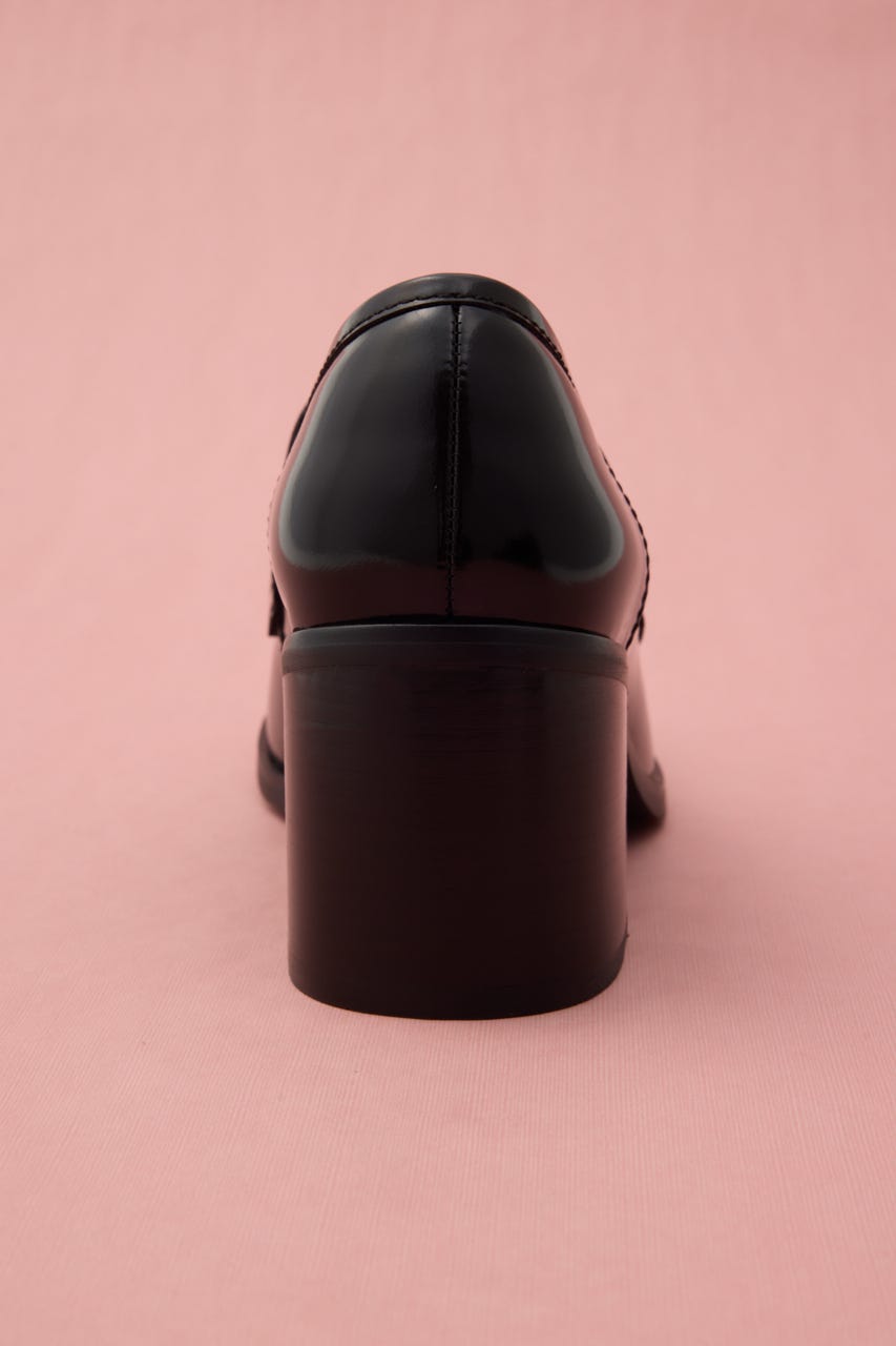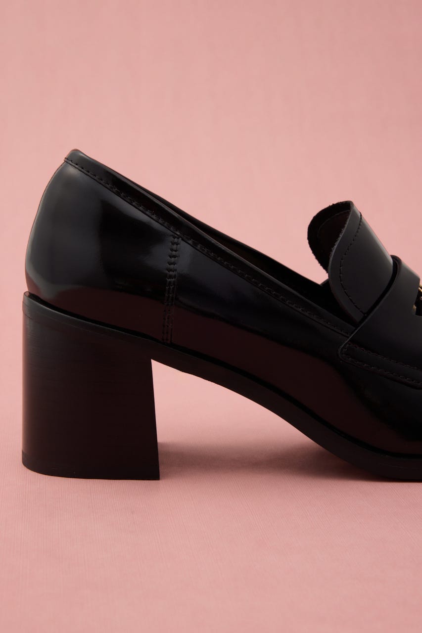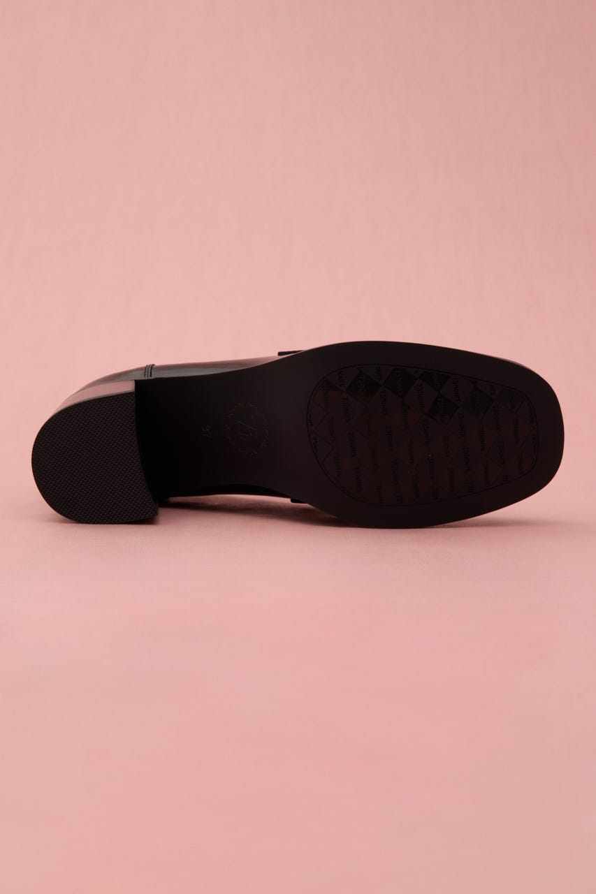 美フォルムなヒールローファー。カジュアルすぎずスタイリッシュなスクエアトゥにオリジナルのコイン錠チャームがワンポイントに。安定感のあるチャンキーヒールで軽快に履いていただけます。