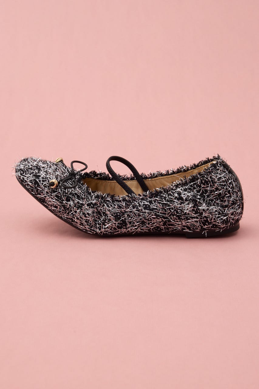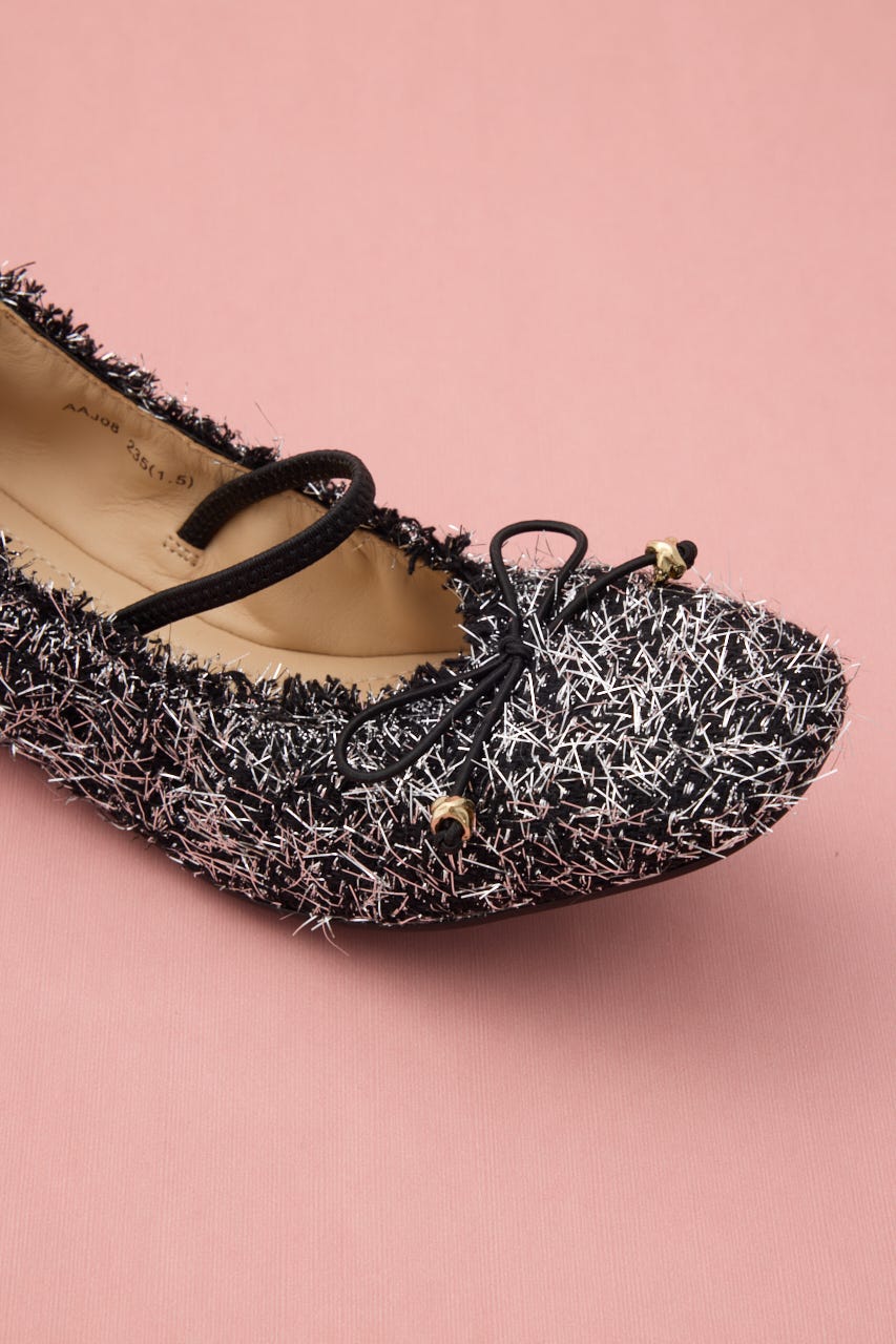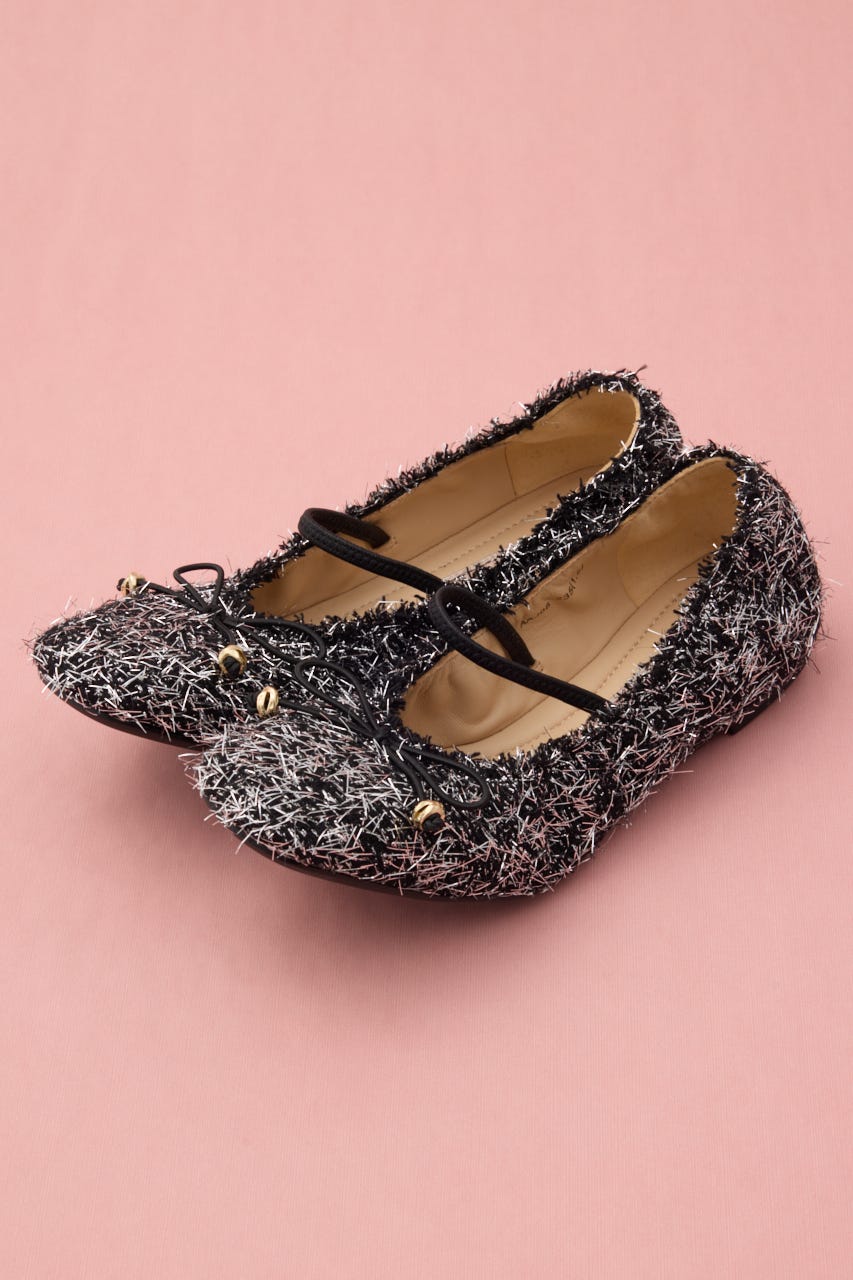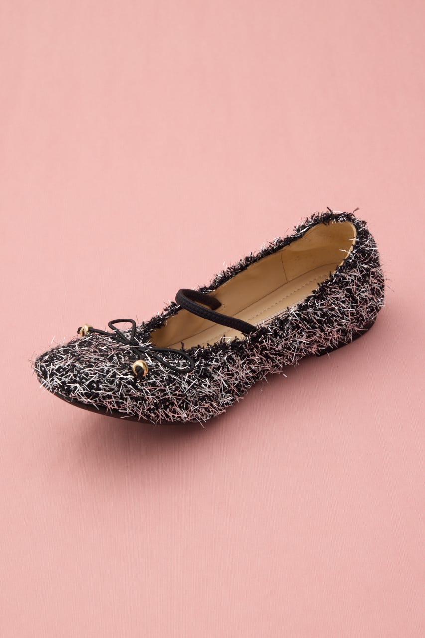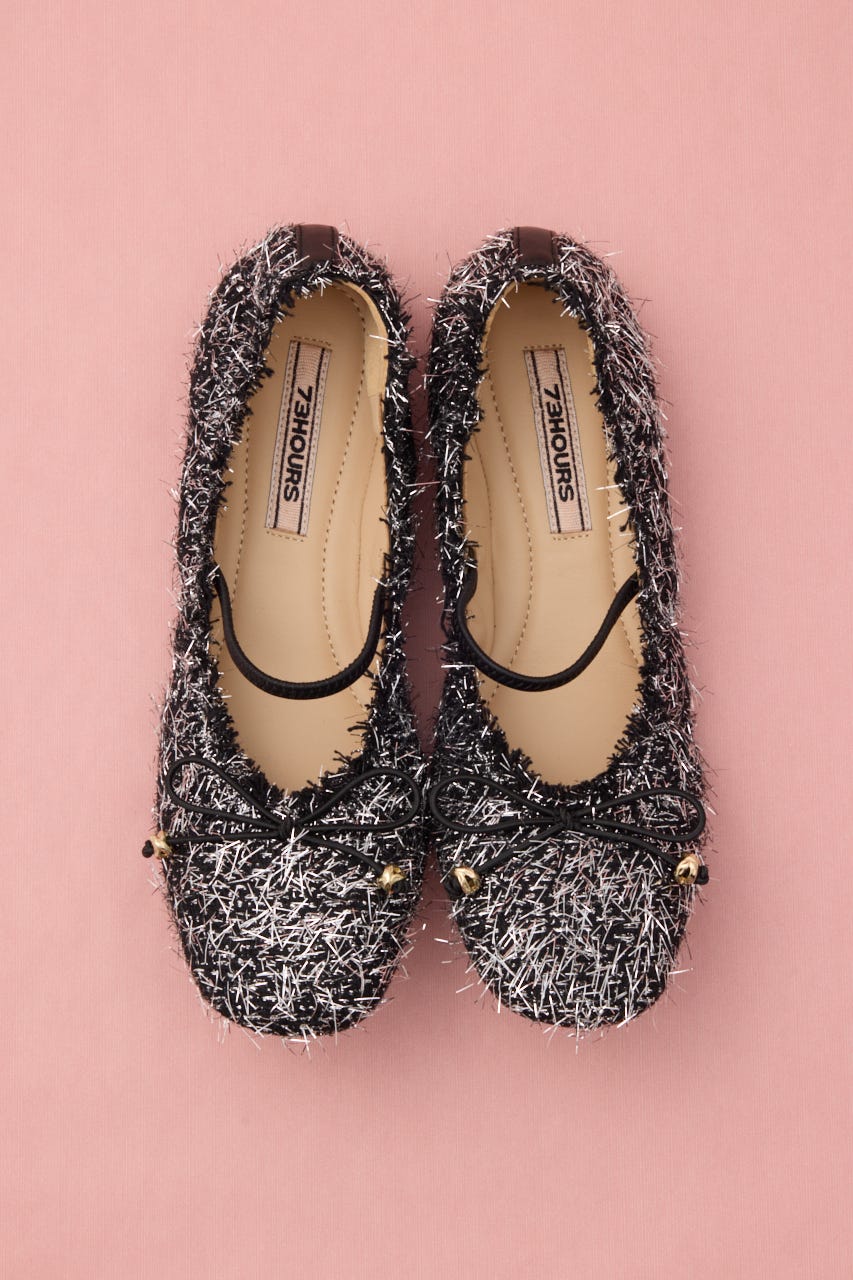 秋冬の足元を華やかにしてくれる、柔軟性◎なバレエシューズ。インパクトある毛足長めのMIXにリボンの先端にはさり気なくゴールドのパーツもポイントです。
