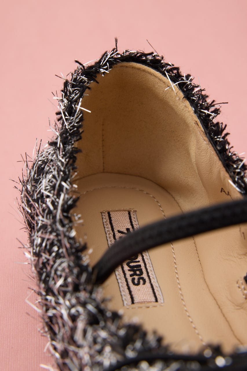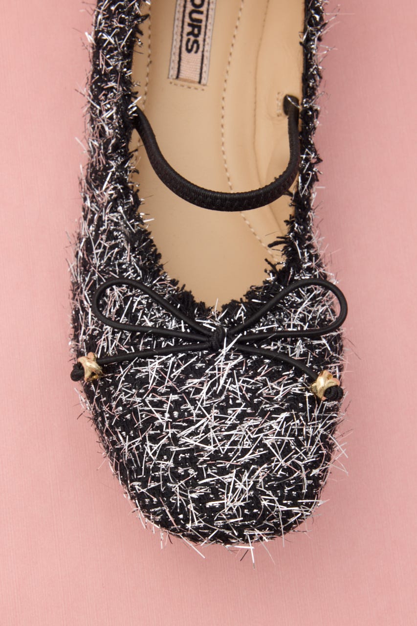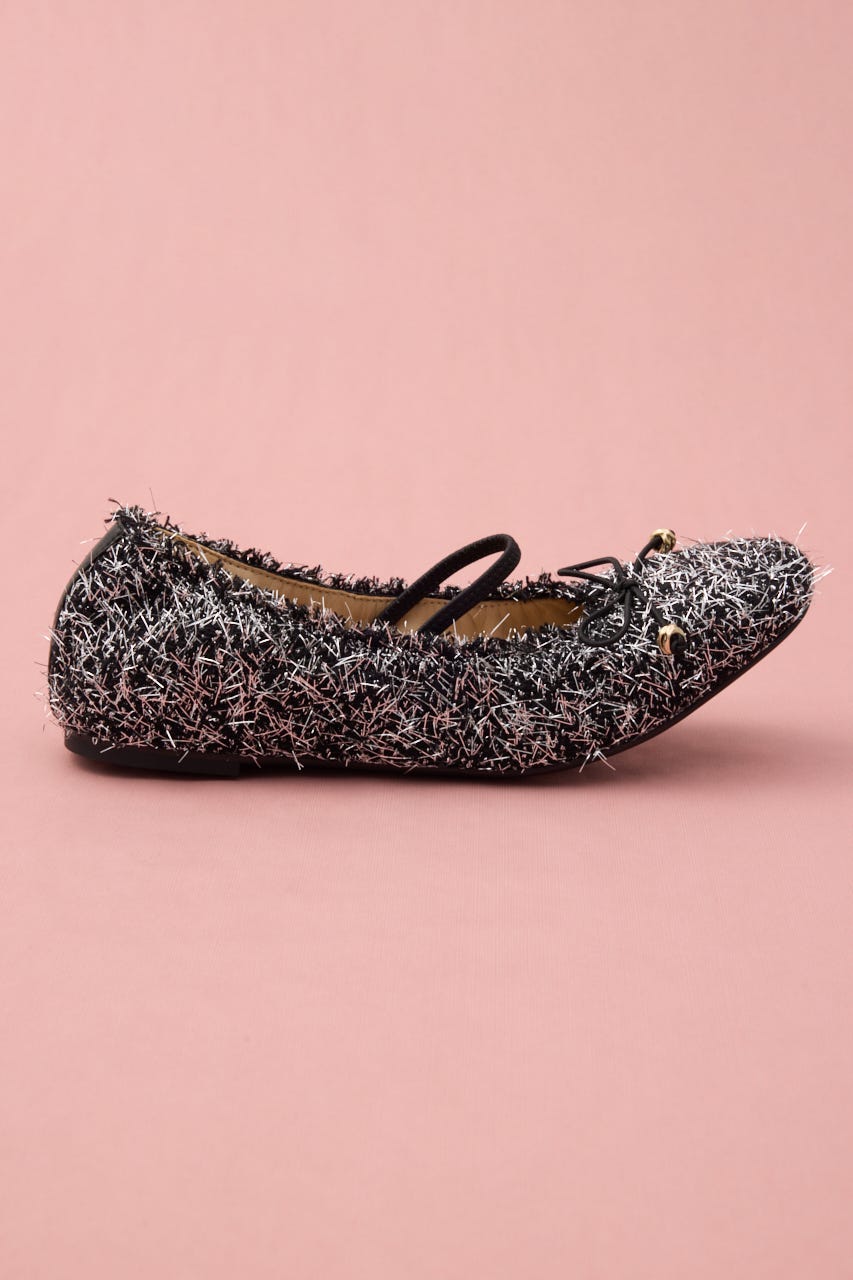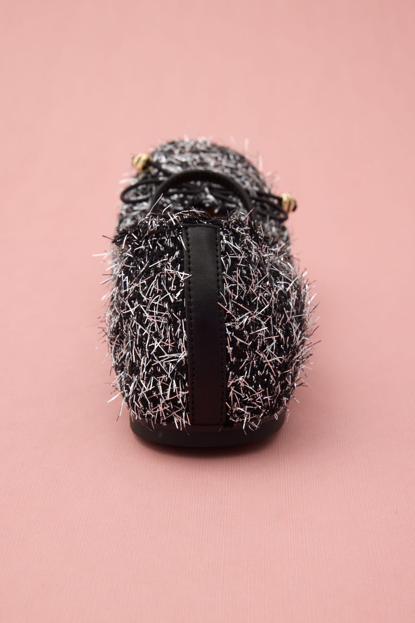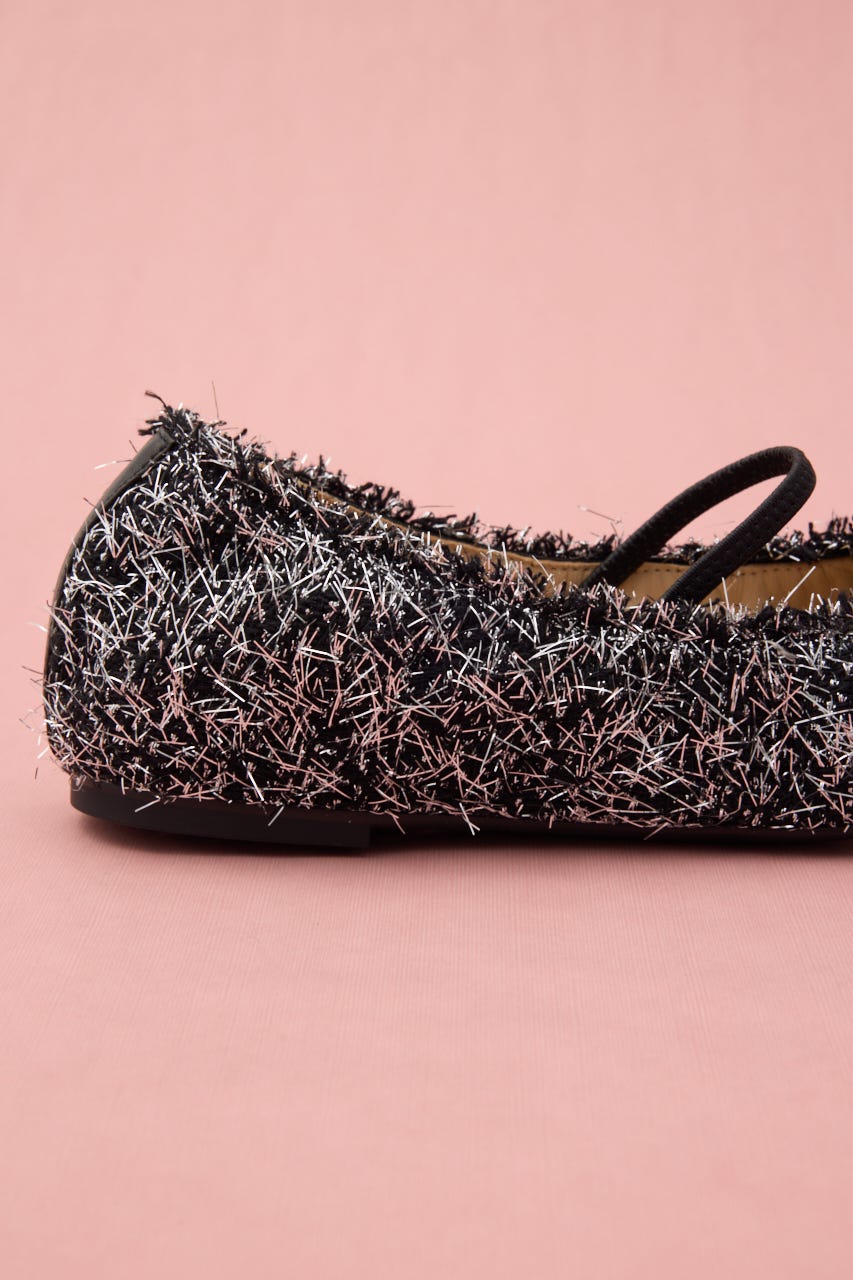 秋冬の足元を華やかにしてくれる、柔軟性◎なバレエシューズ。インパクトある毛足長めのMIXにリボンの先端にはさり気なくゴールドのパーツもポイントです。