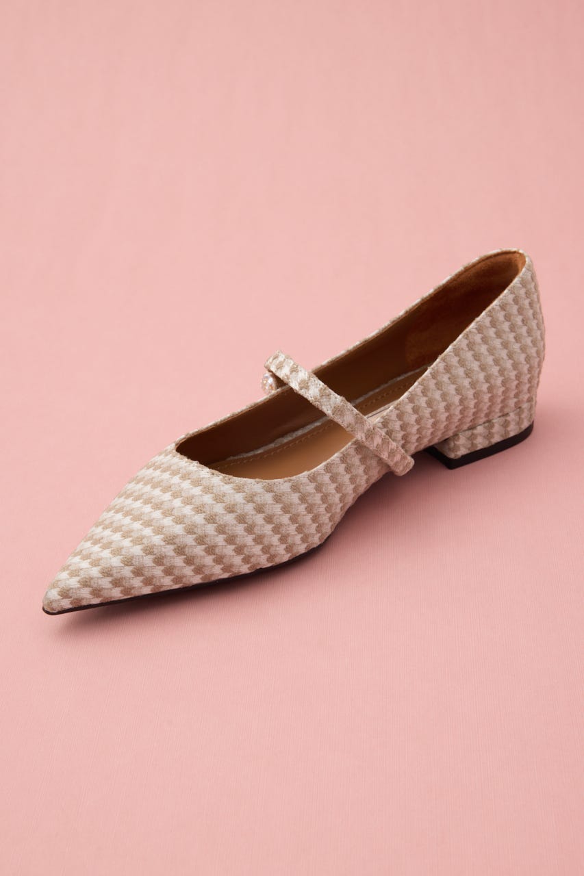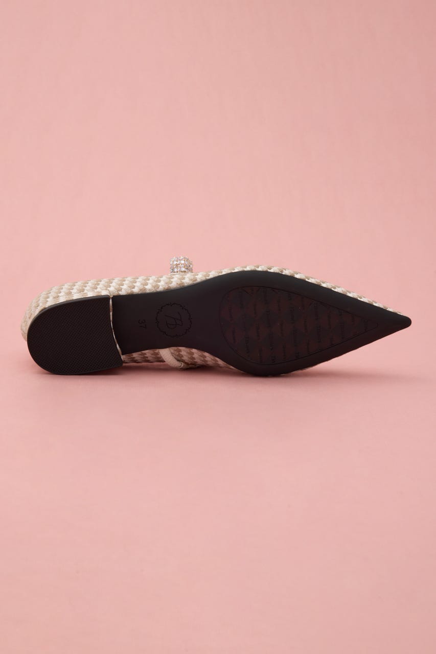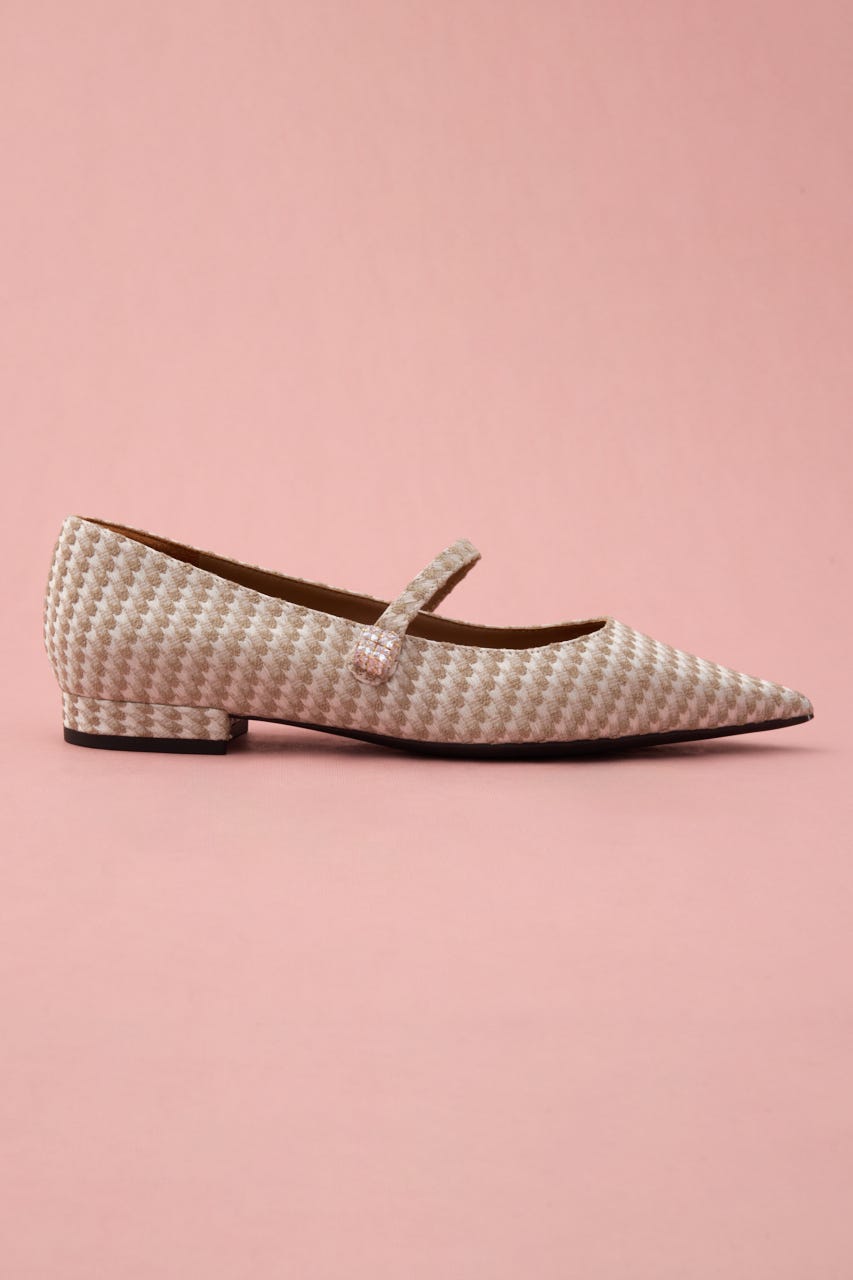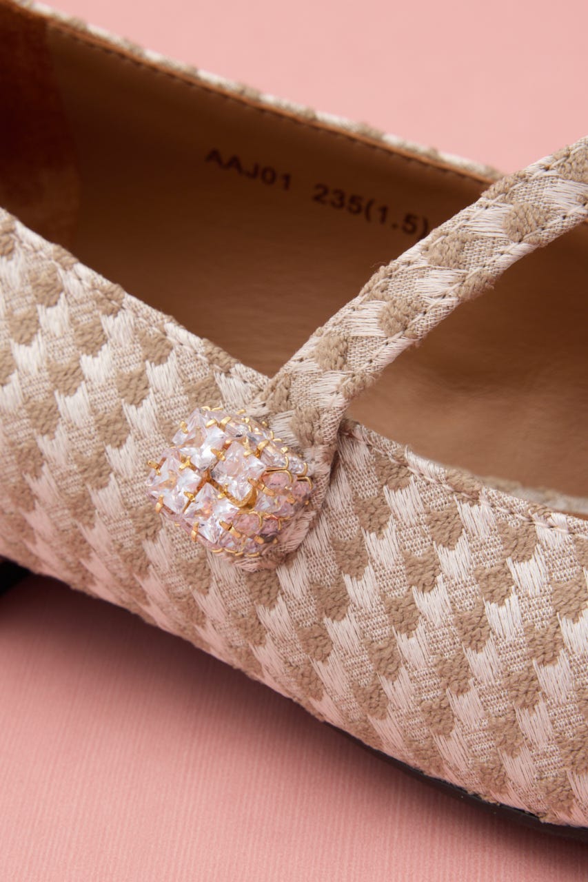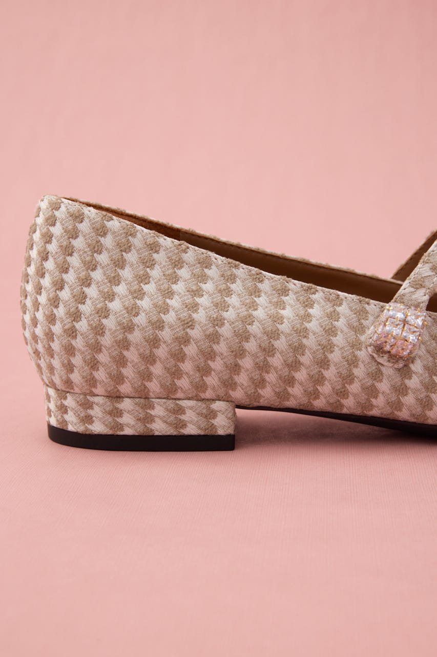 秋冬の足元が華やかになるカッターパンプス。ナチュラルなカラーがスタイリングに合わせやすく主張しすぎない千鳥格子風の柄もポイント高い。メリージェーンのベルトには煌びやかなキュービックが装飾された個性の光る1足です。※装飾部分への引っ掛けや破損・衝撃等にご注意ください。