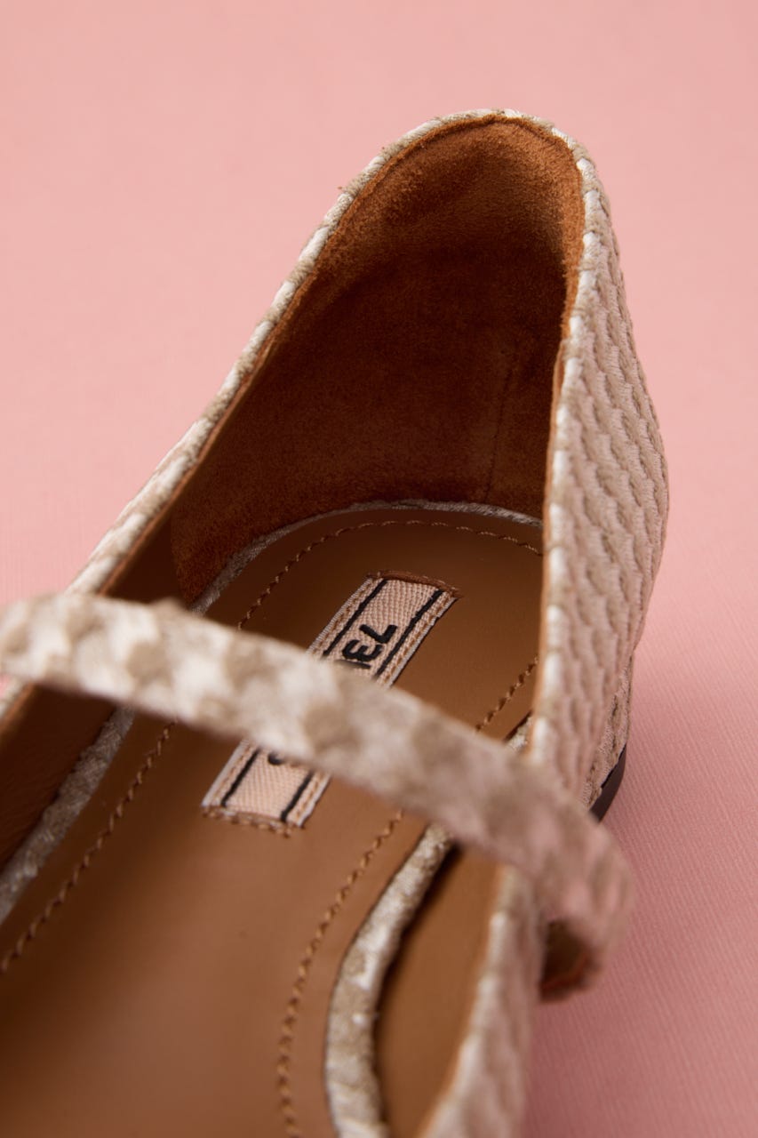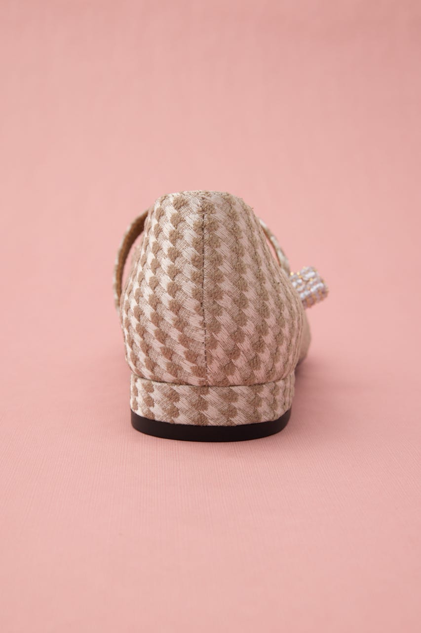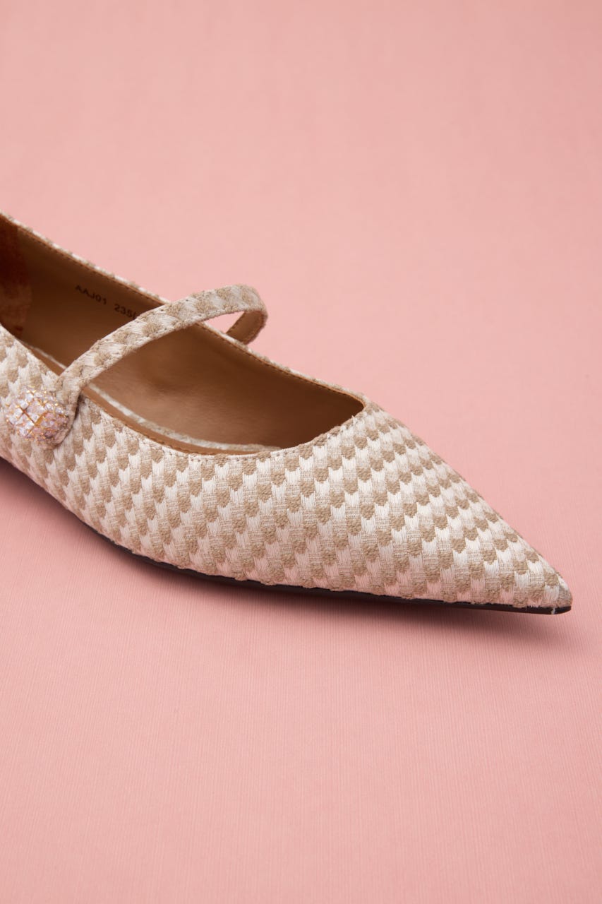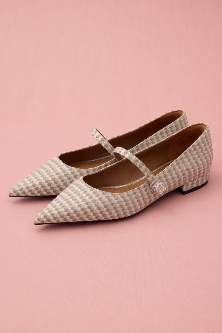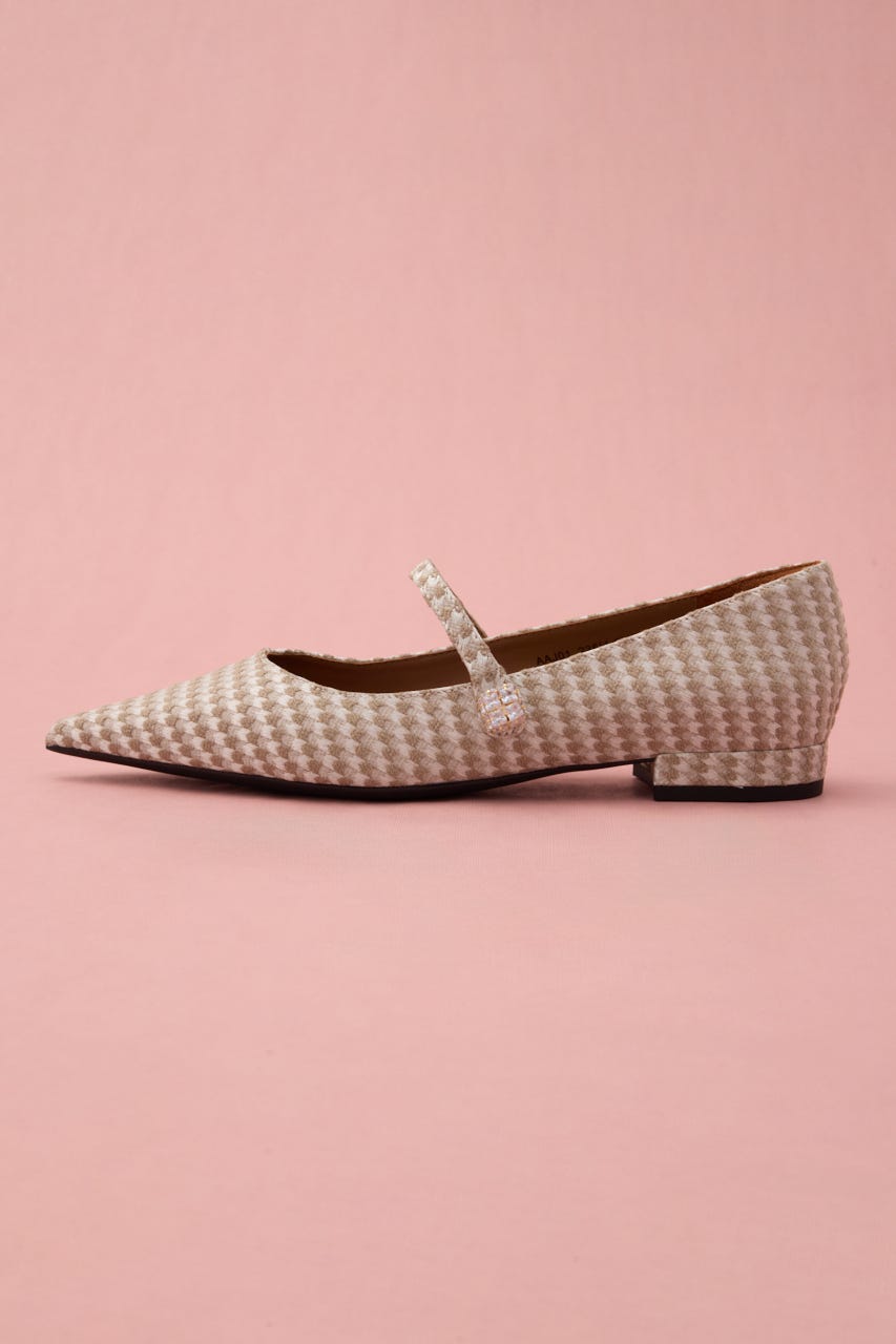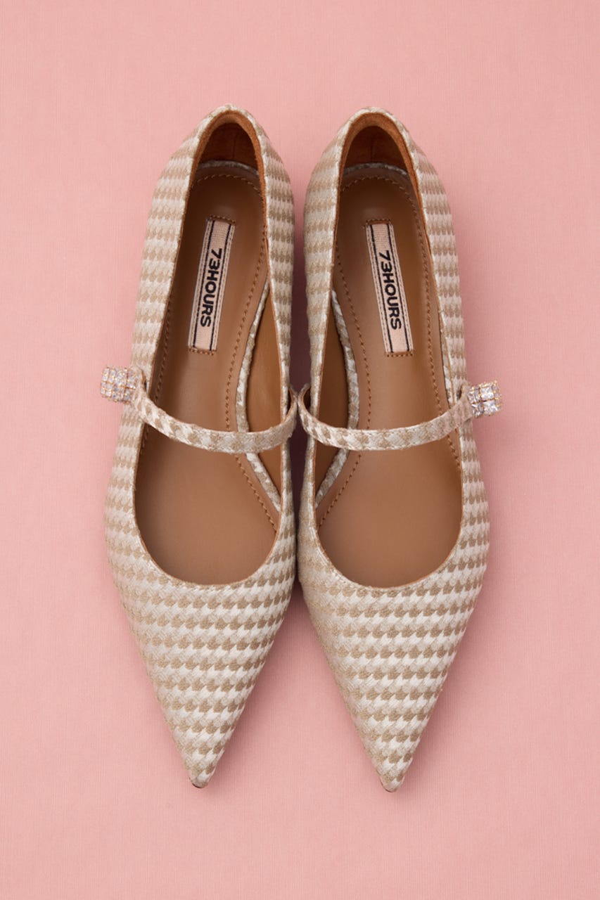 秋冬の足元が華やかになるカッターパンプス。ナチュラルなカラーがスタイリングに合わせやすく主張しすぎない千鳥格子風の柄もポイント高い。メリージェーンのベルトには煌びやかなキュービックが装飾された個性の光る1足です。※装飾部分への引っ掛けや破損・衝撃等にご注意ください。