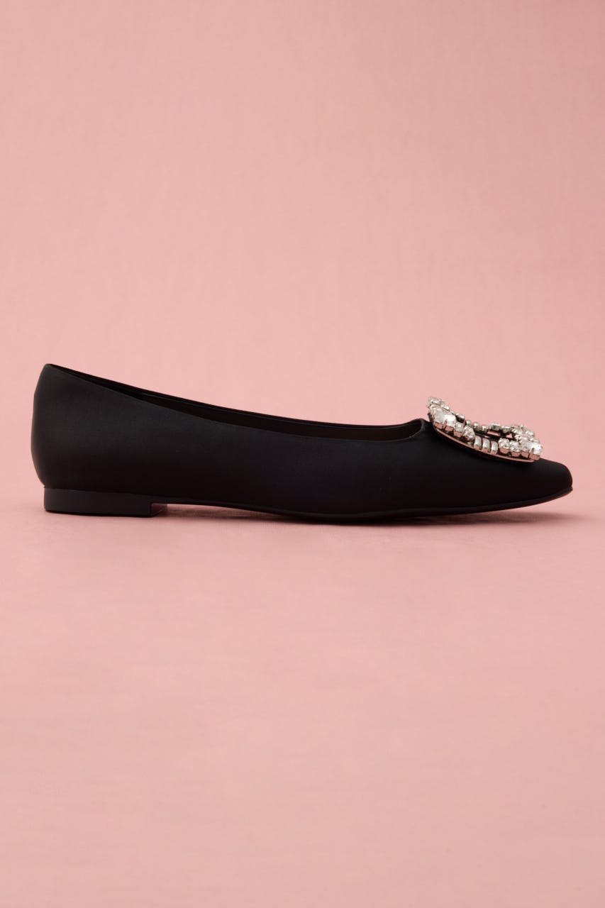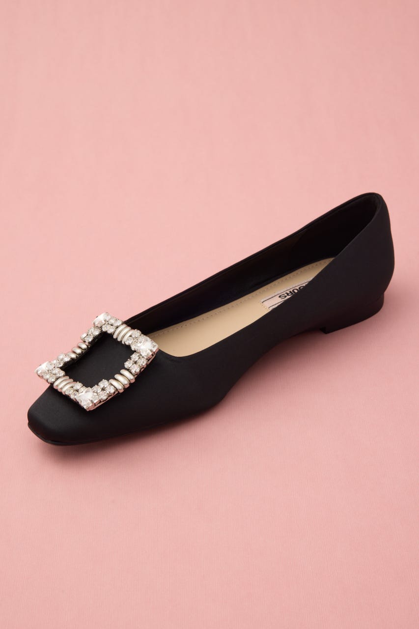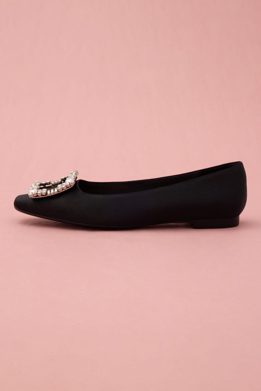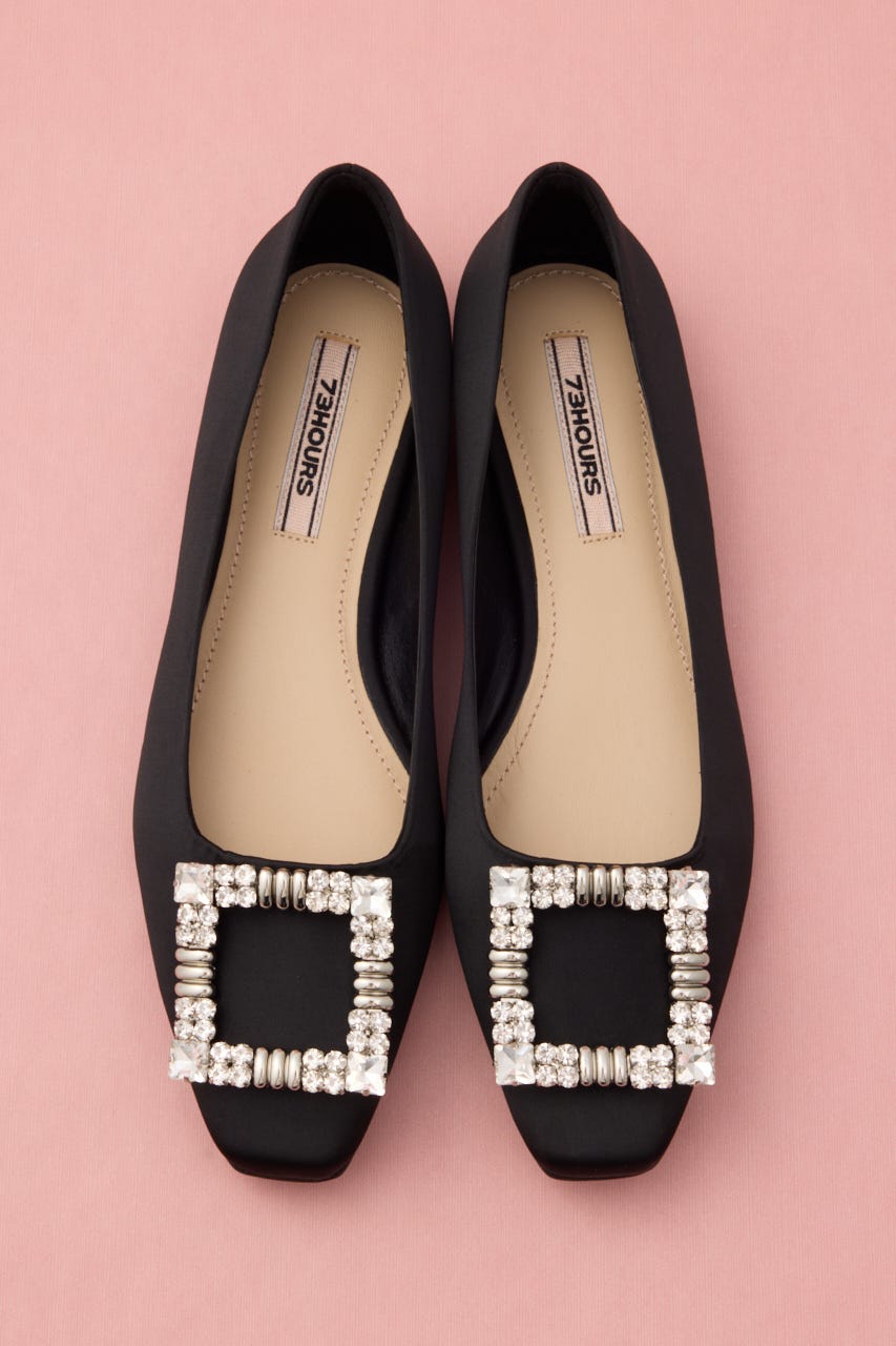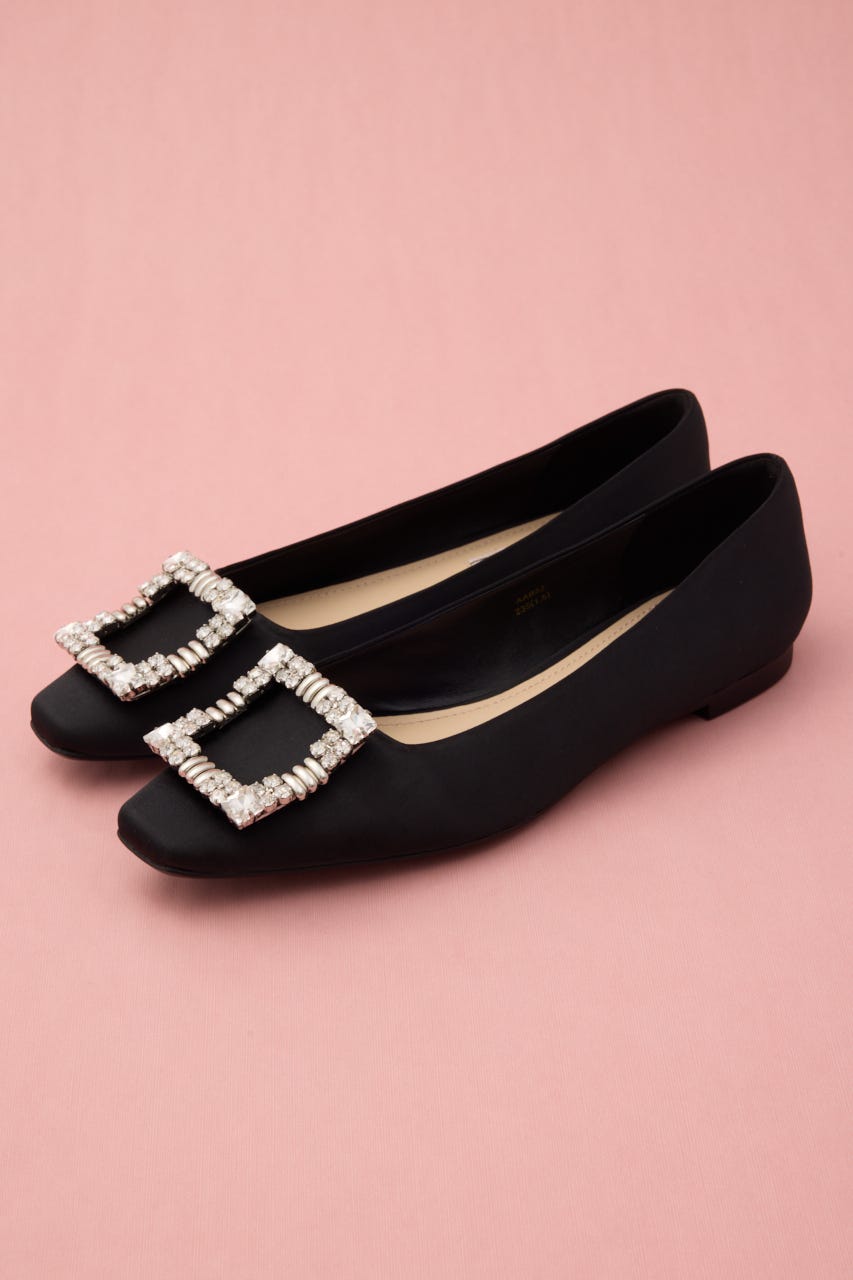 艶やかなでエレガントなカッターパンプス。滑らかなサテン地が上品かつ大小さまざまなクリスタルストーンで装飾された輝かしいバックルがフラットシューズながら品格ある足元に魅せてくれます。※バックル部分への引っ掛けやストーン装飾への衝撃等にご注意ください。
