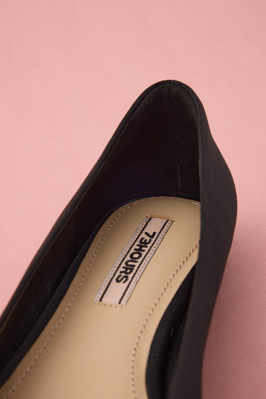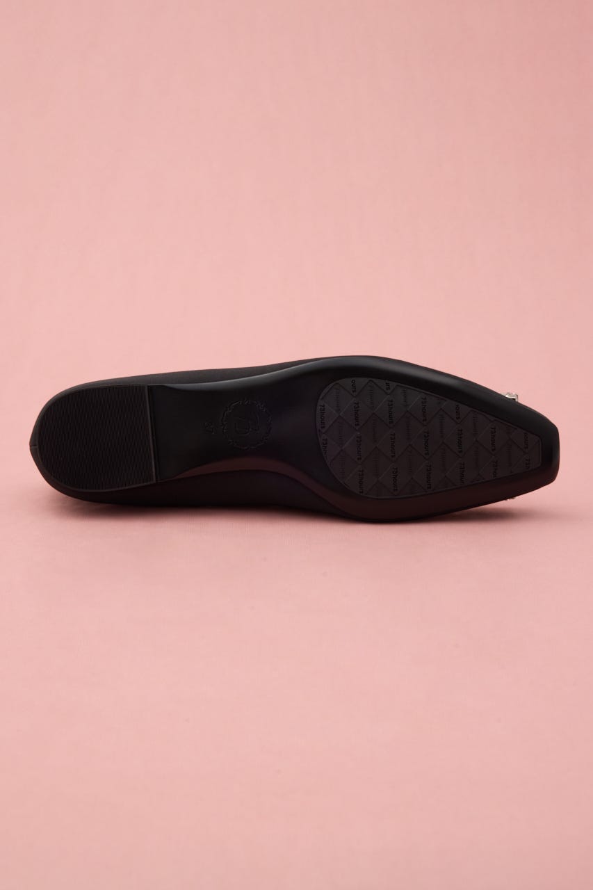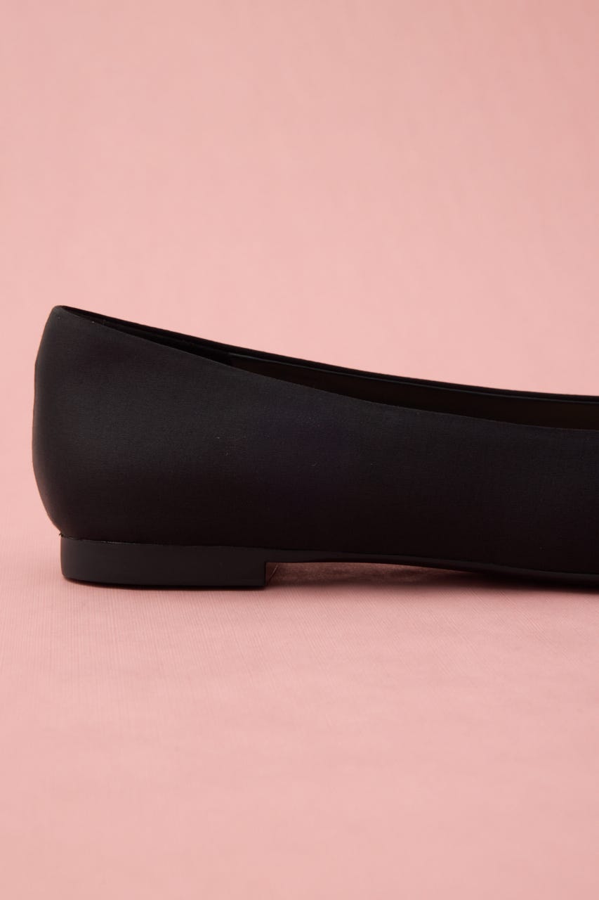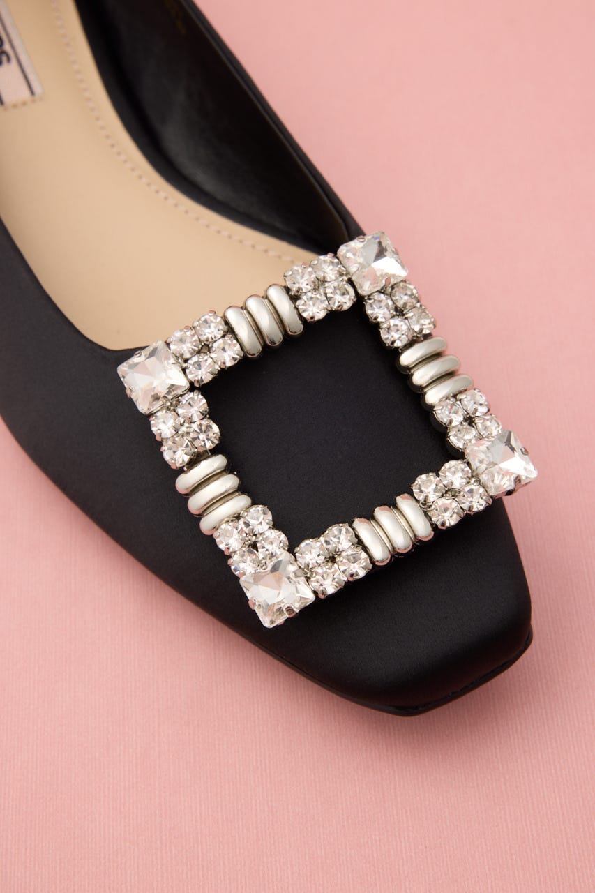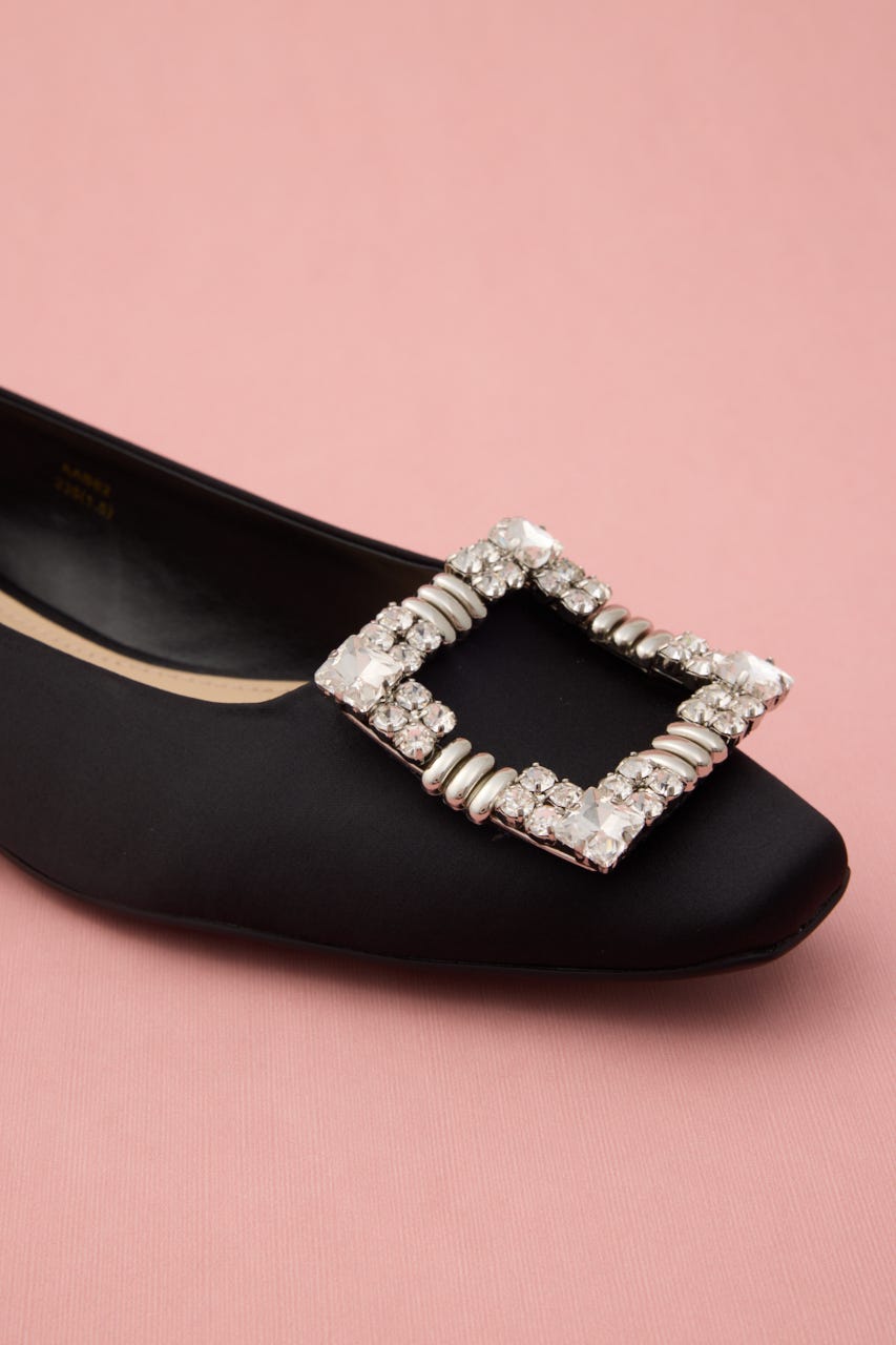 艶やかなでエレガントなカッターパンプス。滑らかなサテン地が上品かつ大小さまざまなクリスタルストーンで装飾された輝かしいバックルがフラットシューズながら品格ある足元に魅せてくれます。※バックル部分への引っ掛けやストーン装飾への衝撃等にご注意ください。