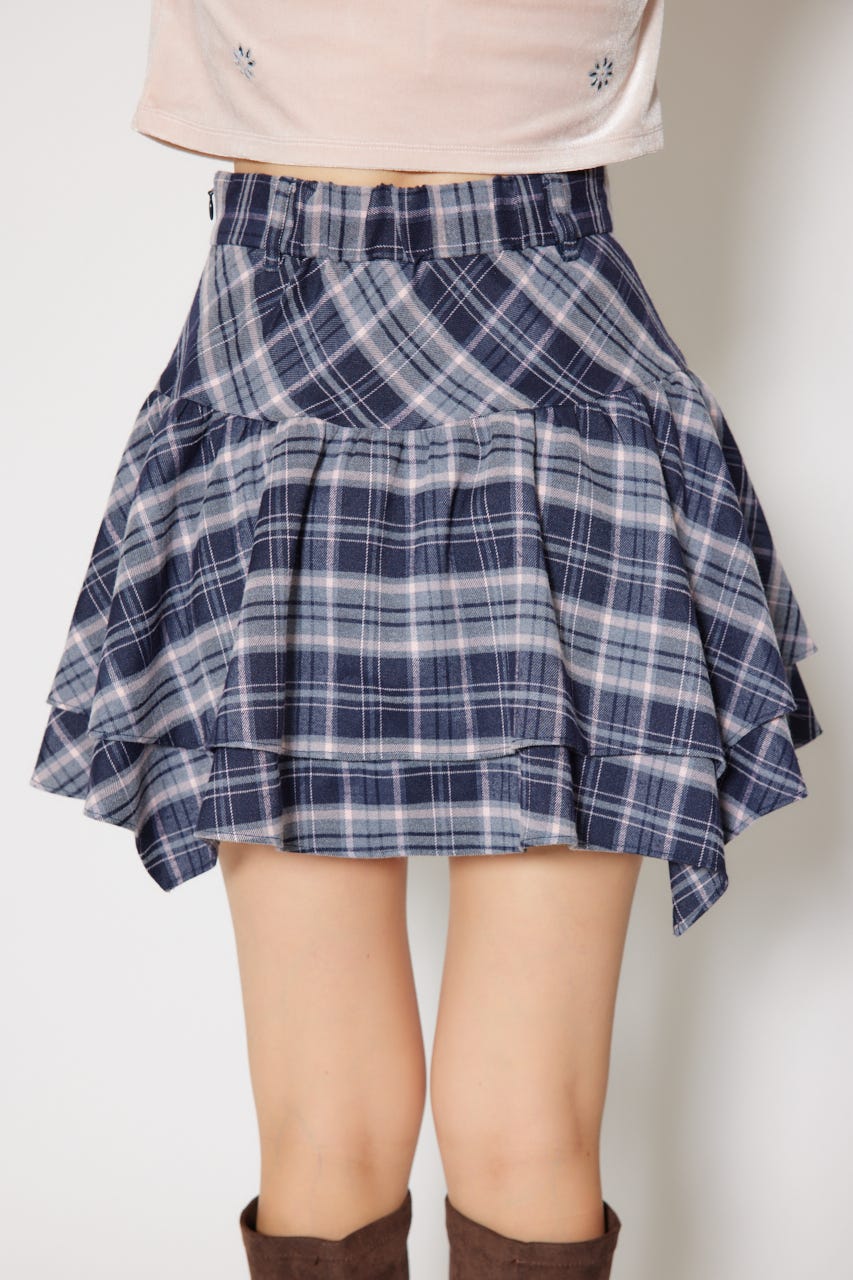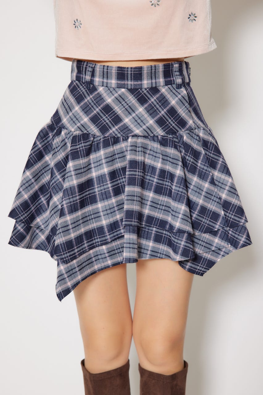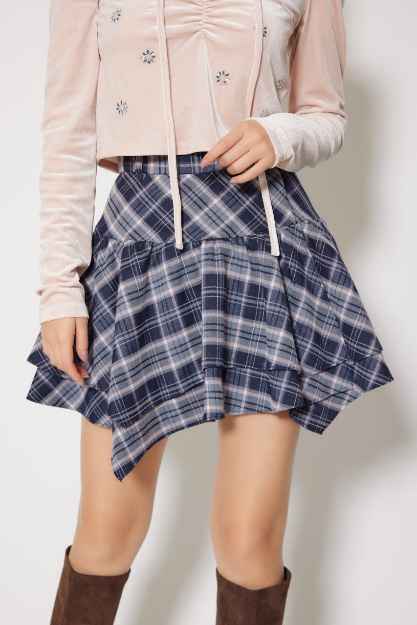 ラップ風デザインを施したスコショは腰下から広がる華やかなハンカチーフヘムで、コーディネイトに今年らしい華やかさをプラス。