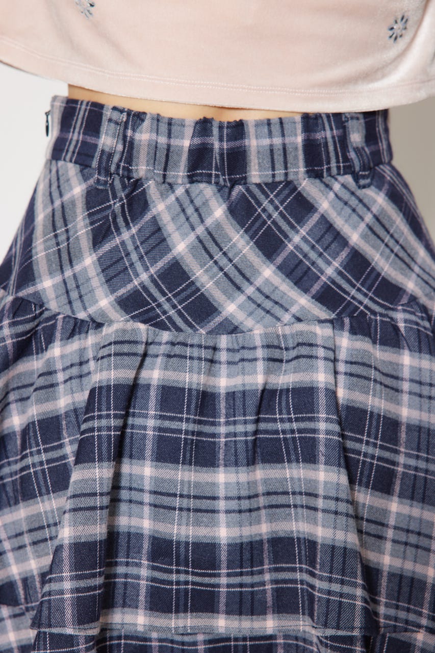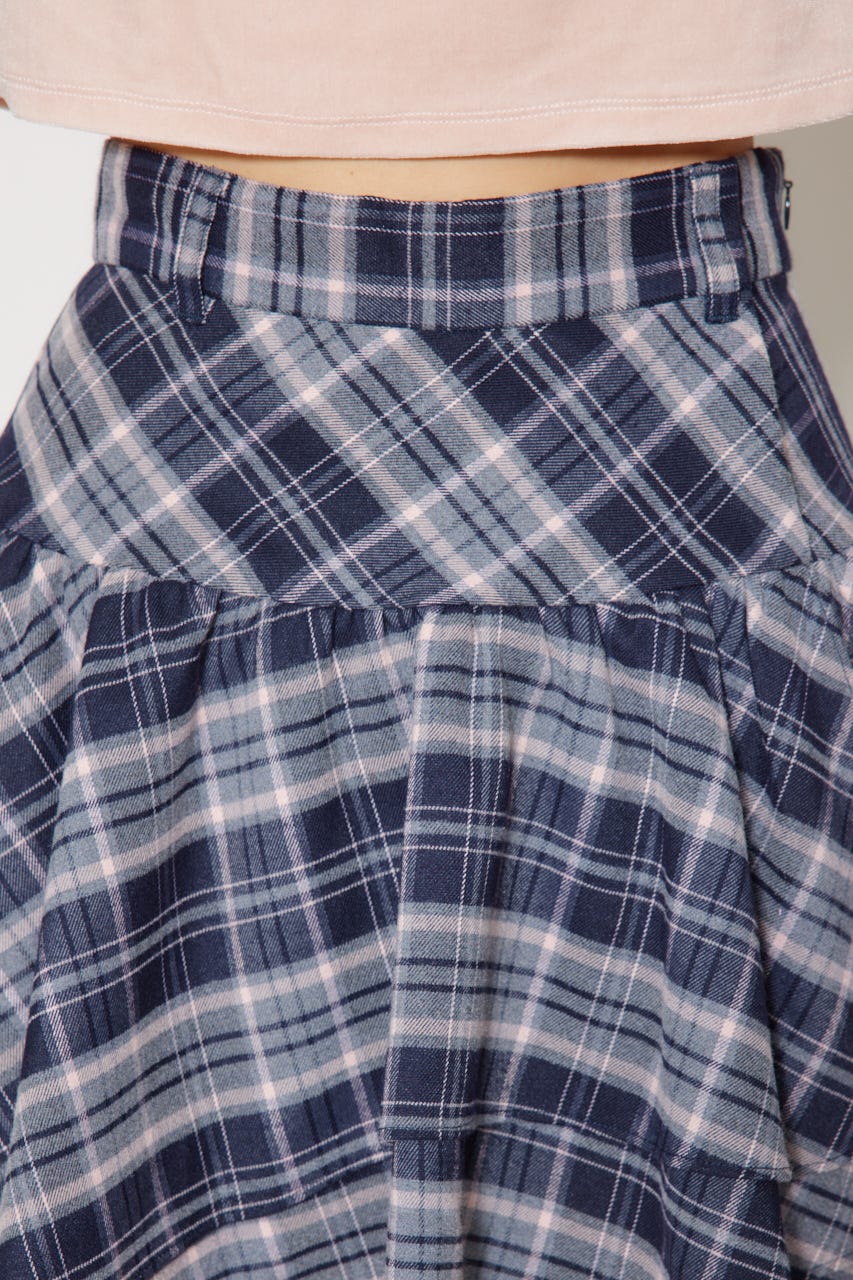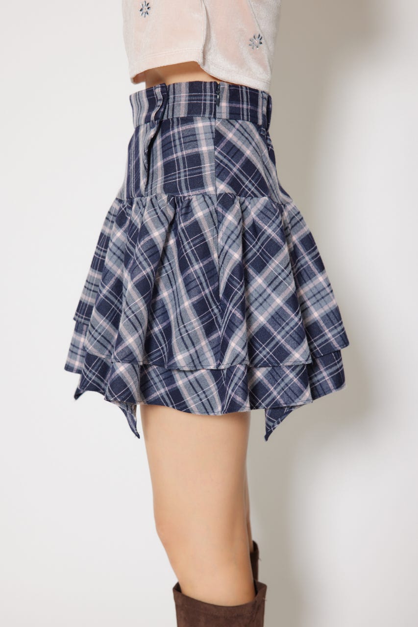 ラップ風デザインを施したスコショは腰下から広がる華やかなハンカチーフヘムで、コーディネイトに今年らしい華やかさをプラス。