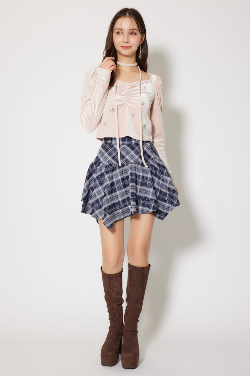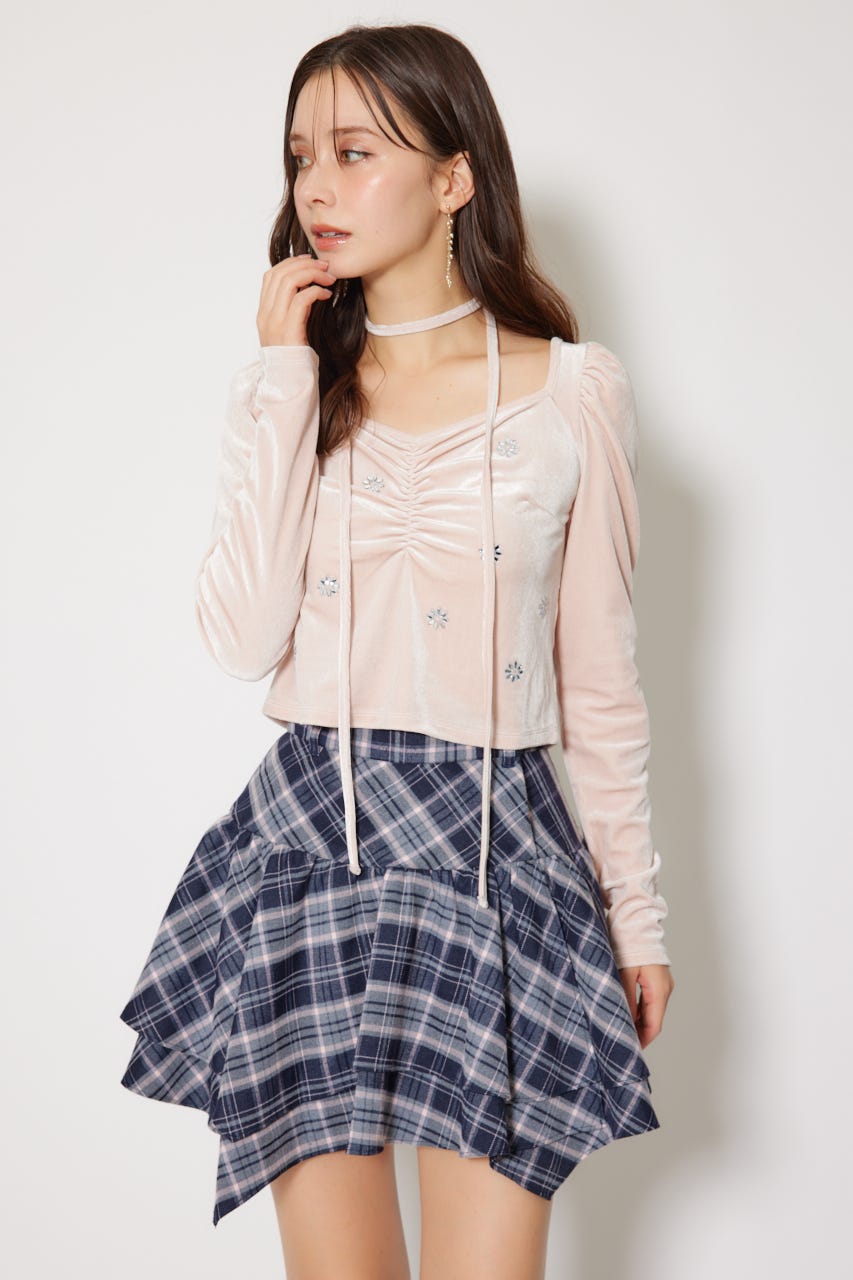 トップスはミニ丈でも、ロング丈でもどちらでも華やかに決まります。