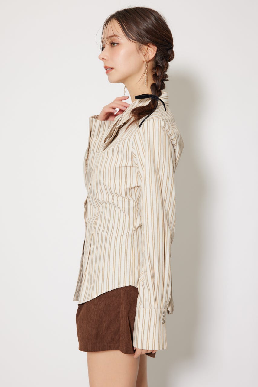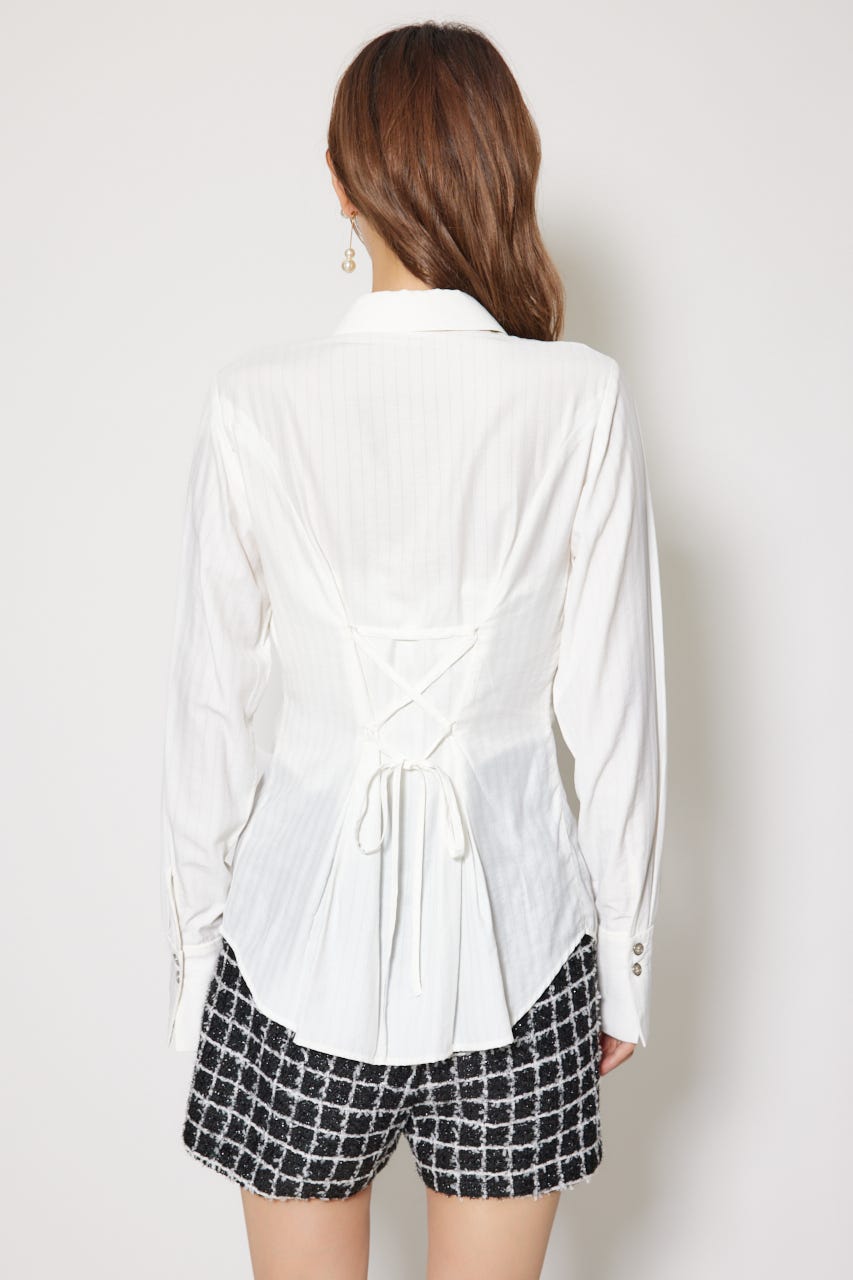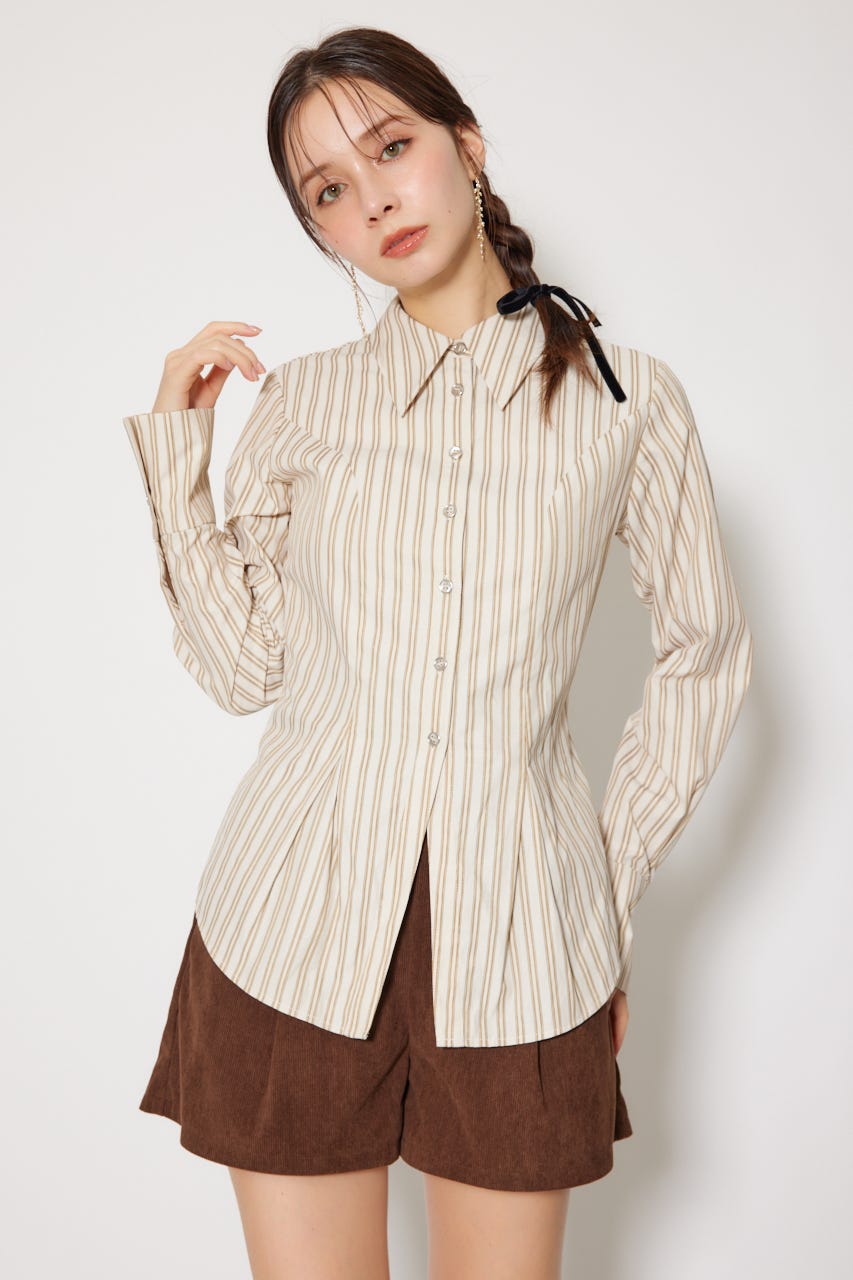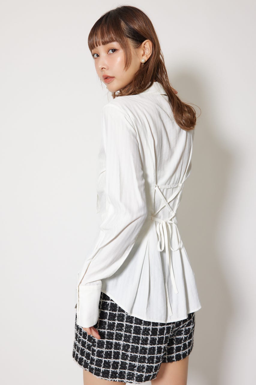 ウエストをパターンでシェイプさせ女性らしいシルエットを作り上げたriendaらしいシャツトップスの登場です。