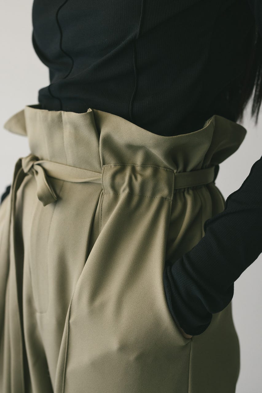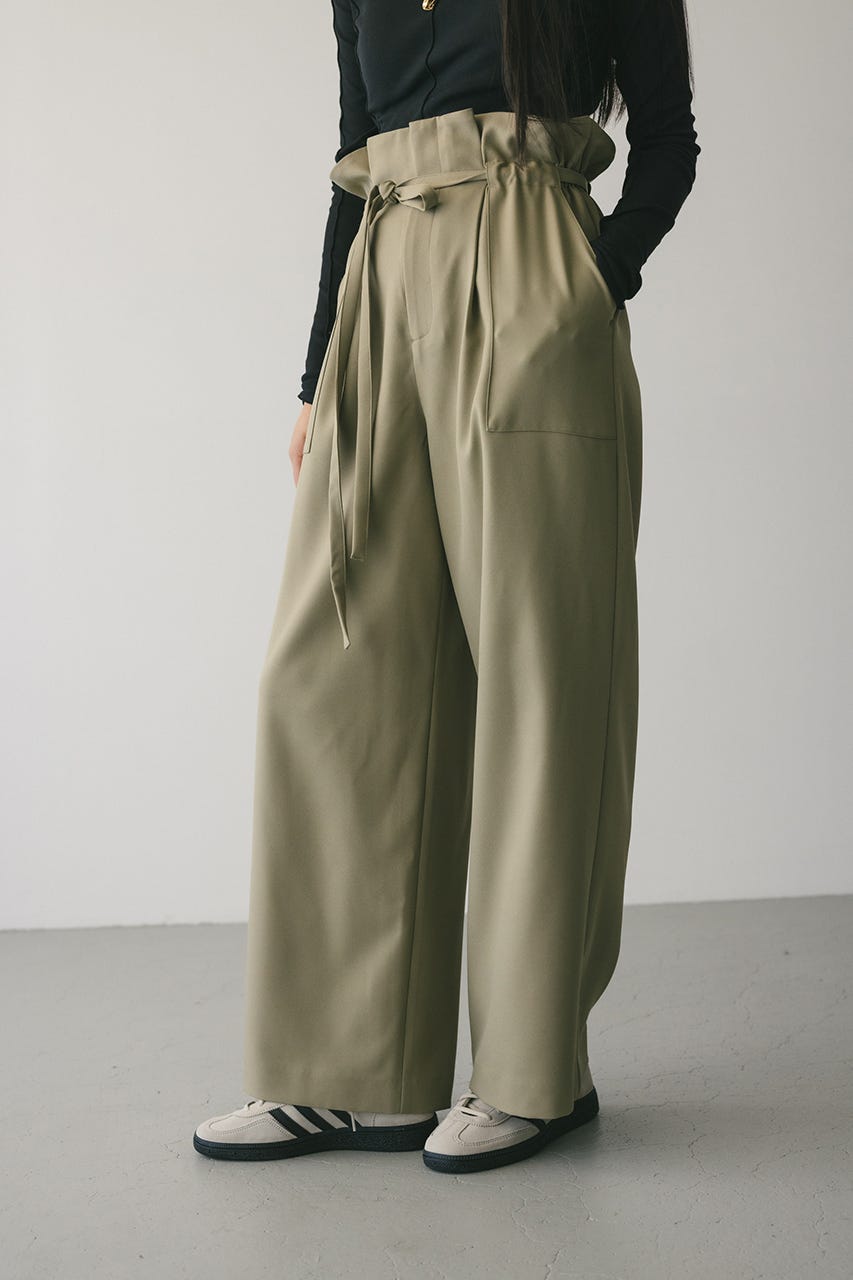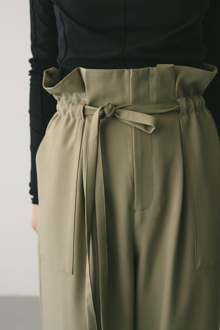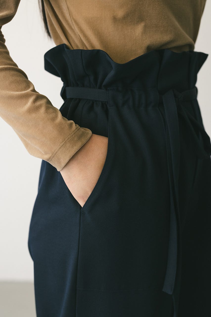 共地の紐ベルト付きで、ウエストをしっかり締めてハイウエストでの着用も可能です。