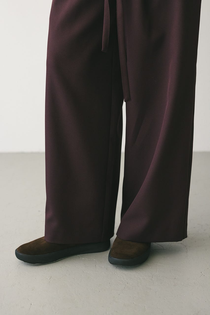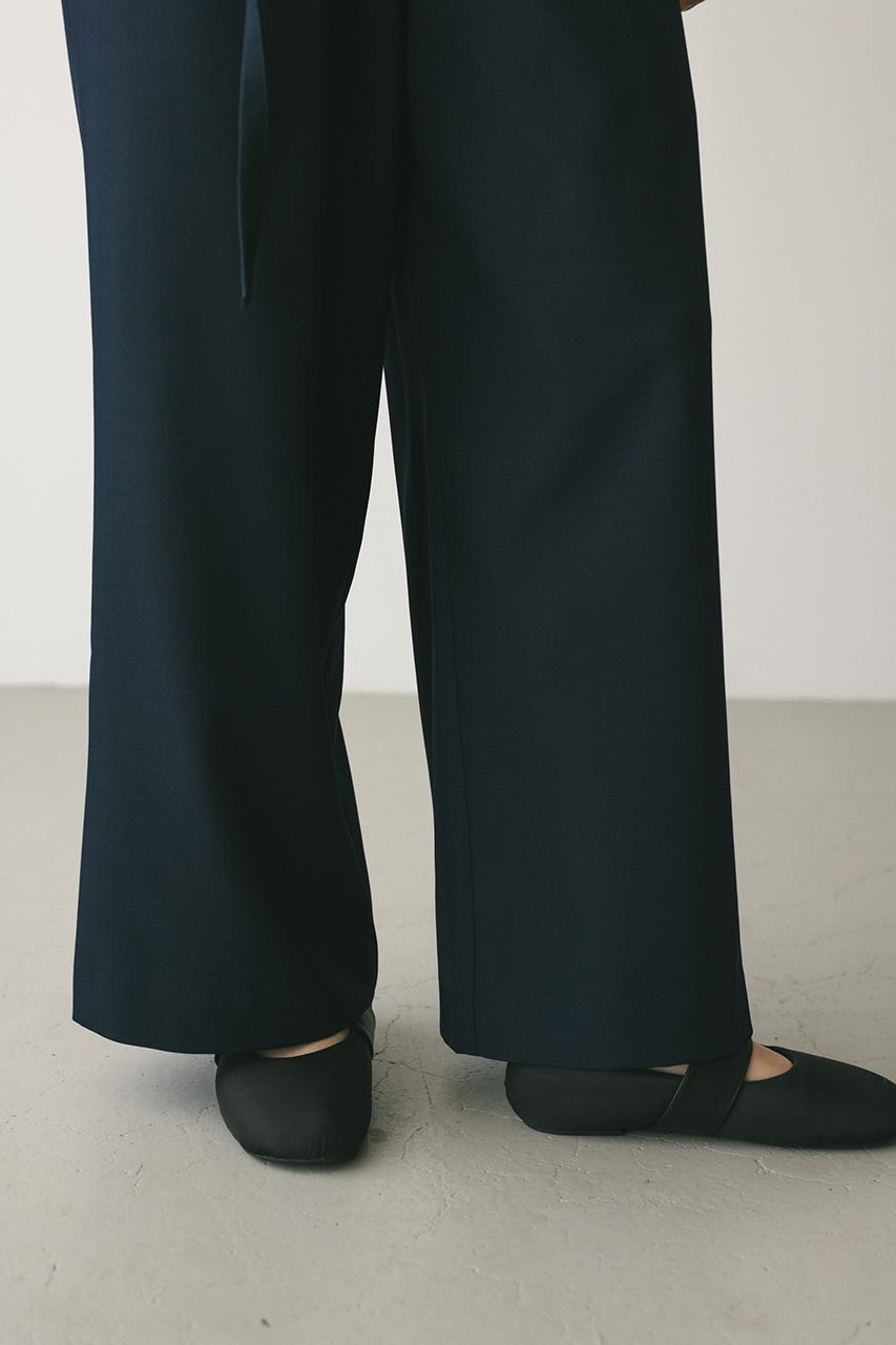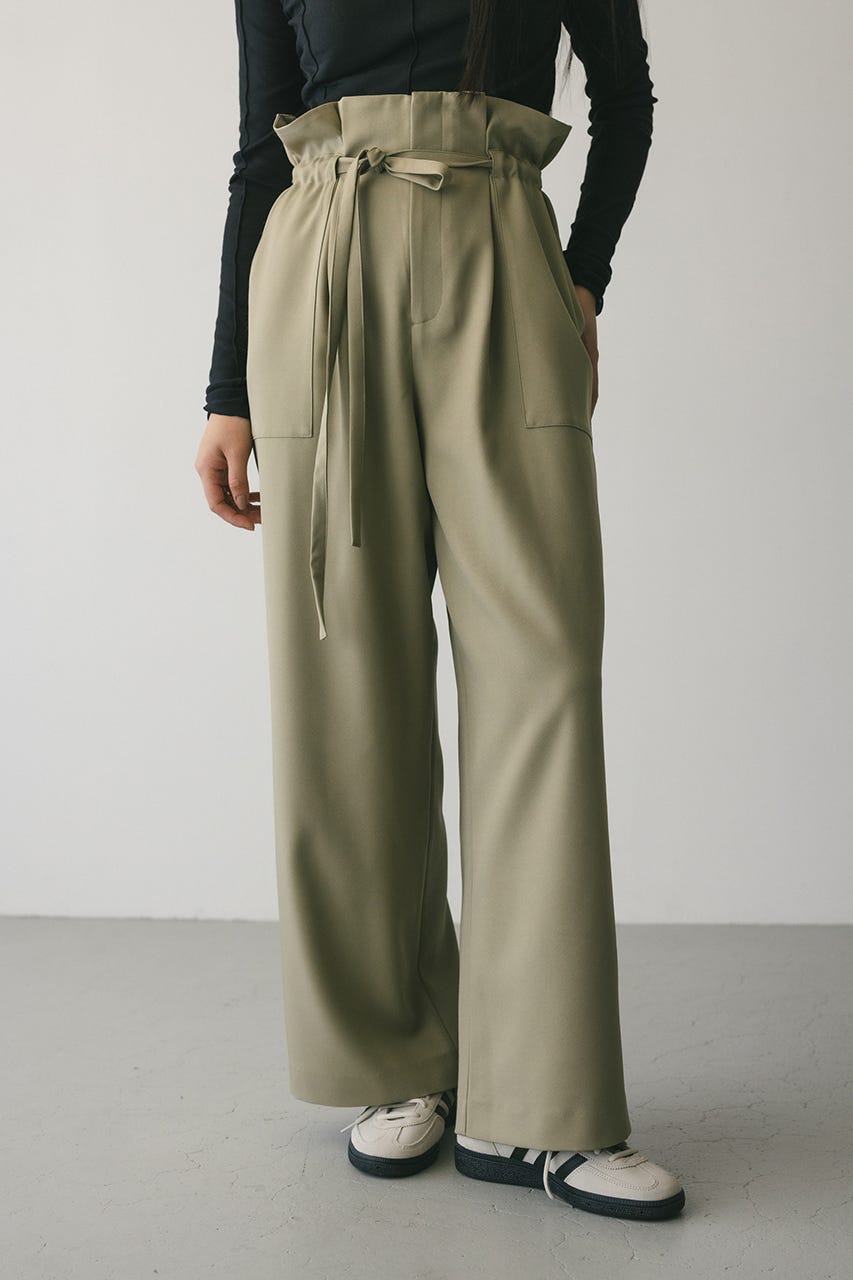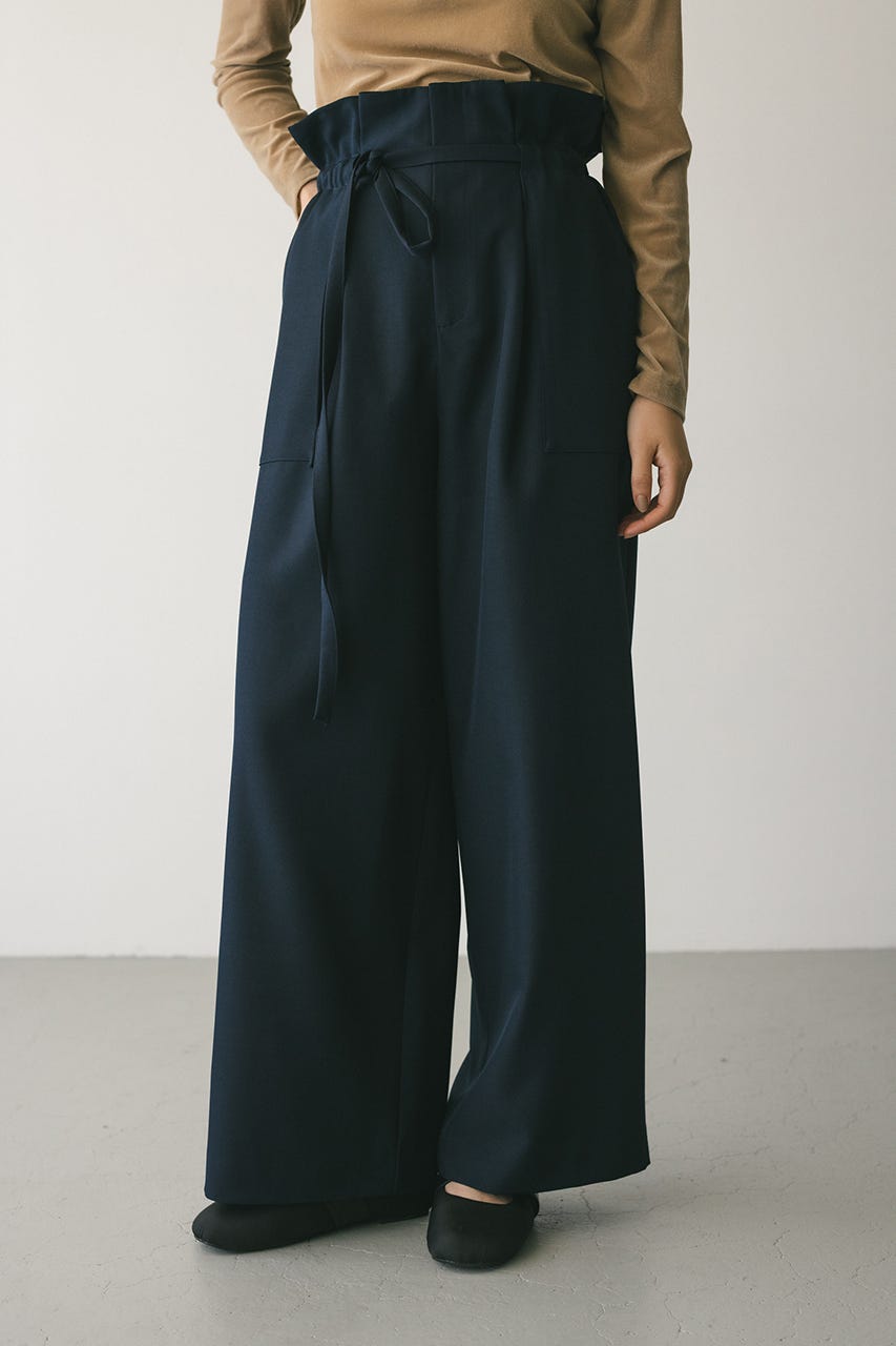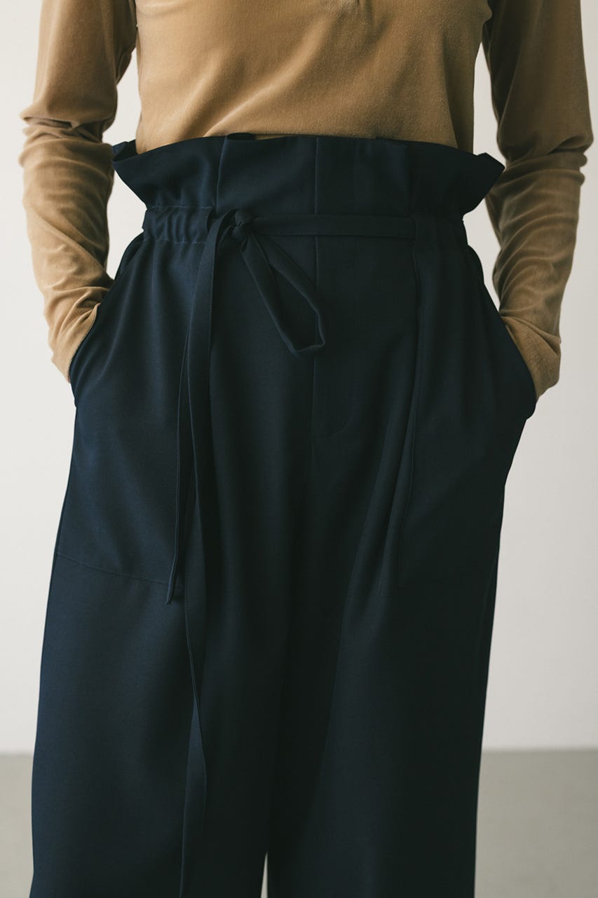 共地の紐ベルト付きで、ウエストをしっかり締めてハイウエストでの着用も可能です。