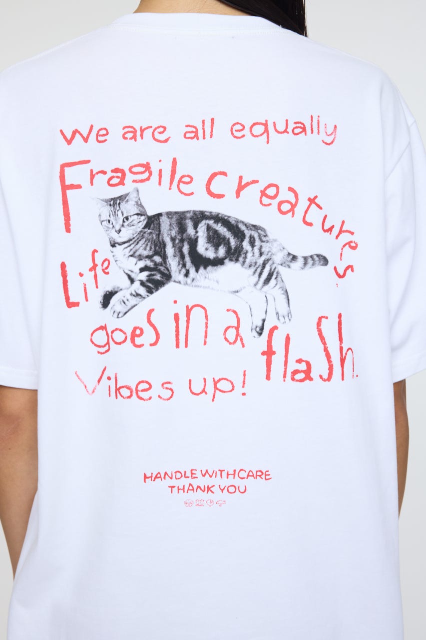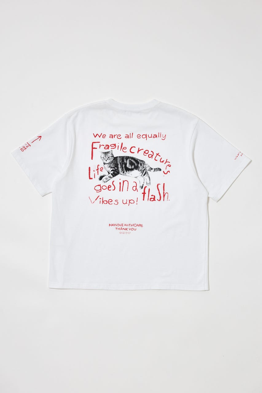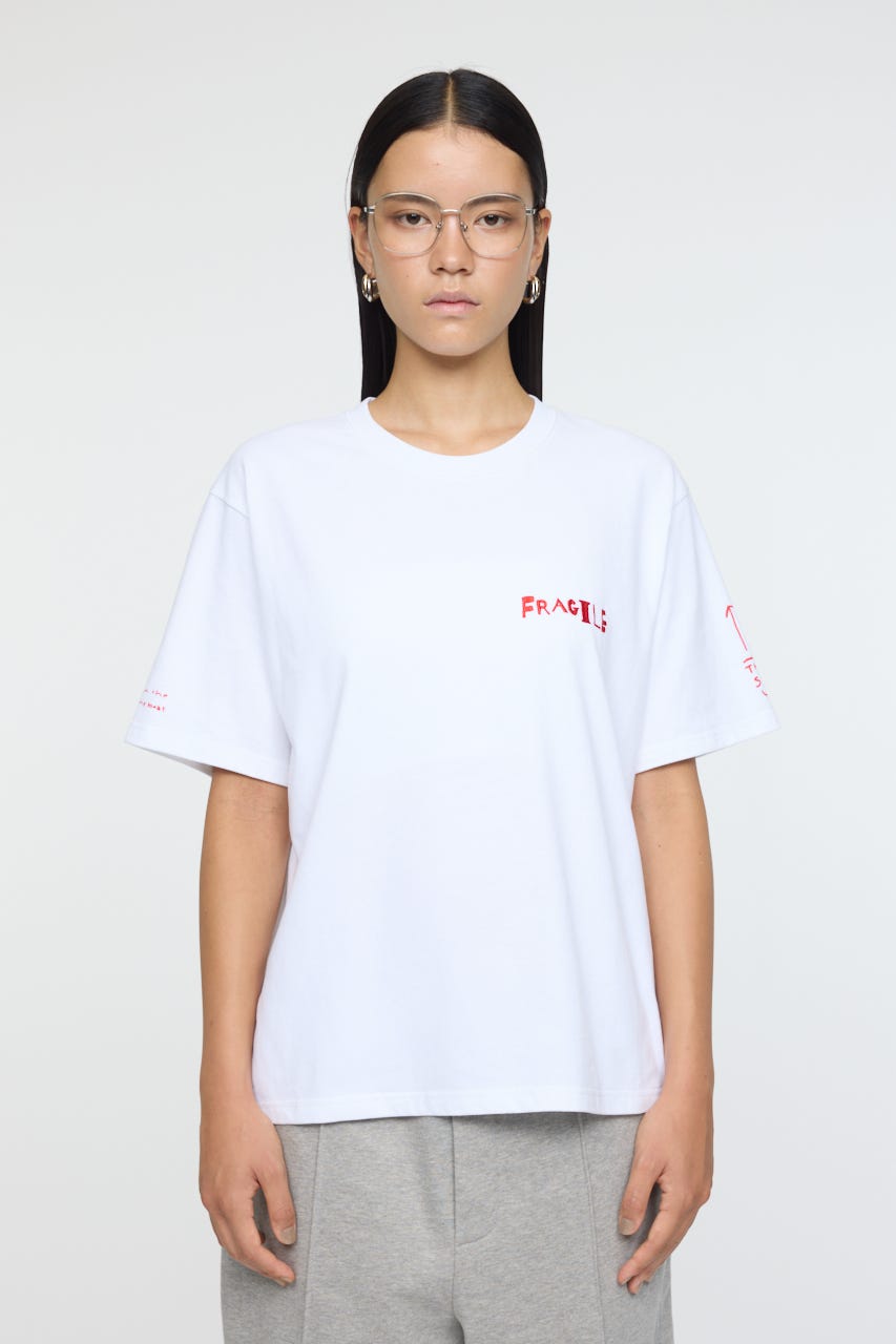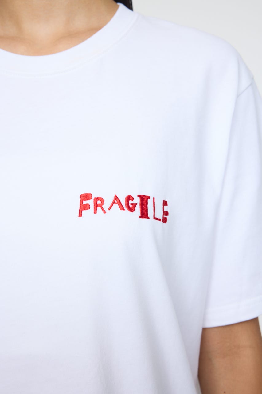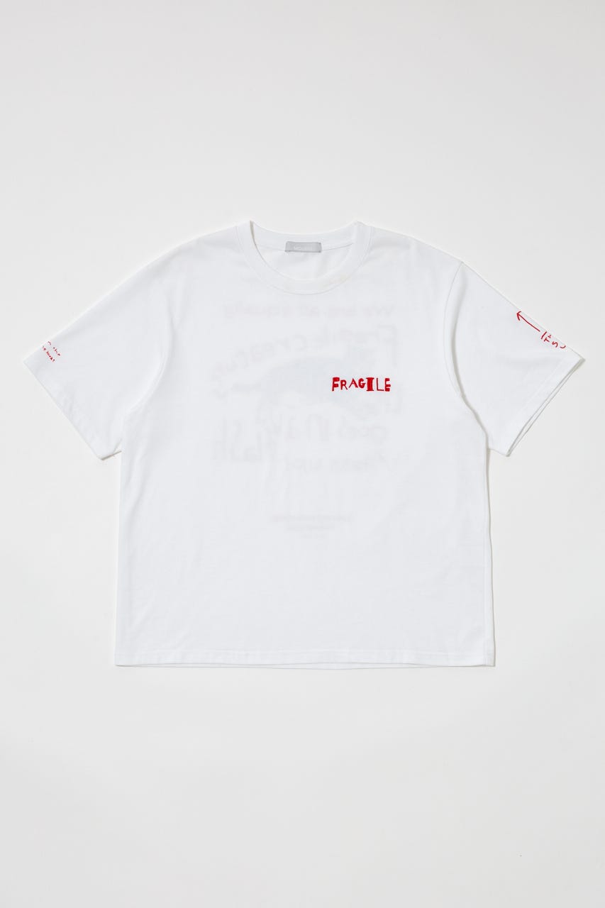 ユニセックスなサイズ感のTシャツに、FRAGILE氏による描き下ろしアートを、フロントの左胸にはさりげなく、