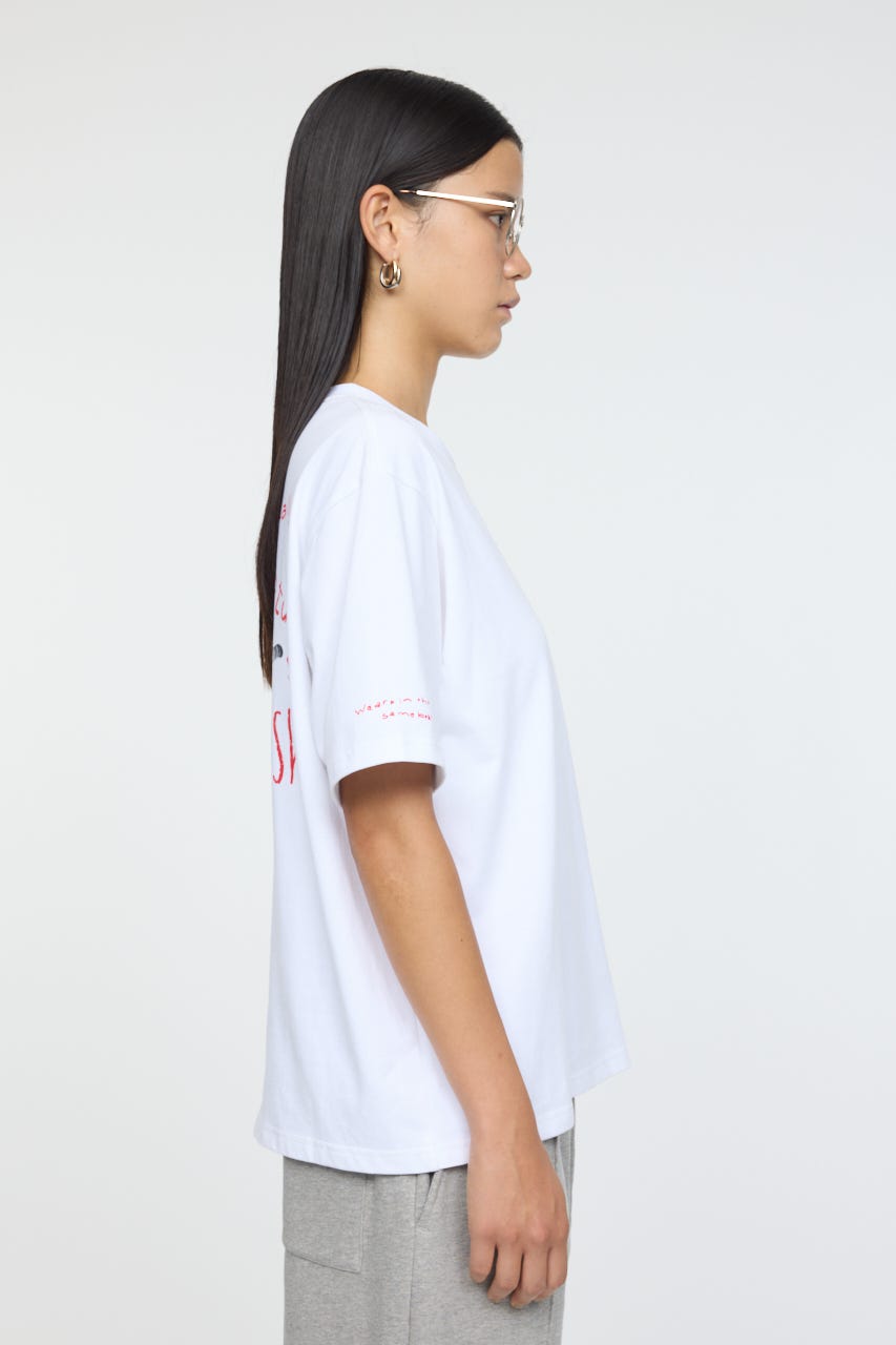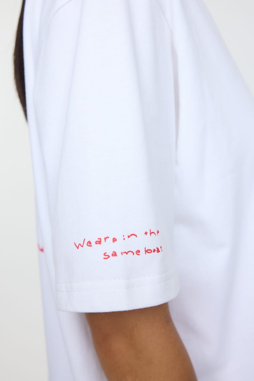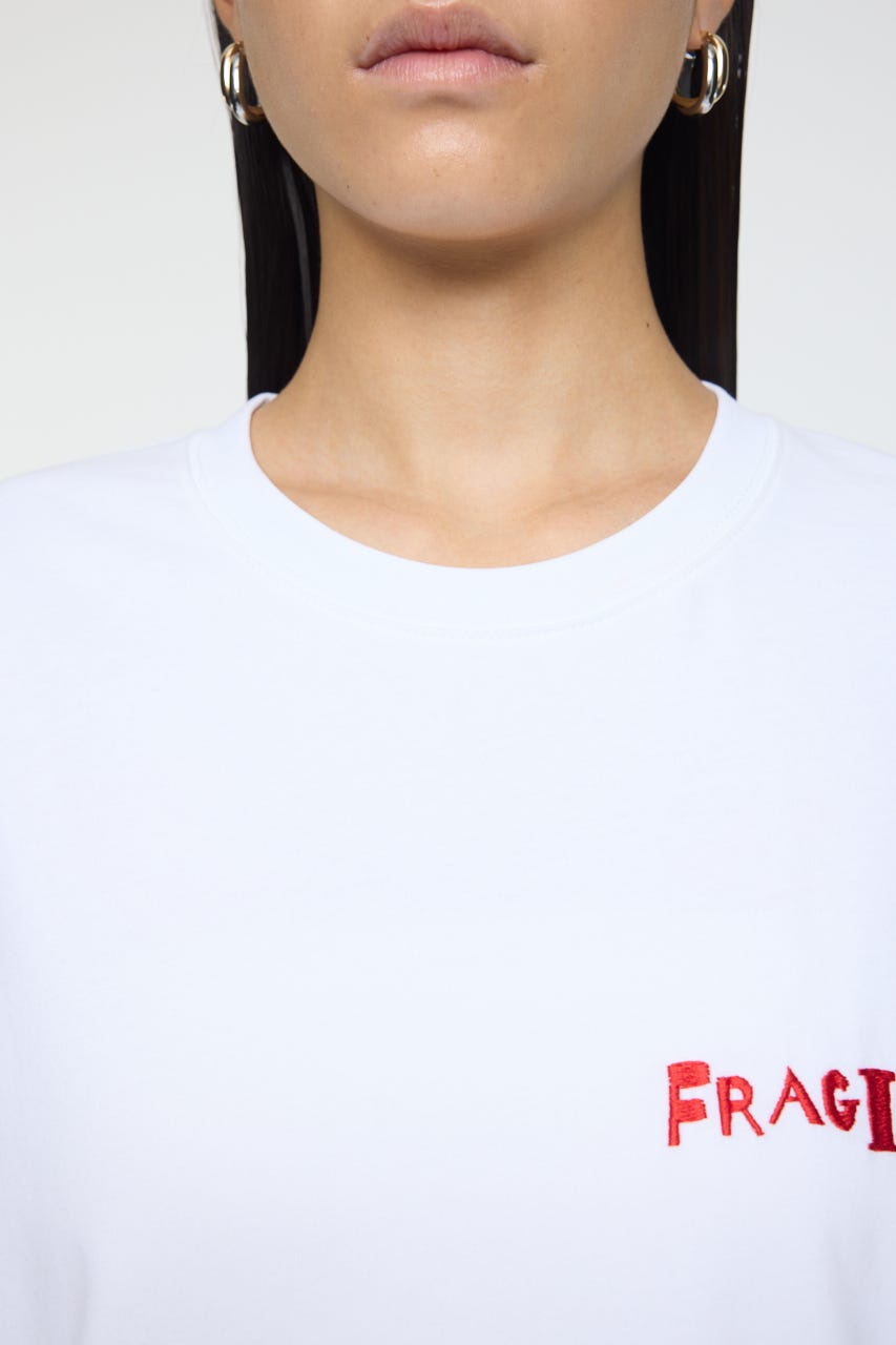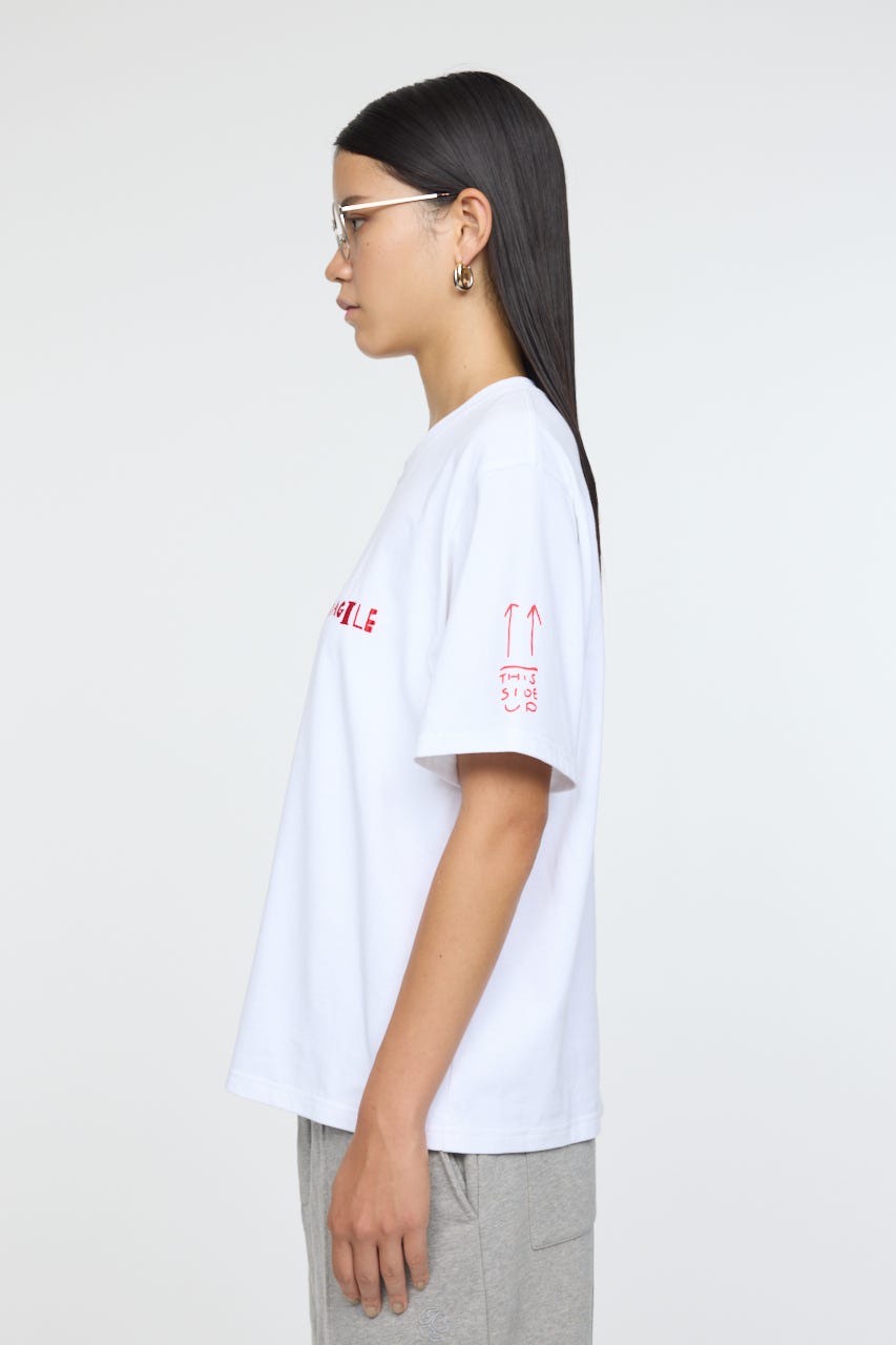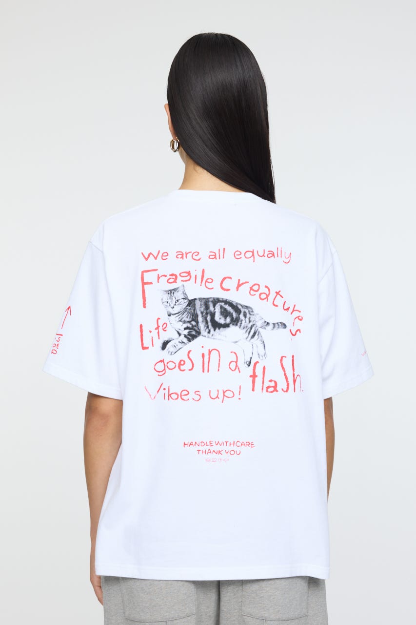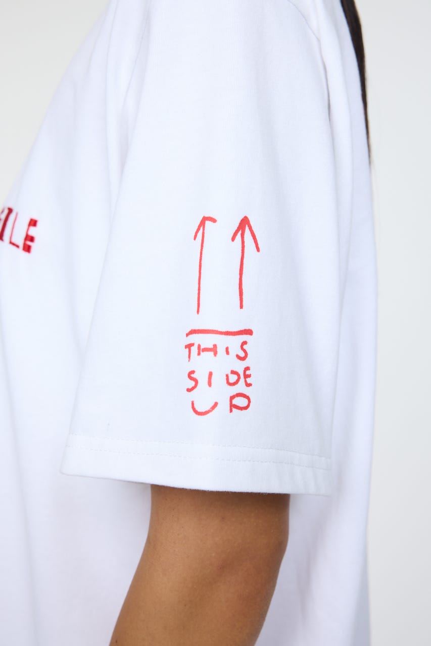 ユニセックスなサイズ感のTシャツに、FRAGILE氏による描き下ろしアートを、フロントの左胸にはさりげなく、