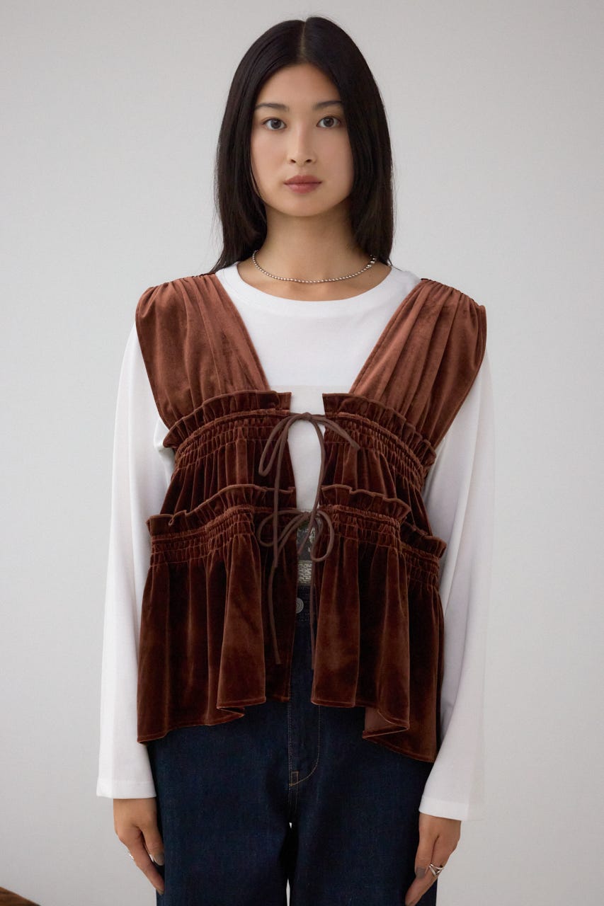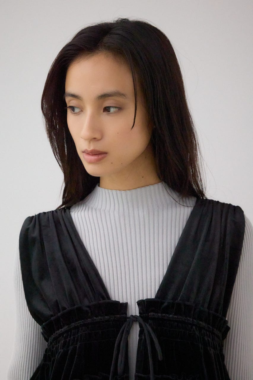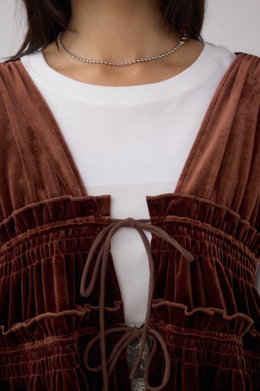 フロントのリボンデザインが今っぽく、Vネックがデコルテを美しく引き立てます。