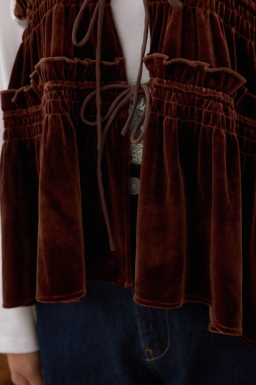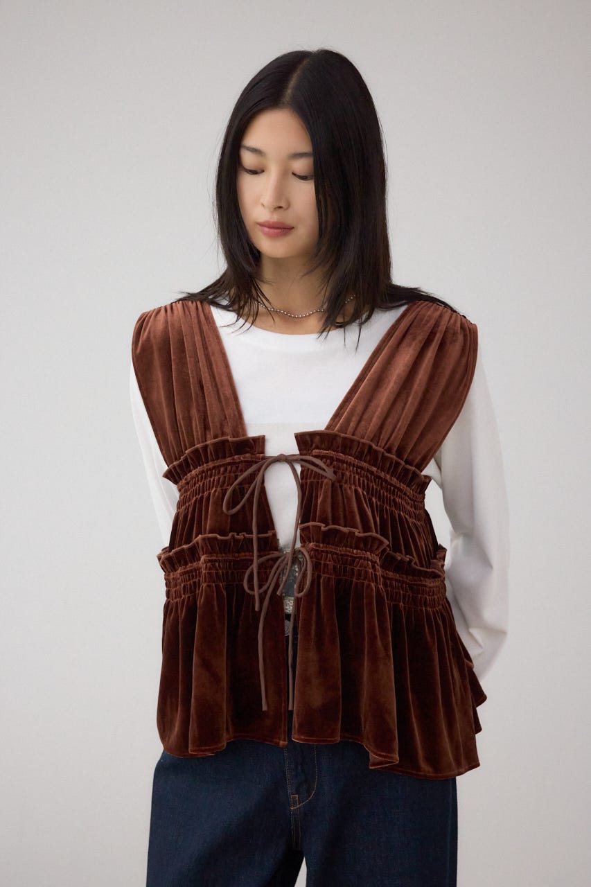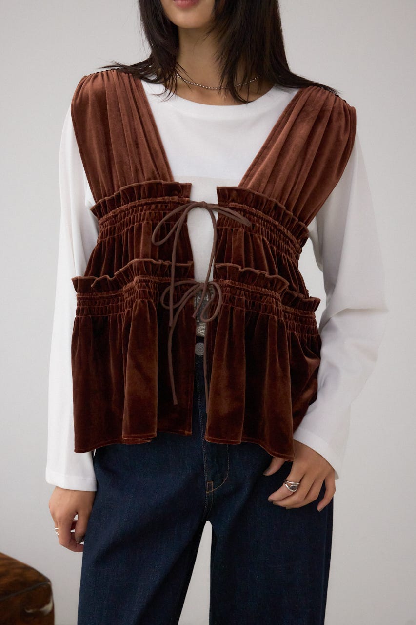 フロントのリボンデザインが今っぽく、Vネックがデコルテを美しく引き立てます。