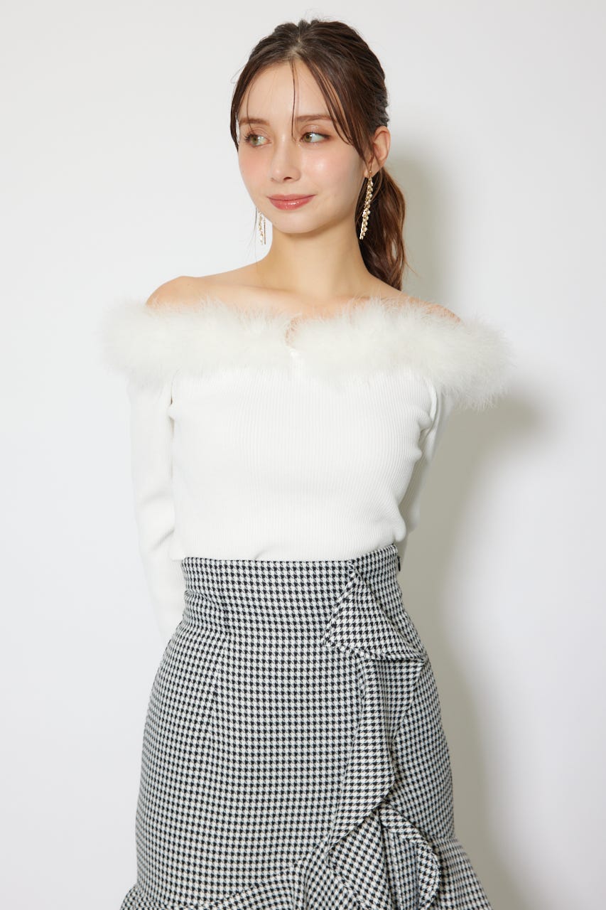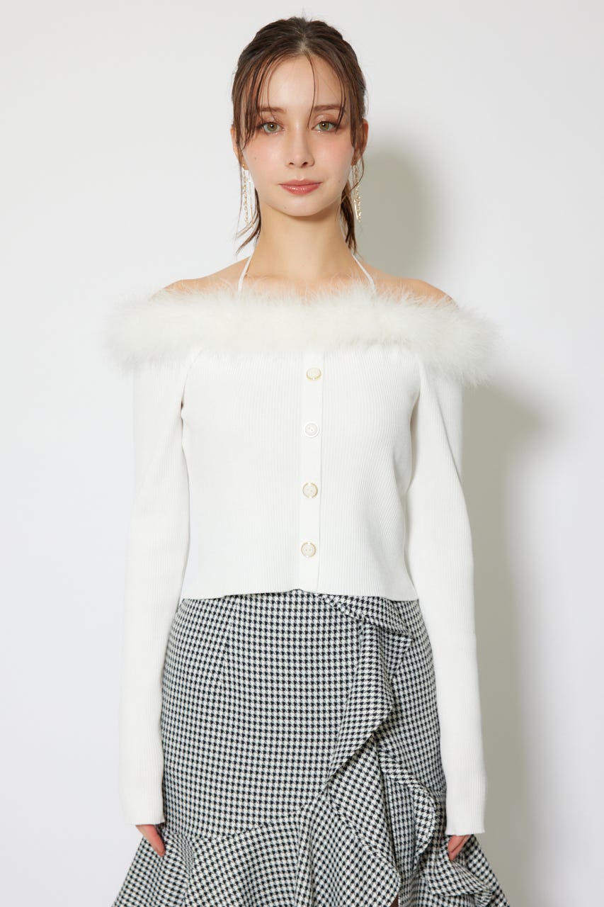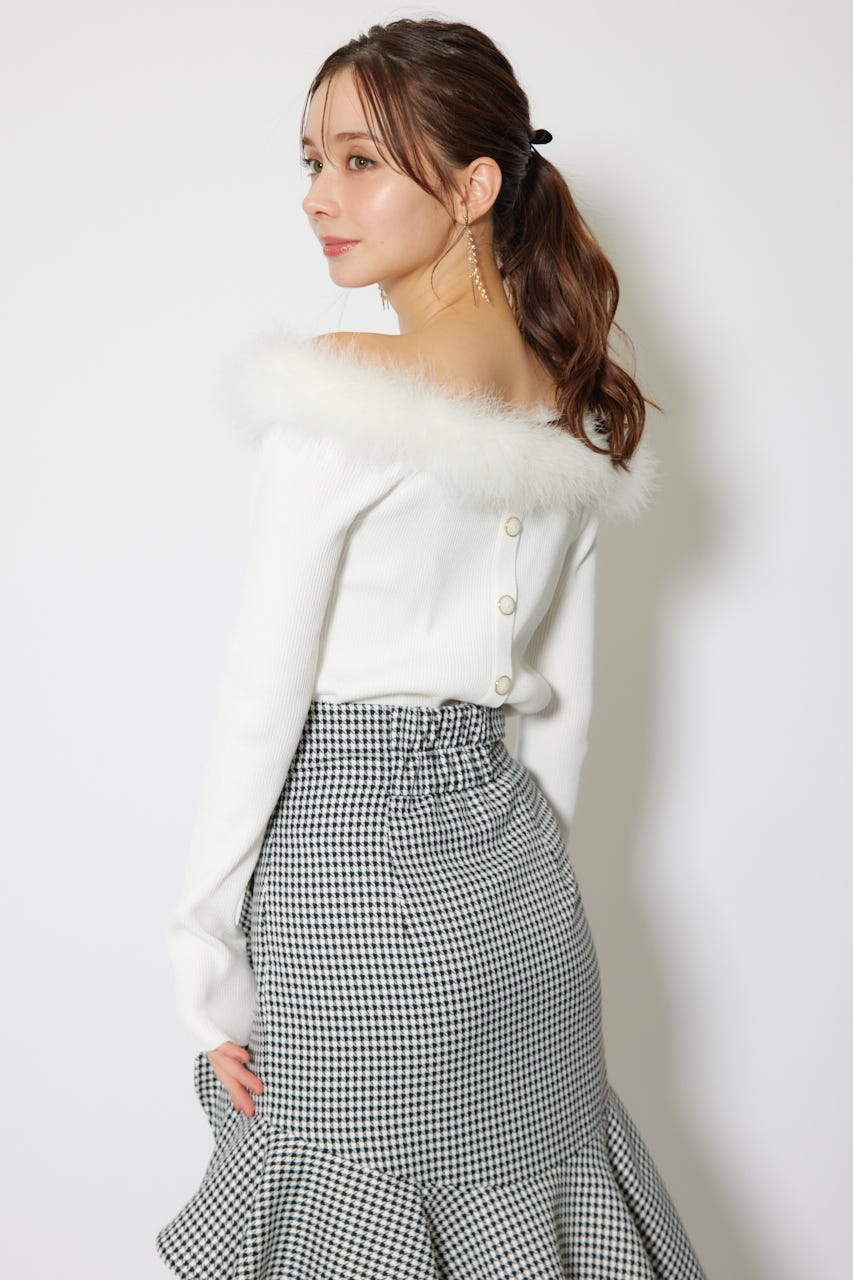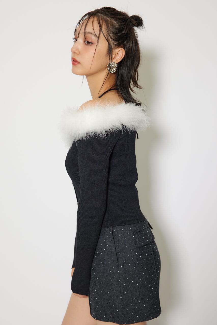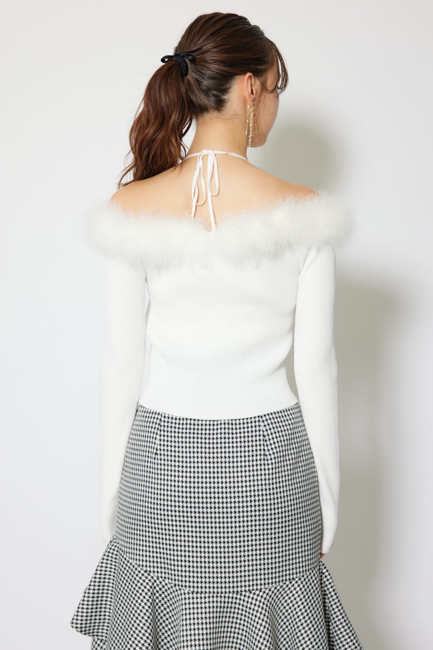 【ふわふわと上品なフェザーファーデザインがトレンドライクなオフショルニットプルオーバー】