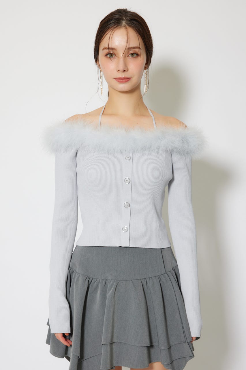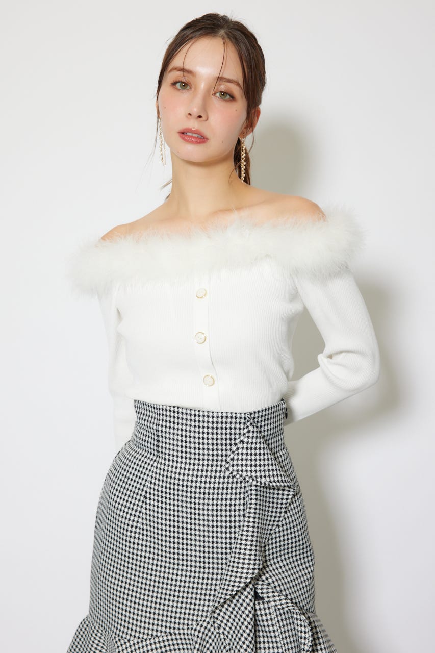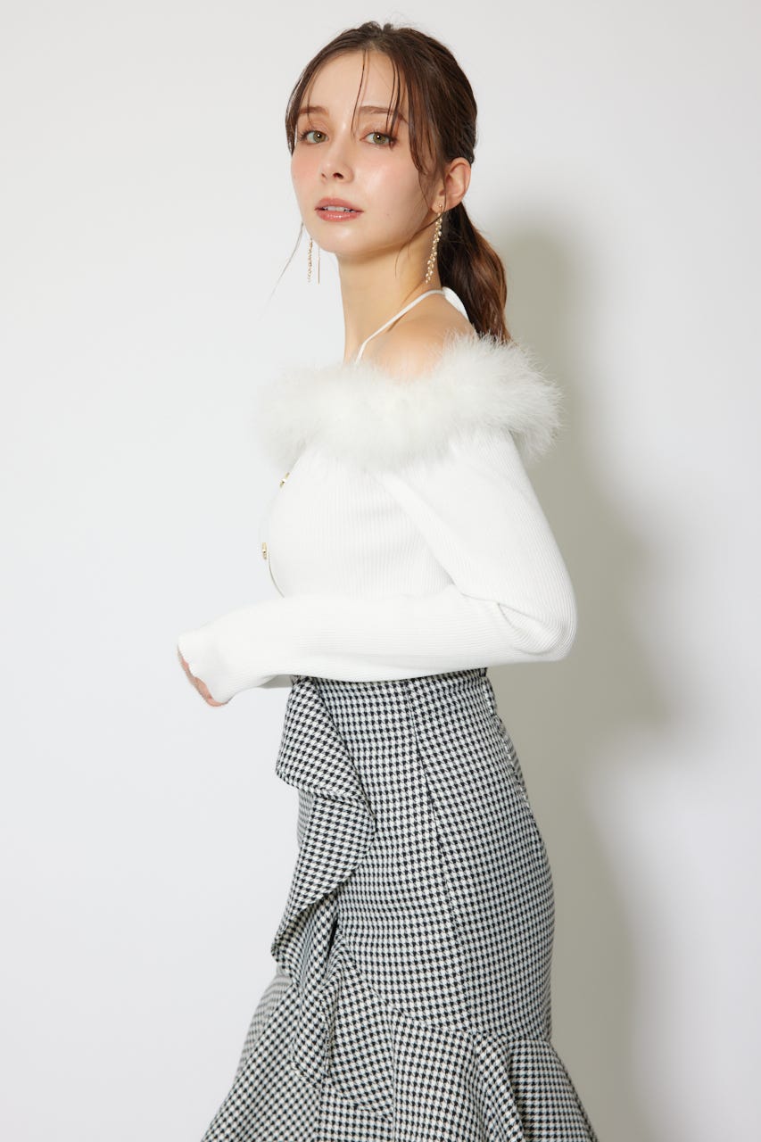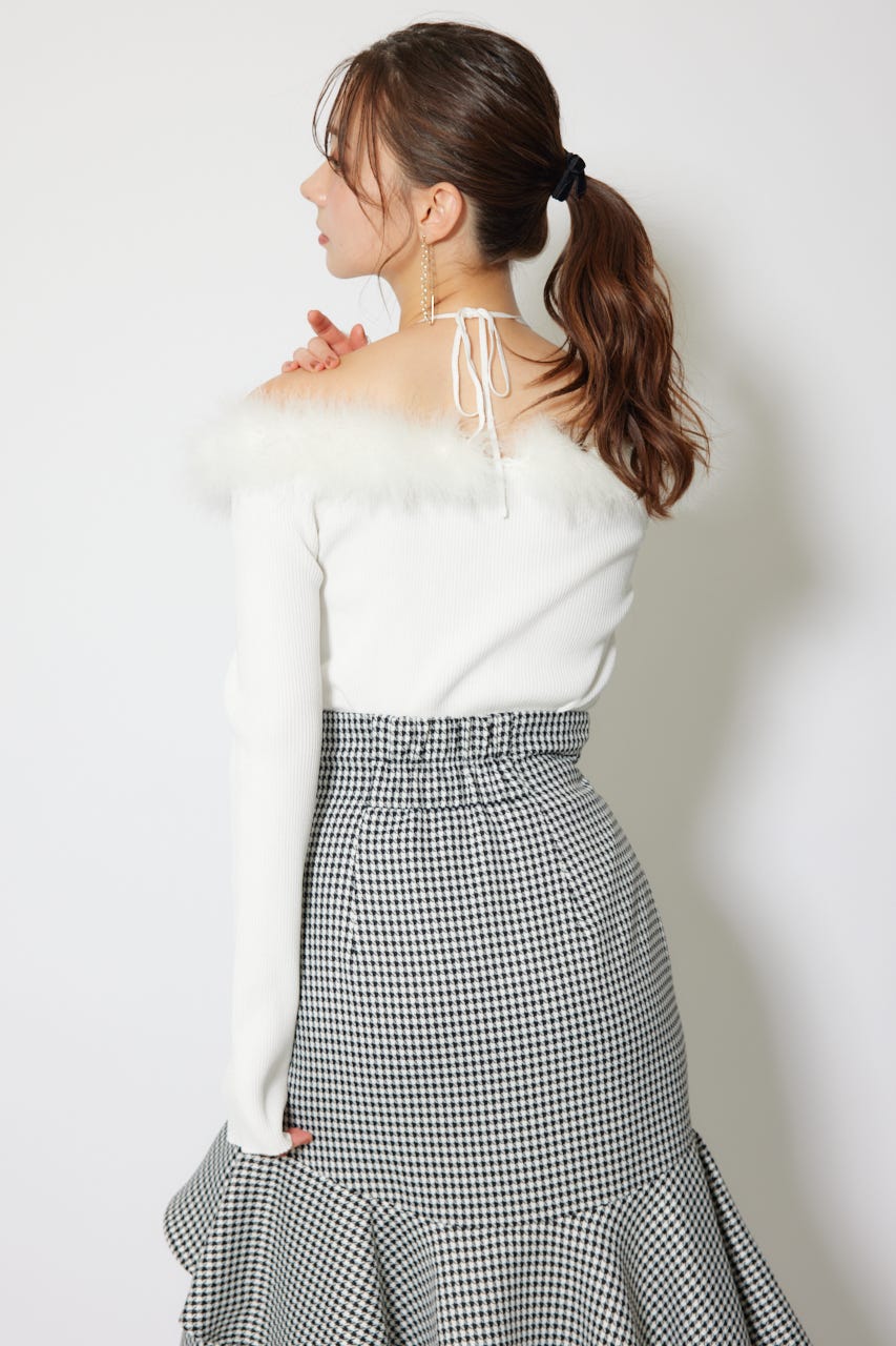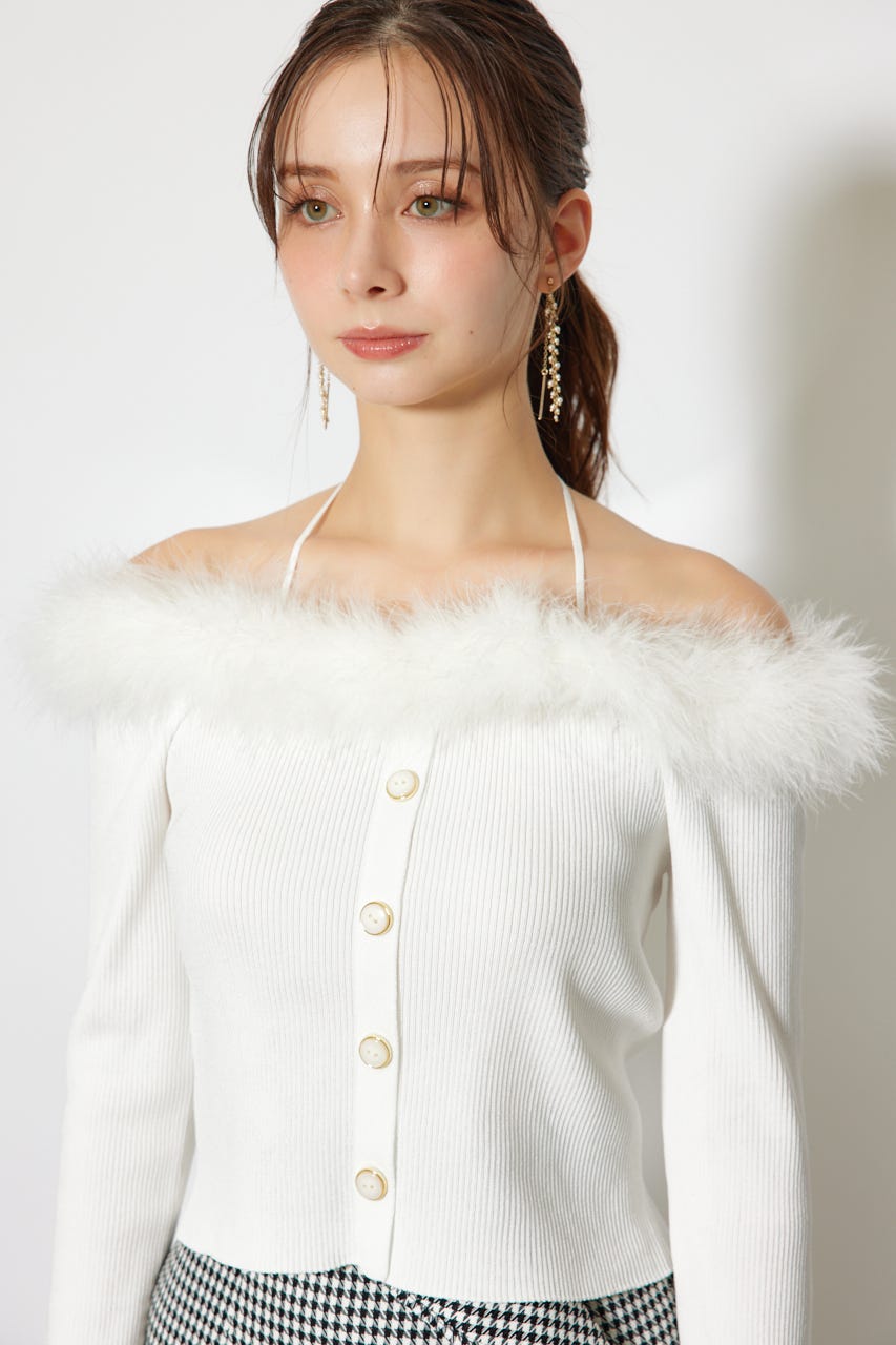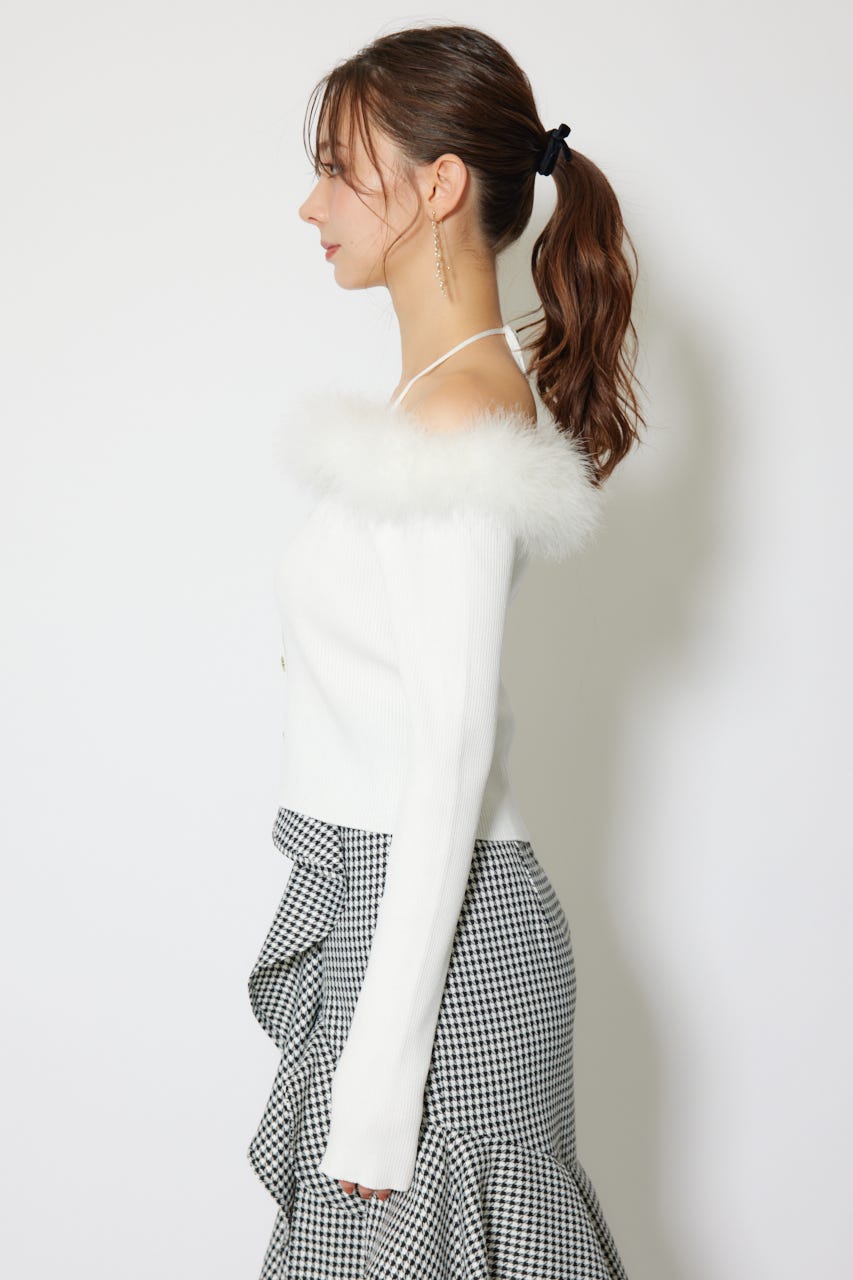 【ふわふわと上品なフェザーファーデザインがトレンドライクなオフショルニットプルオーバー】