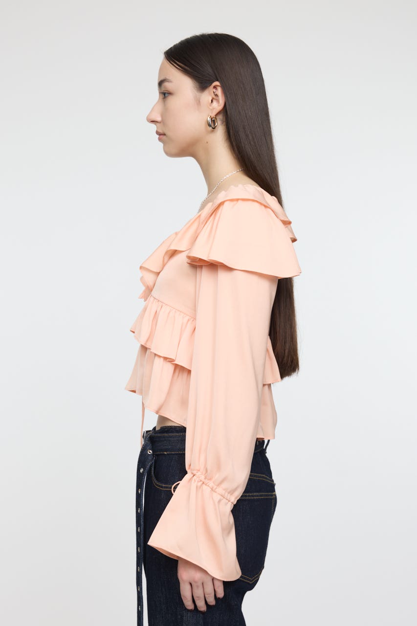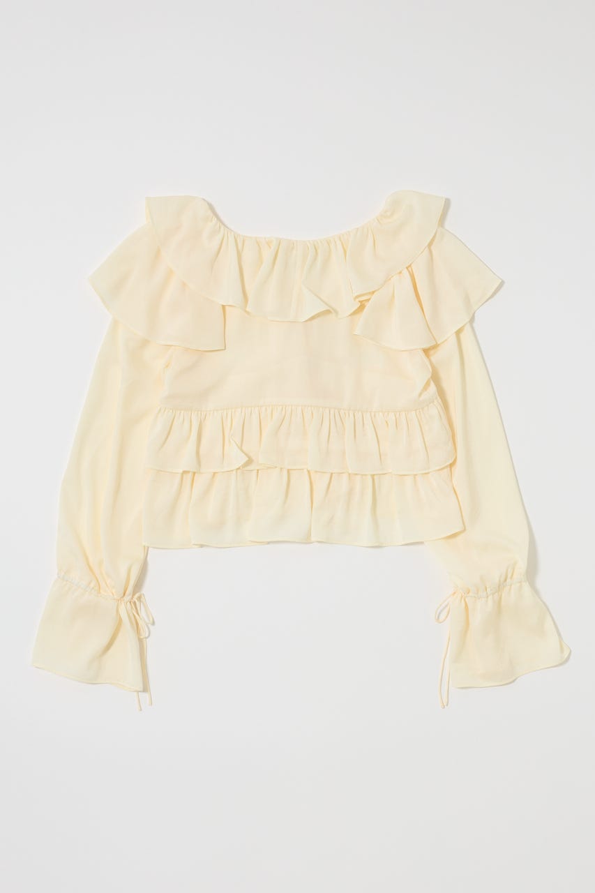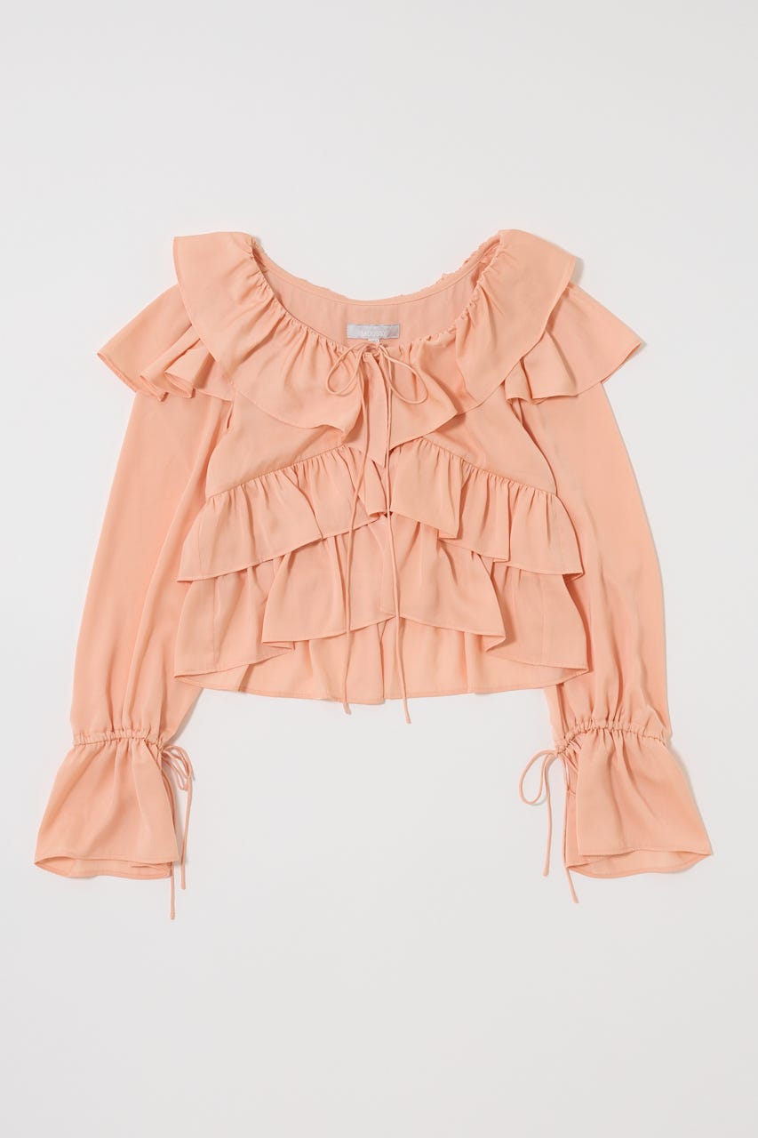 身頃や袖にフリルを取り入れた華やかさのある1枚。